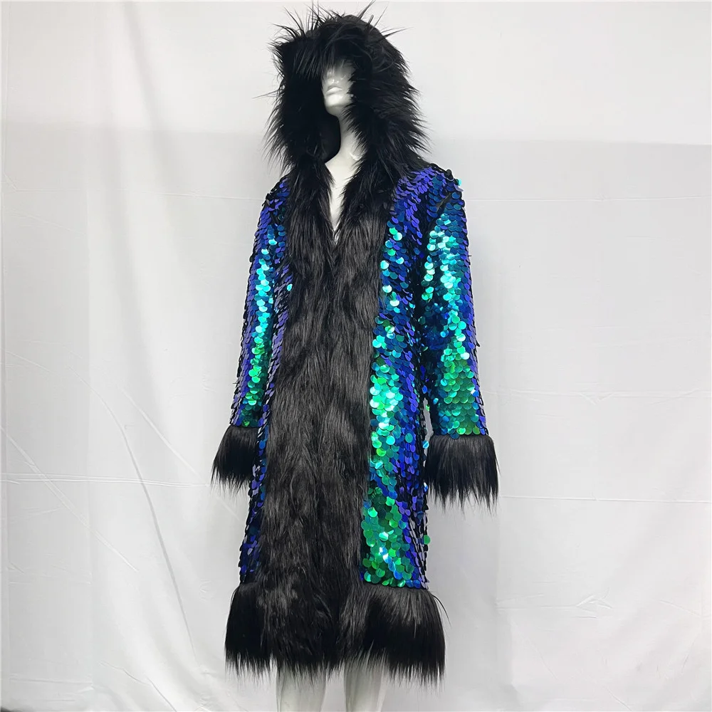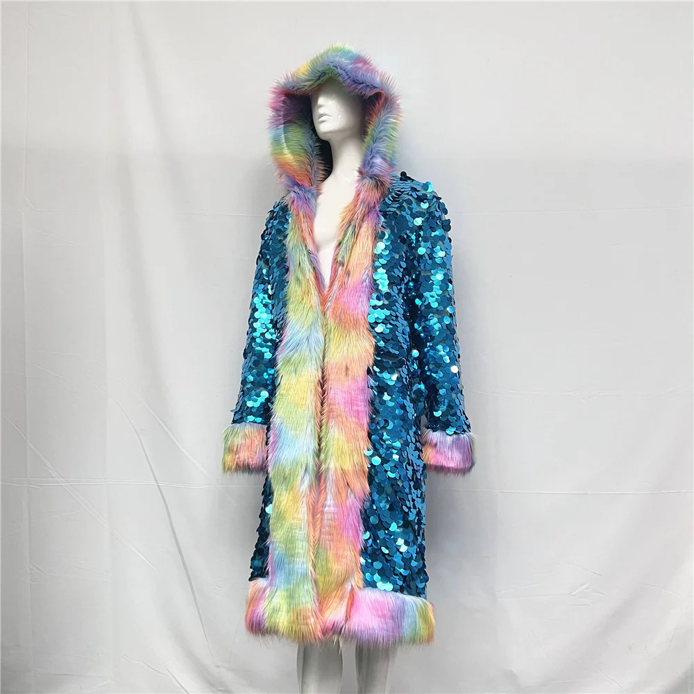 Women Casual Canvas Fuzzy Shiny Sequins Rainbow Faux Fur Coat Stage Party Hot Pink Winter Long Hooded Patchwork Color Blocking