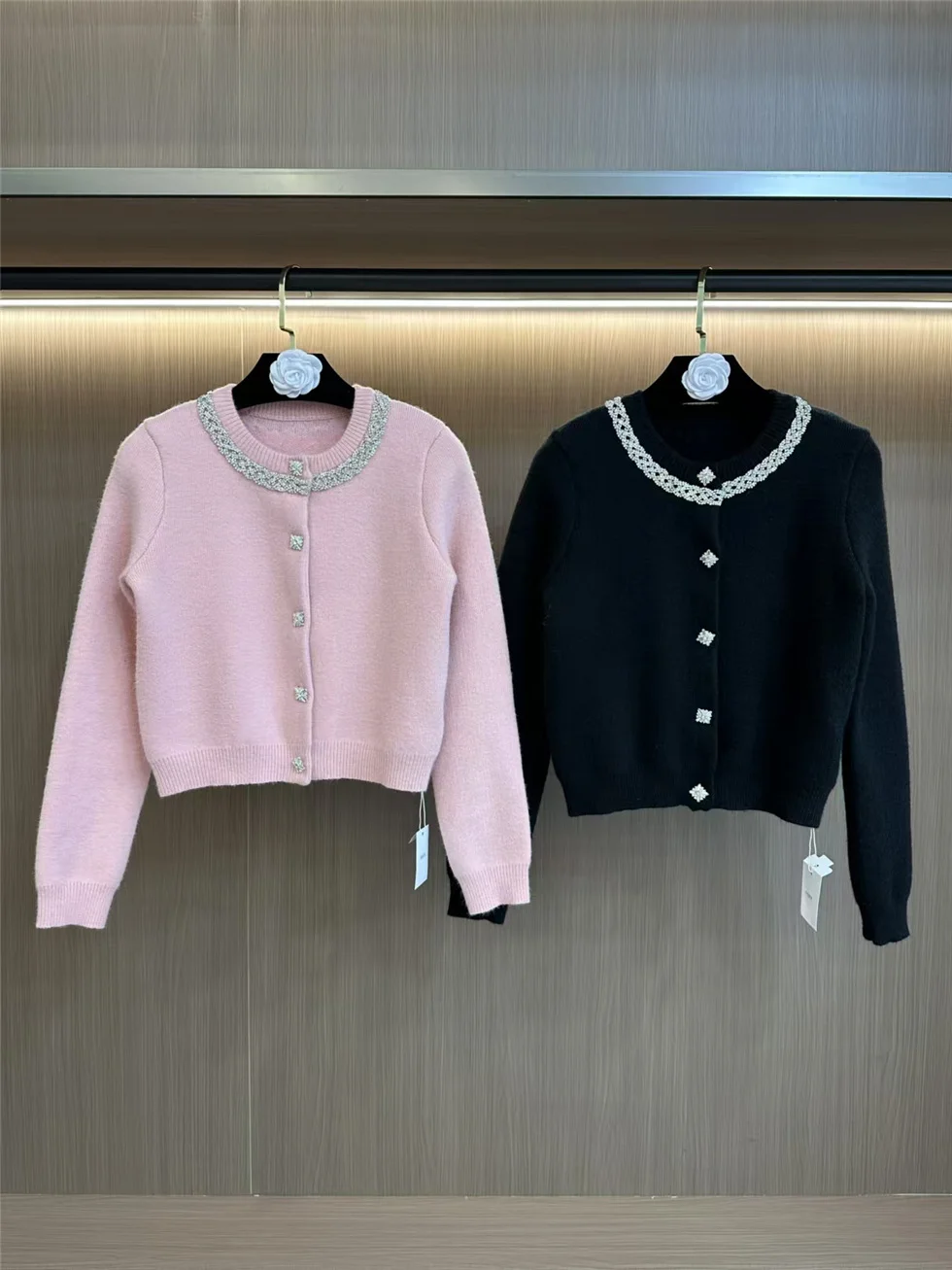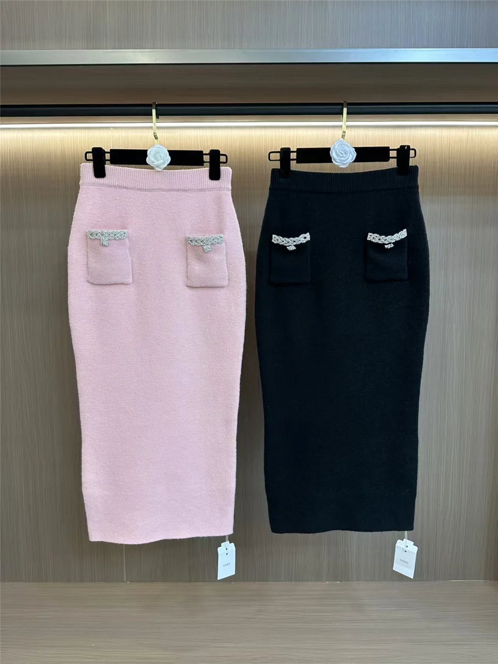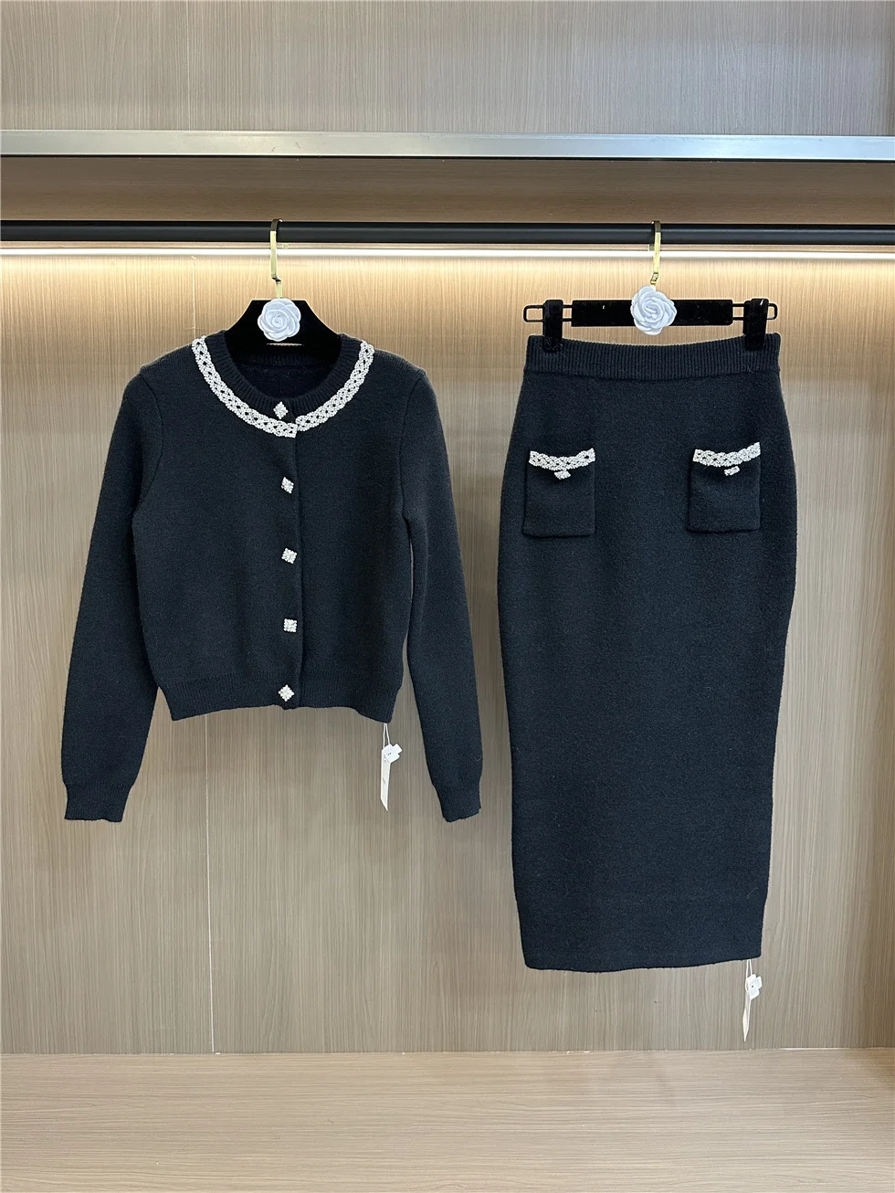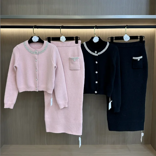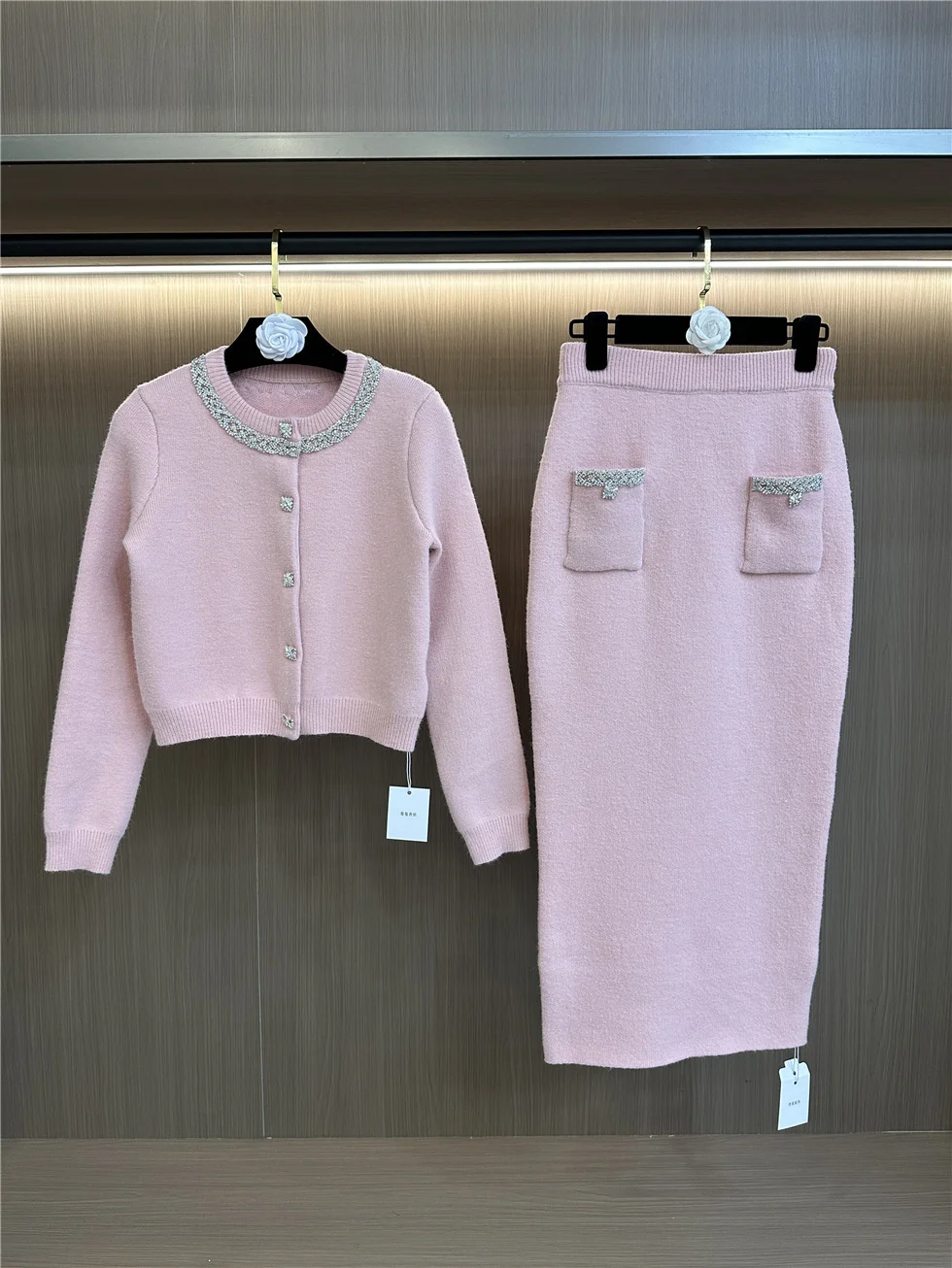 SR2451 Kimshein Spring Autumn New Fashion O Neck Heavy Crystal Beading Knitting Jacket Skirt Two Piece Set