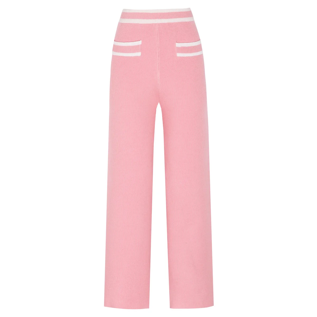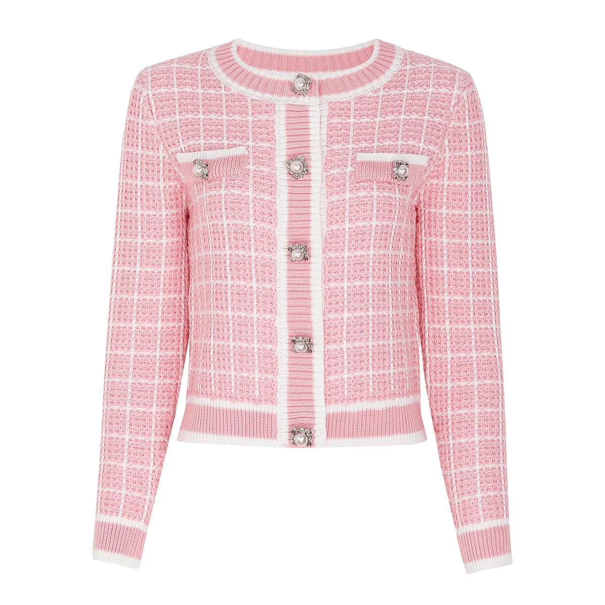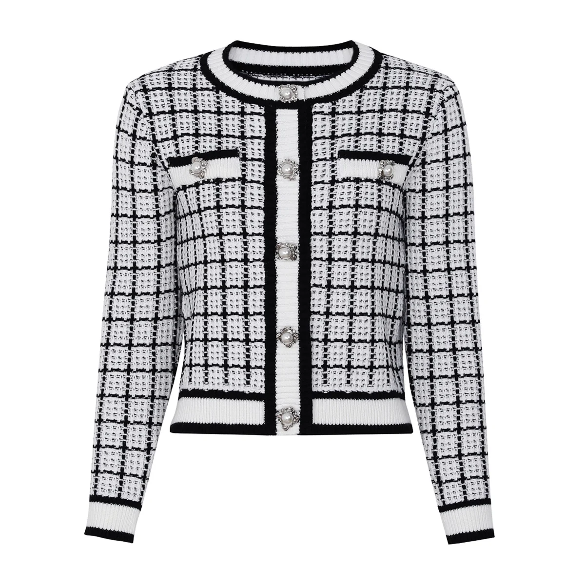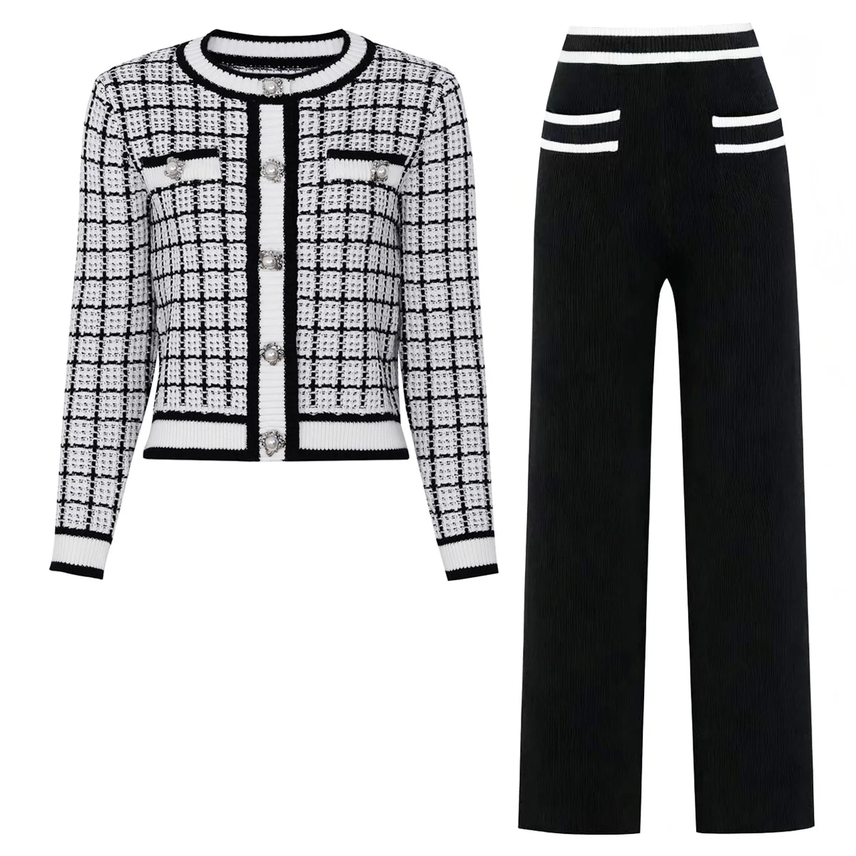 SR2483 High Quality Office Suit Round Neck Long Sleeve Elegant Plaid Single-breasted Knitted Ladies Two Piece Casual Women's Set