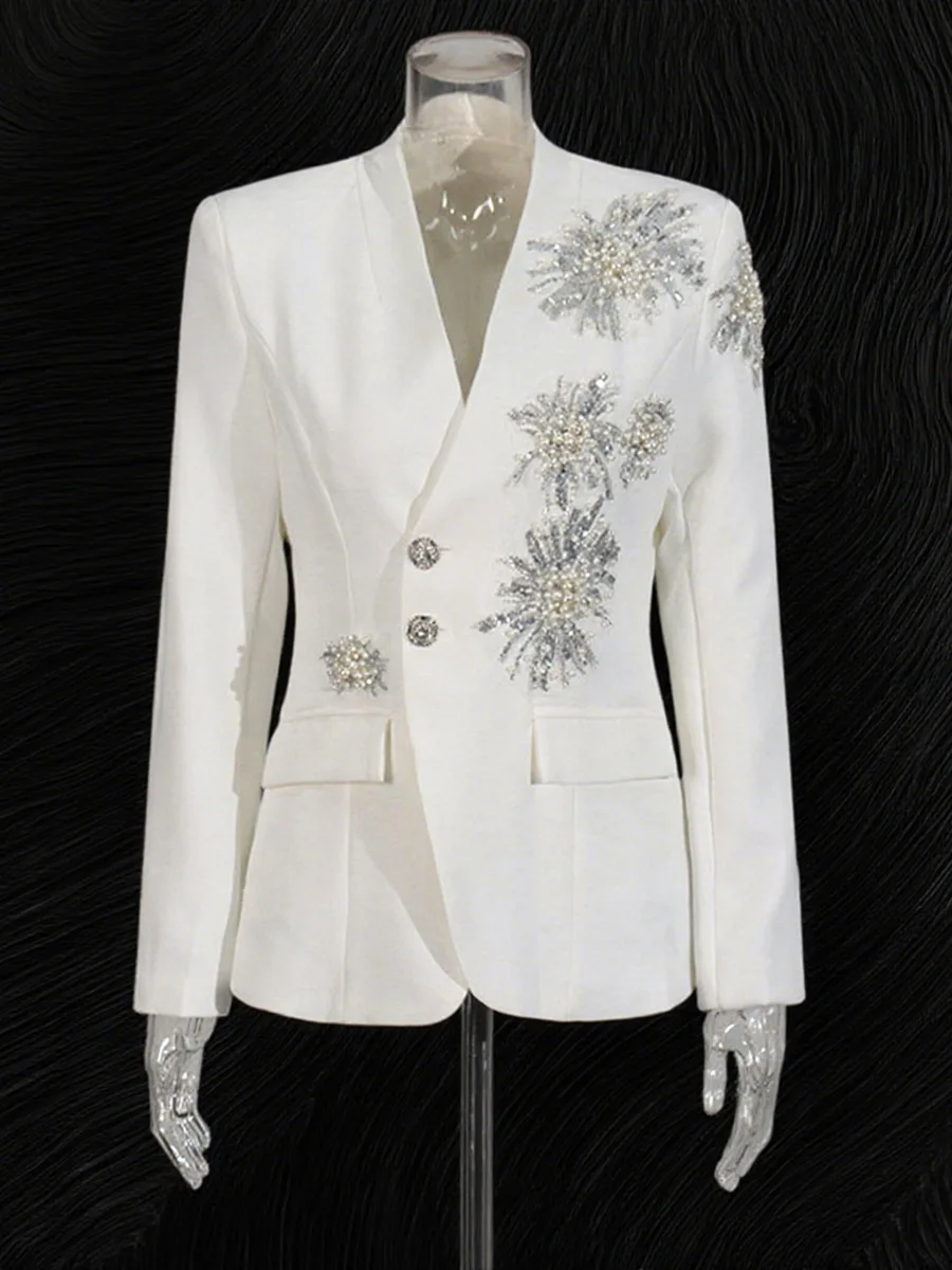 Luxury V-neck Single Breasted Solid Woven Heavy-duty Design with Diamond Decoration Women's Suit Jacket Blazer Fashionbisou