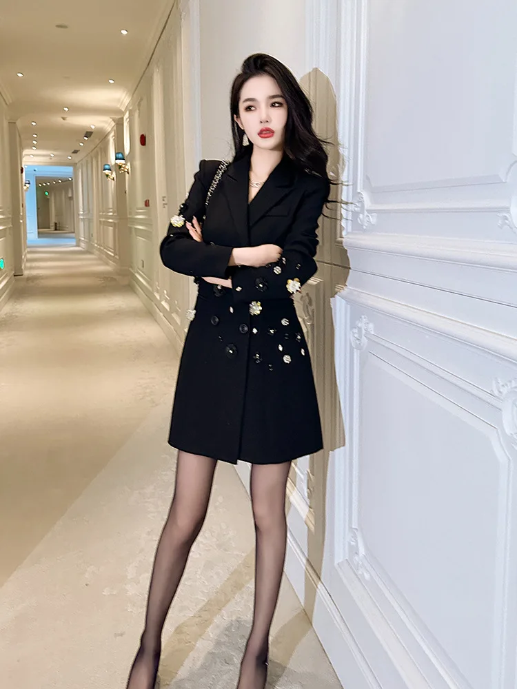 Fashion Double Breasted Office Ladies V-neck Blazer Mini Dress Diamond Decor Lapel Blazer Coat