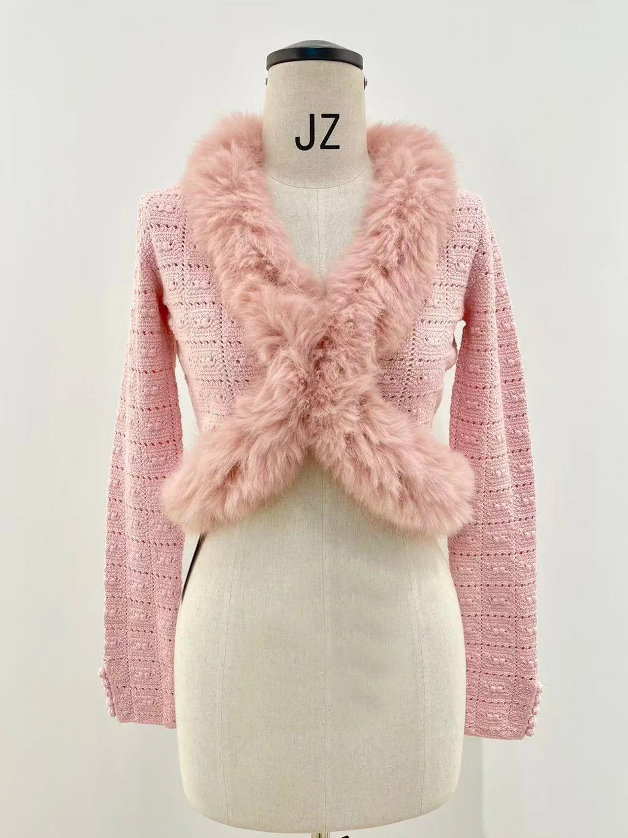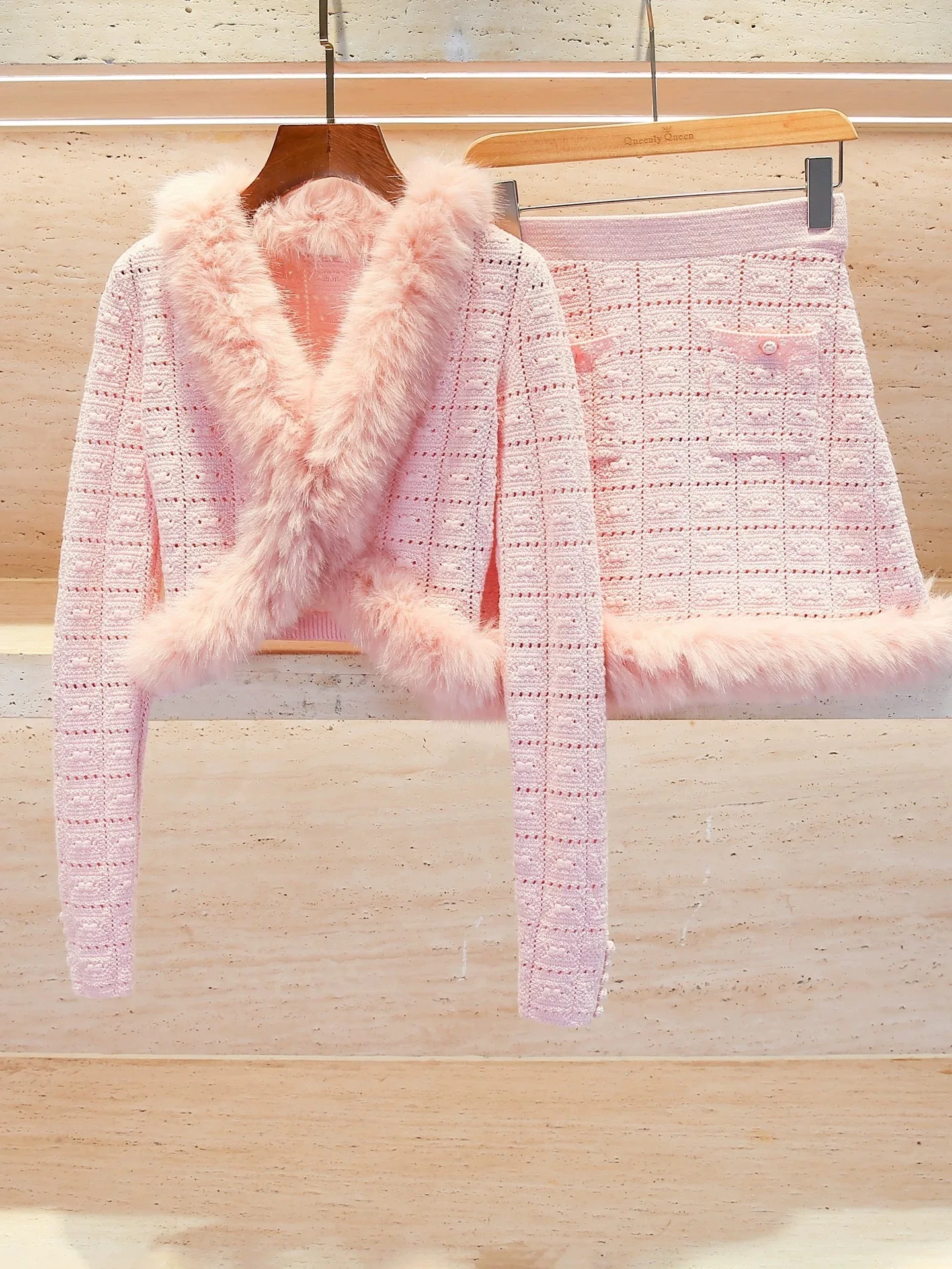 SR2481 High Quality Elegant Style Pink Feather Suit V-neck Long Sleeve Cardigan Mini Skirt Women Knit 2pcs