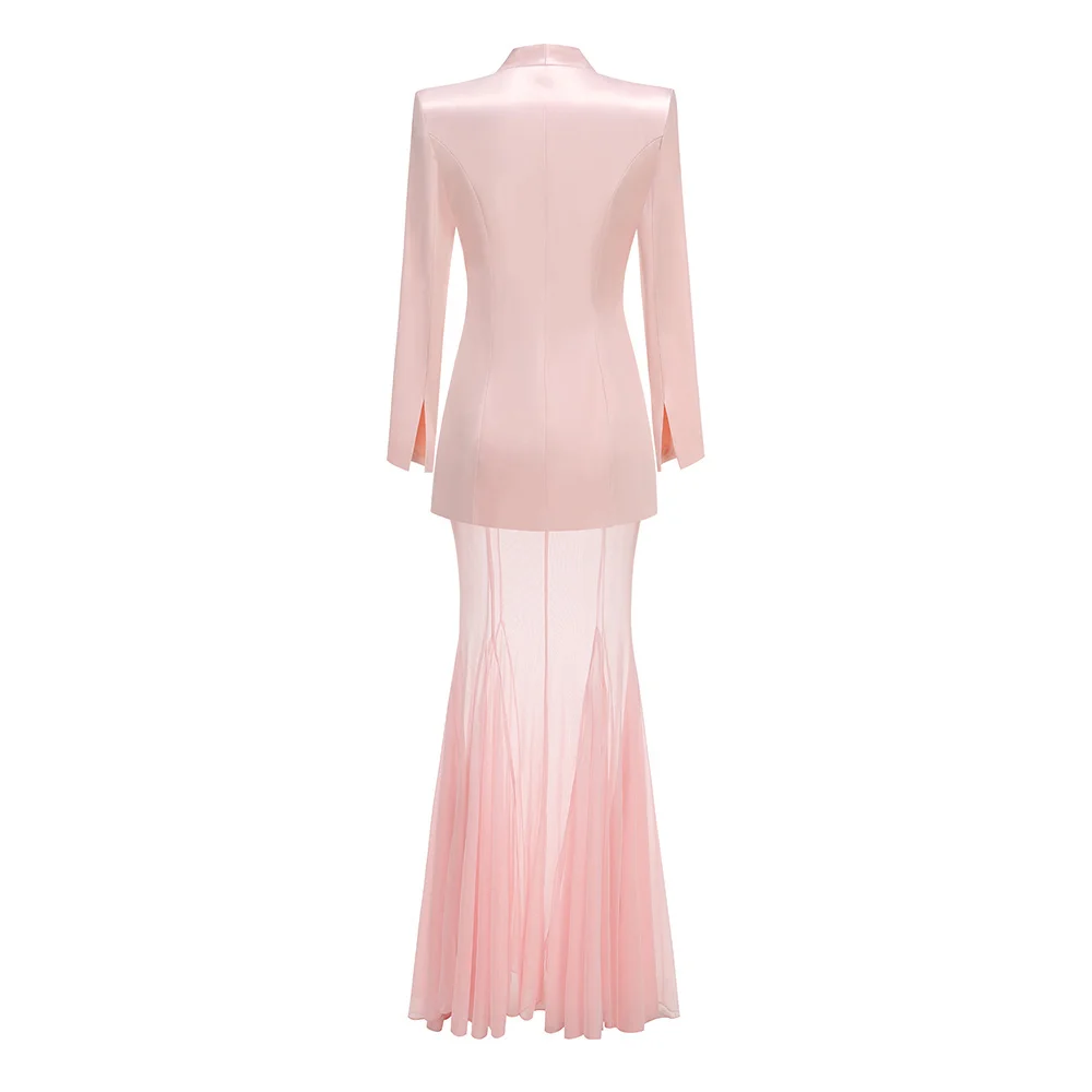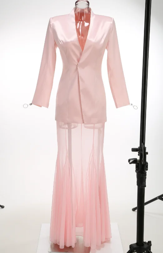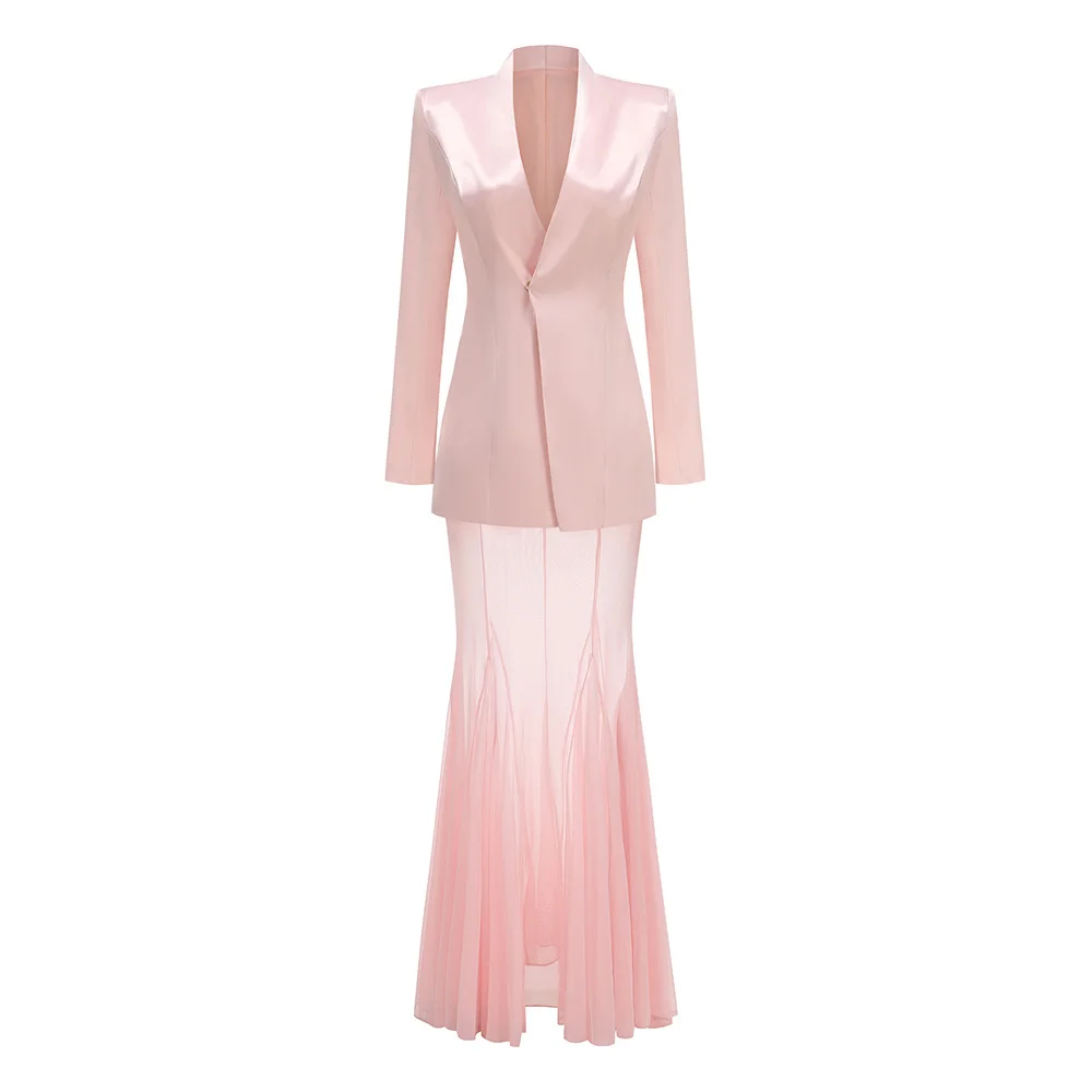 SR2479 High-quality Women's Pink V-Neck Satin Suit Mesh Fishtail Skirt Suit Slim Fit Dress Two-piece Suit