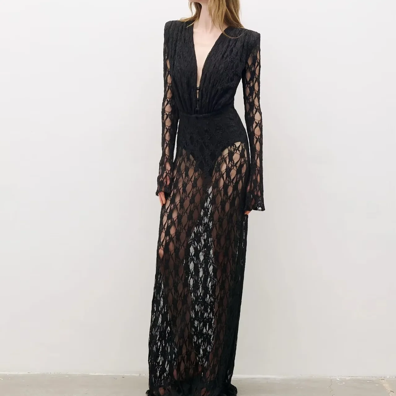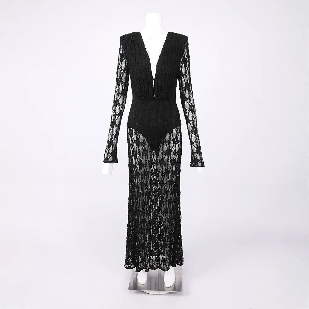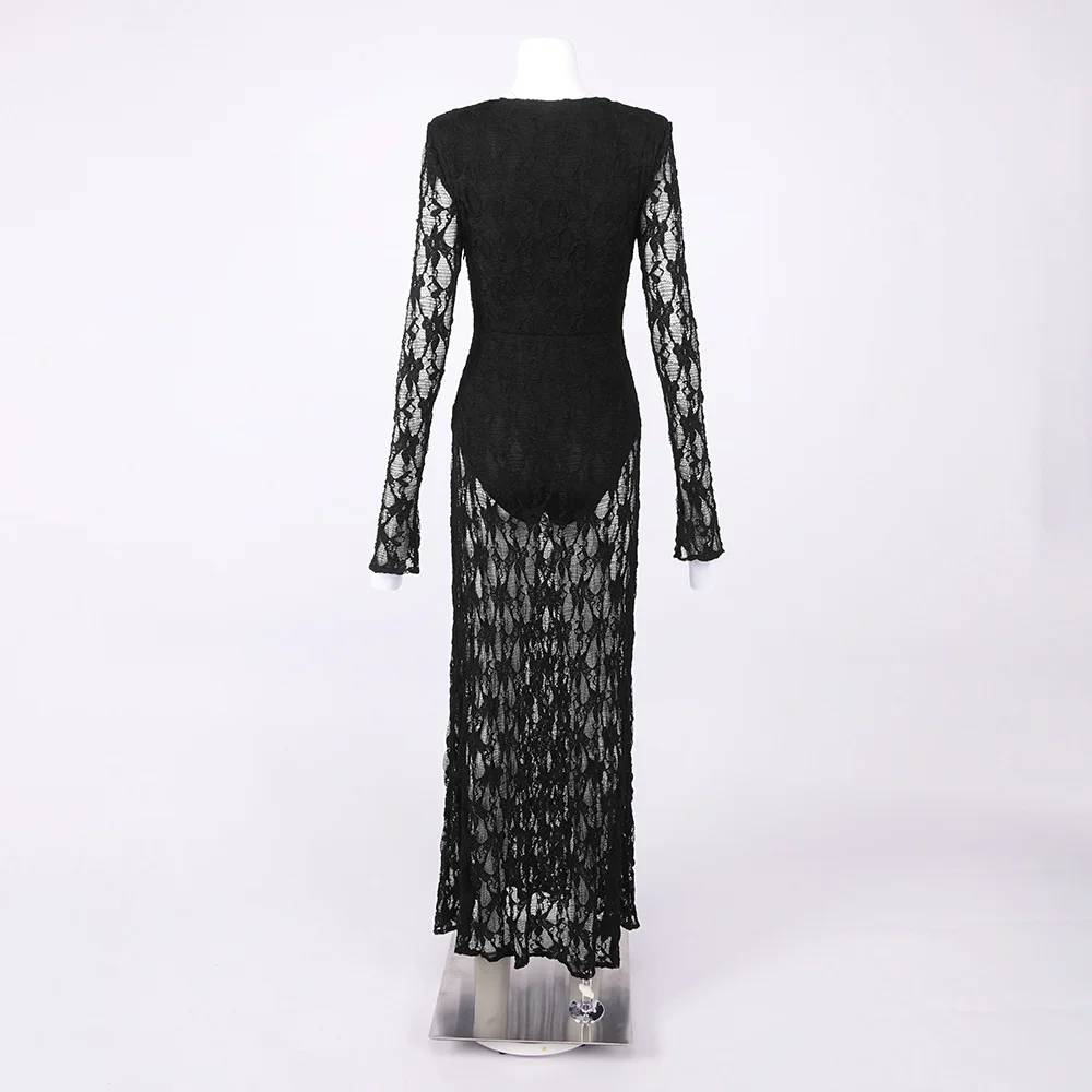 LS2764 New Fashion Lace V-neck Long Dress Retro Sexy Hollow Out See Through Long Sleeve Ladies Elegant Dress