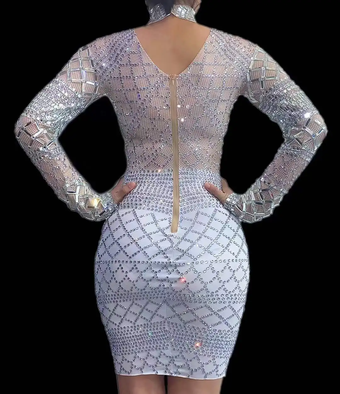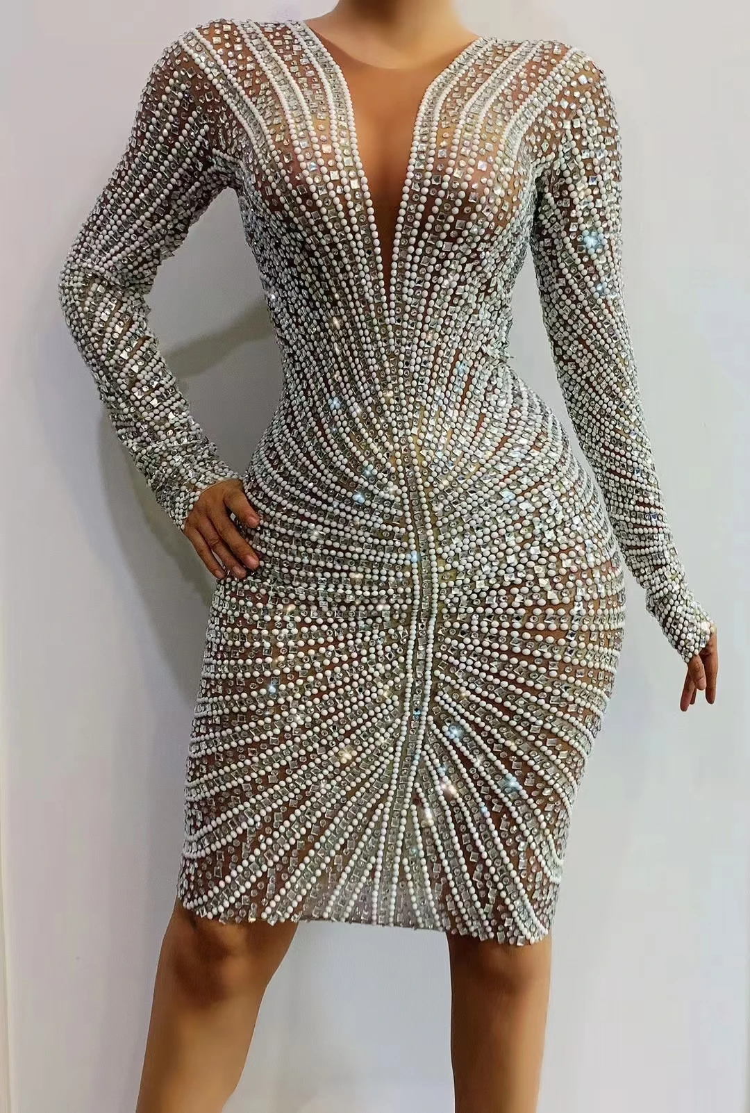 AD1293 Kimshein Women Clothes Long Sleeve Midi Transparent Rhinestone Bodycon Dress Vestidos De Fiesta Mujer