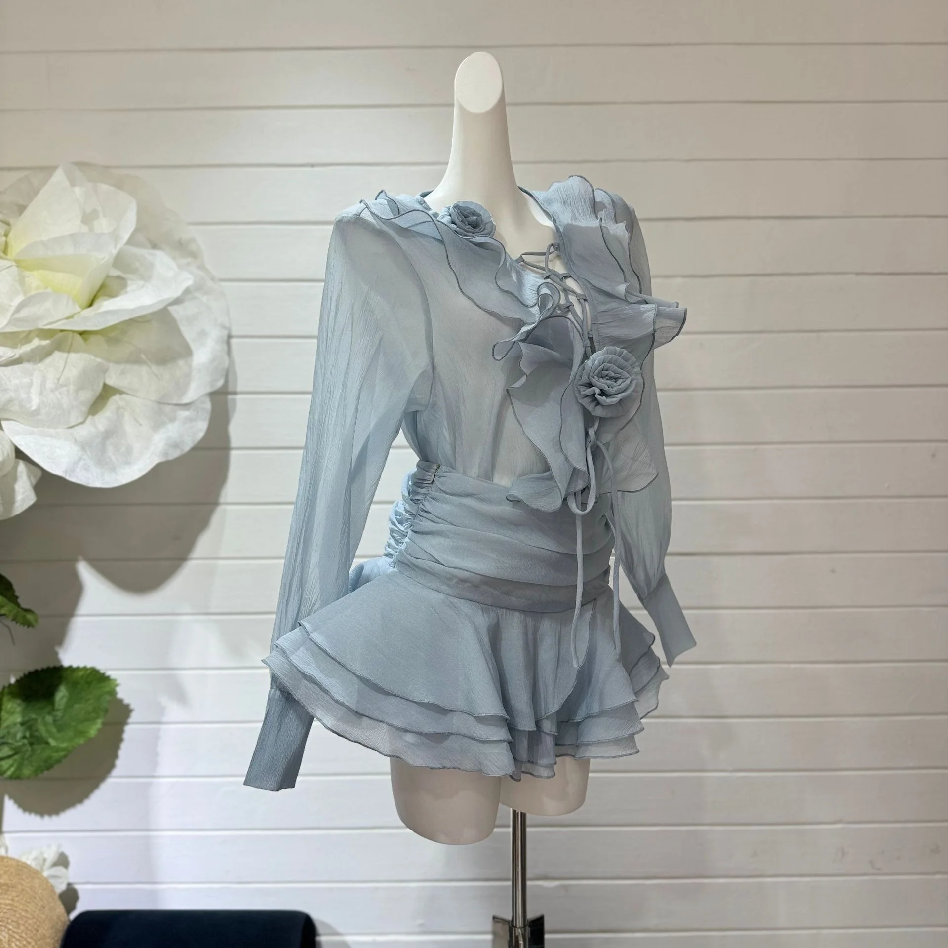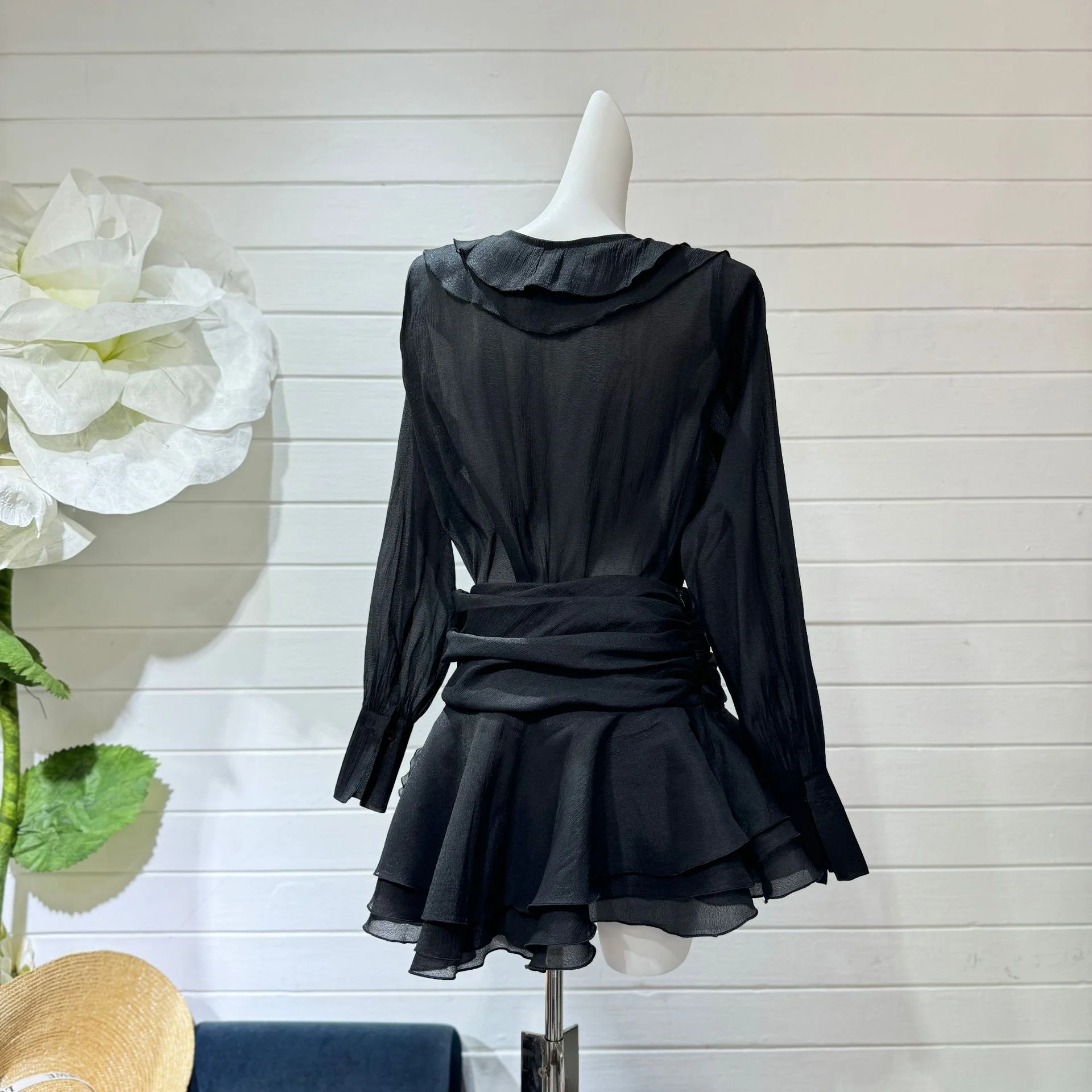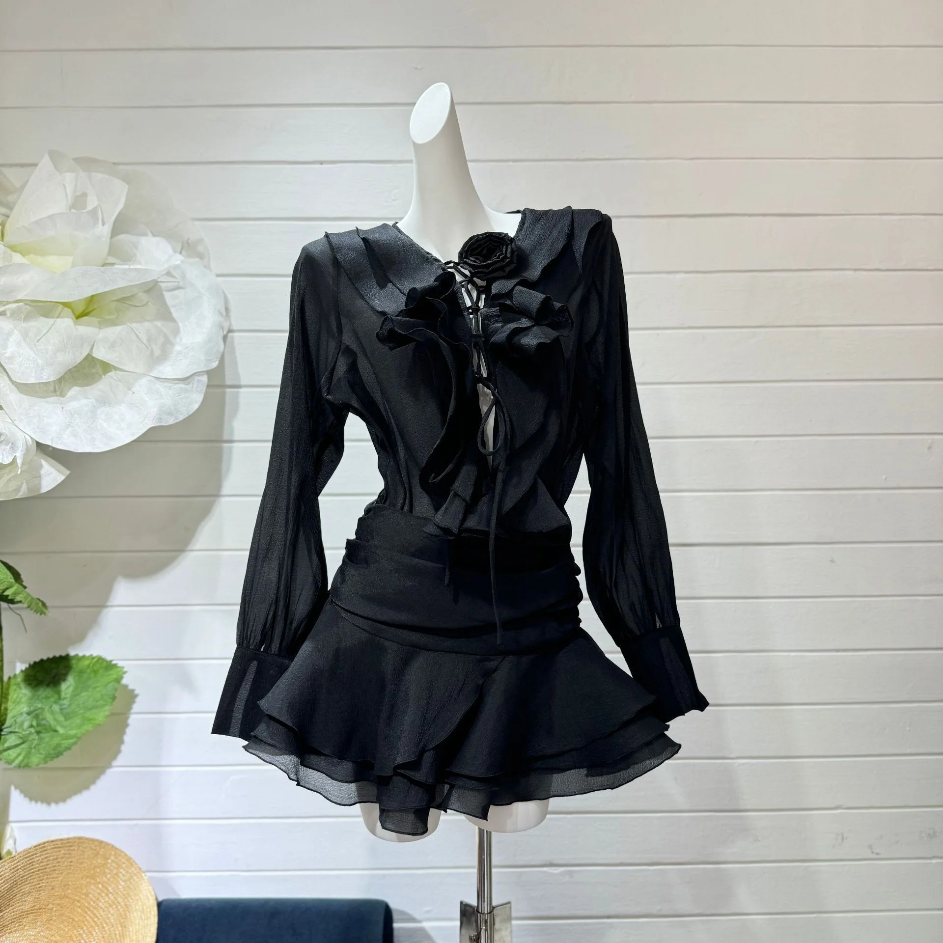 ZYHT 35239 Women's Elegant Black Velvet Blazer with White Ruffled Trim Peplum Hem & Long Puff Sleeves Chic Formal Jacket