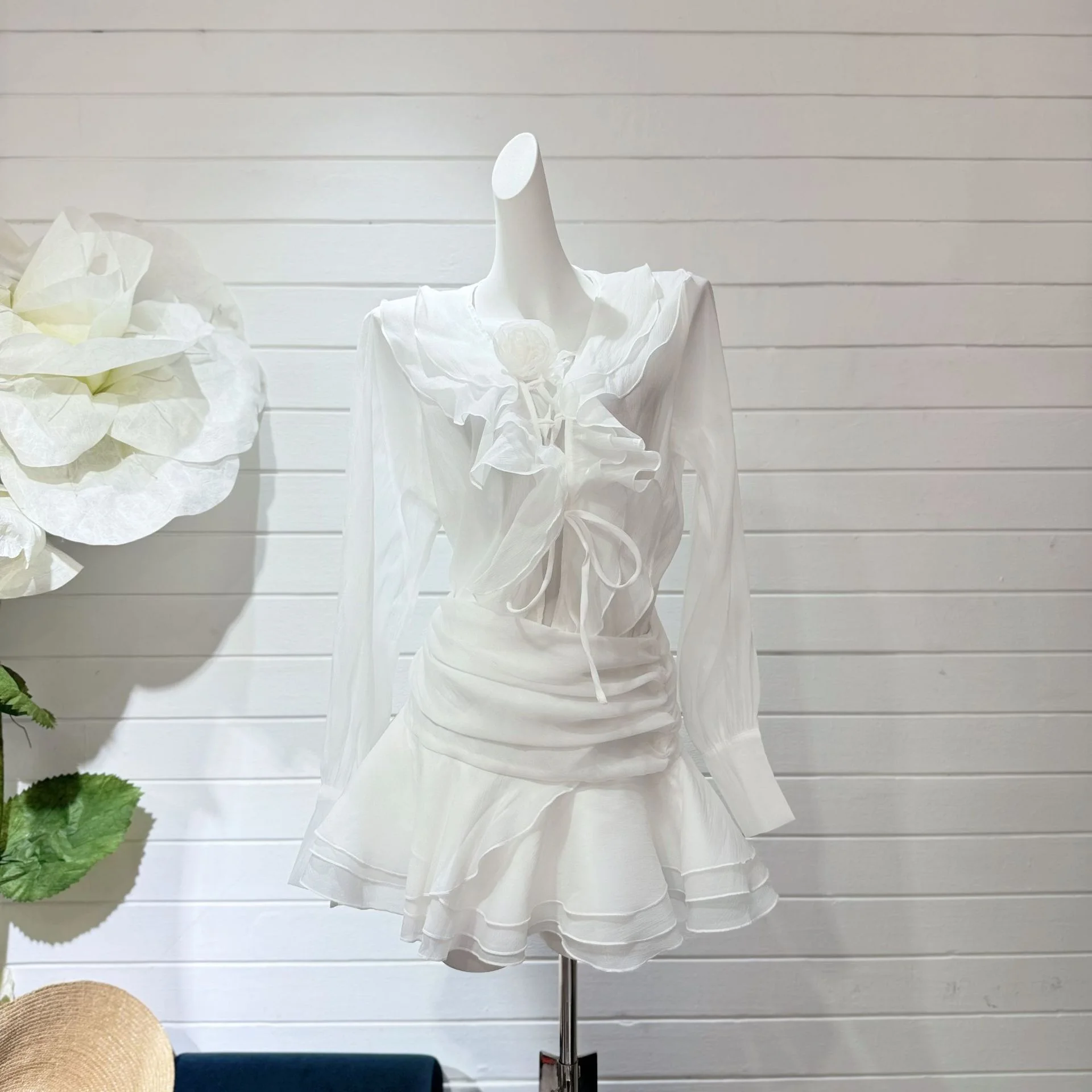 ZYHT 82024 White Blouse with Ruffled Cap Sleeves V-Neck Blouses Et Chemises Pour Femmes White Blouses for Women