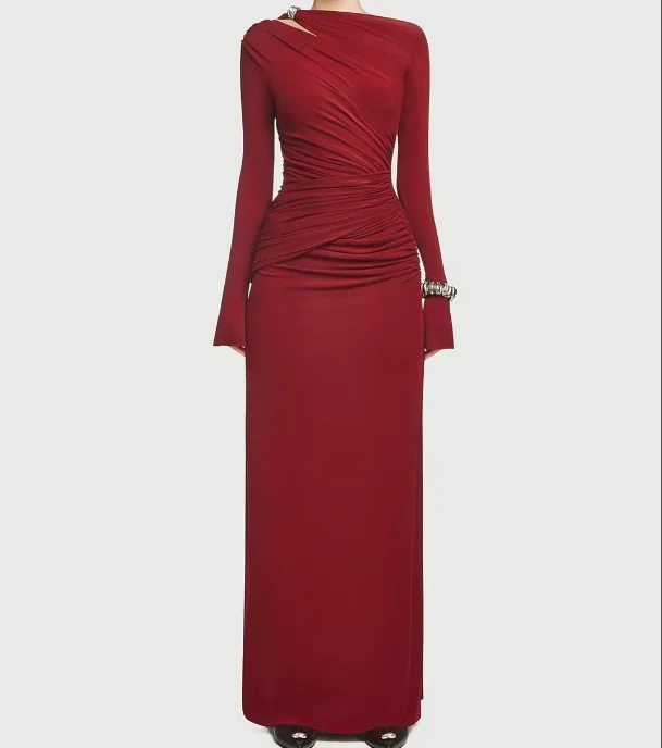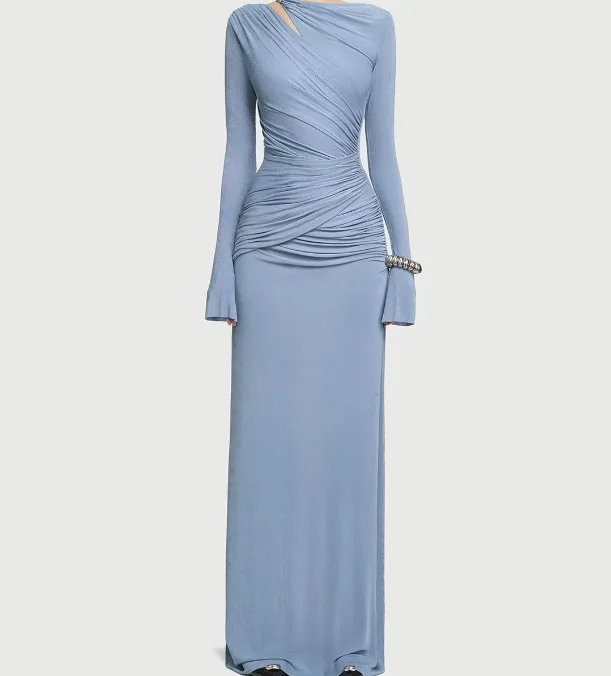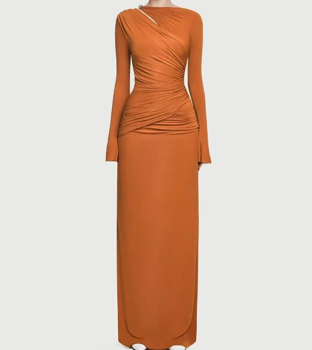 ZYHT 73849 European Wholesale Fashion Casual One Shoulder Ruched Maxi Dress Side Slit Pleated Long Sleeve Dresses for Women
