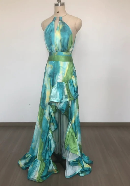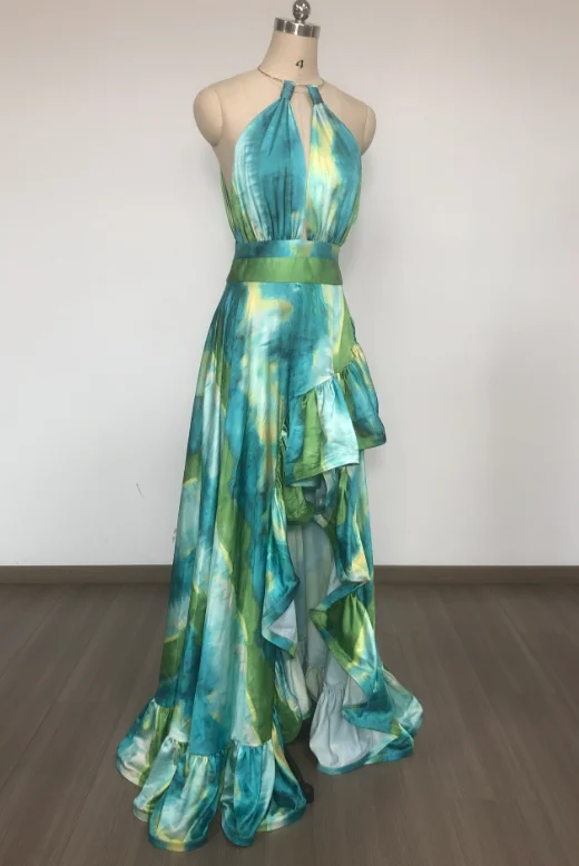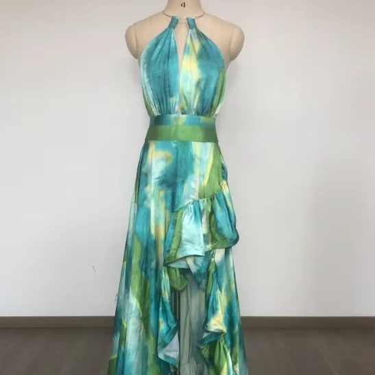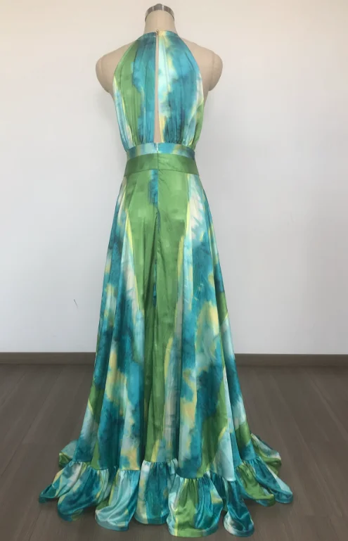 SB3534 Summer High Quality Women Green Floral Print Dress Sleeveless Elegant Beach Party Maxi Dresses
