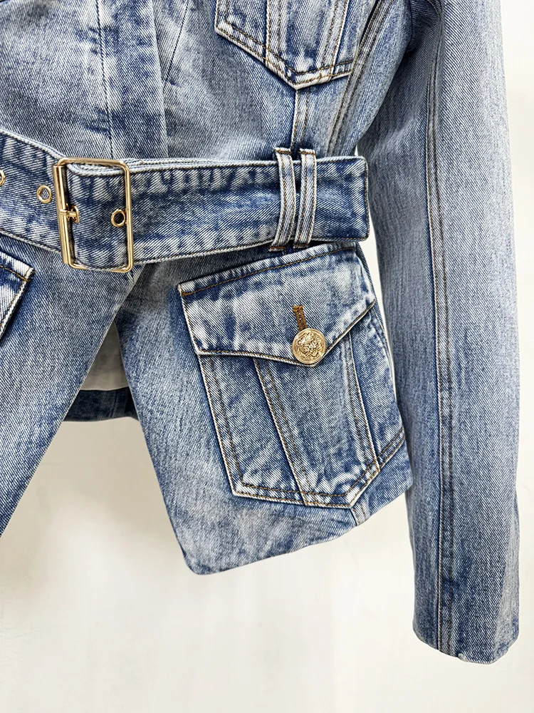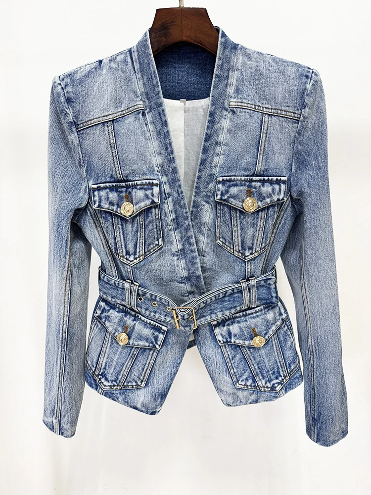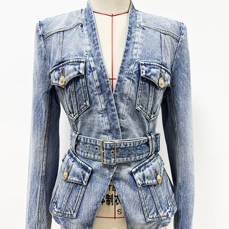 BA2361 New Arrivals Bodycon Denim Fashion V-Neck Blazer Women Lady Elegant Jacket With Belt Formal Luxury
