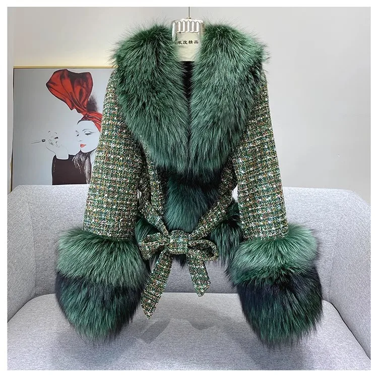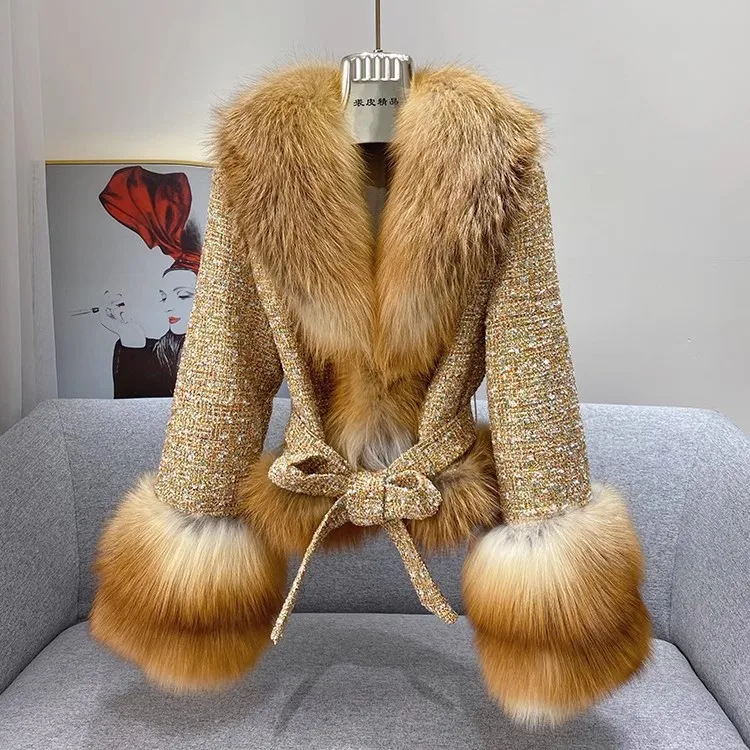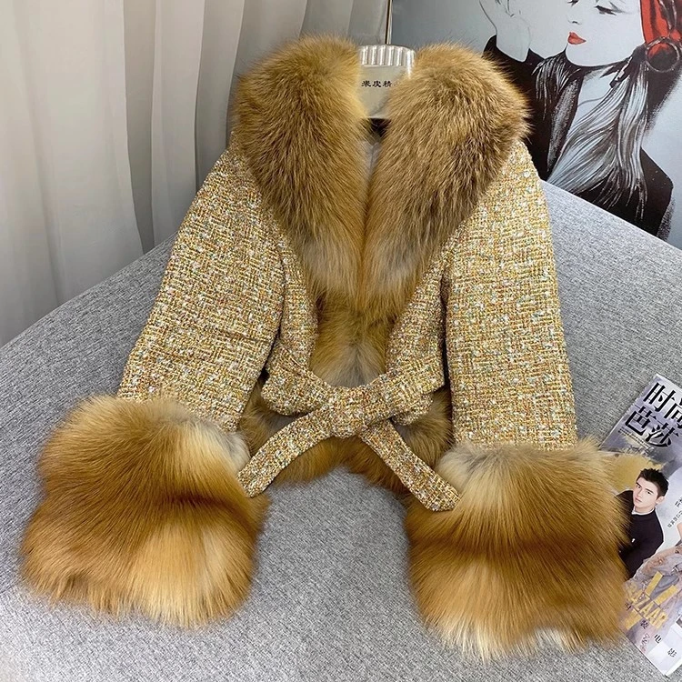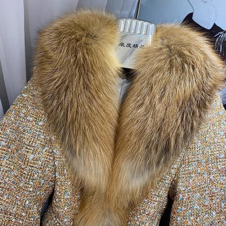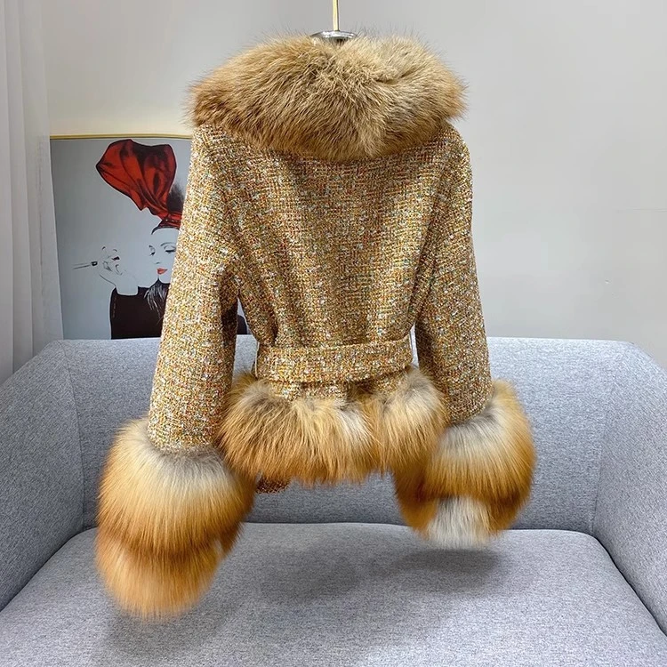 Ladies Winter Fashionable Real Fox Fur Parkas Thick Woolen Blend Coat with Huge Fox Fur Collar & Cuffs Genuine Eco-Friendly