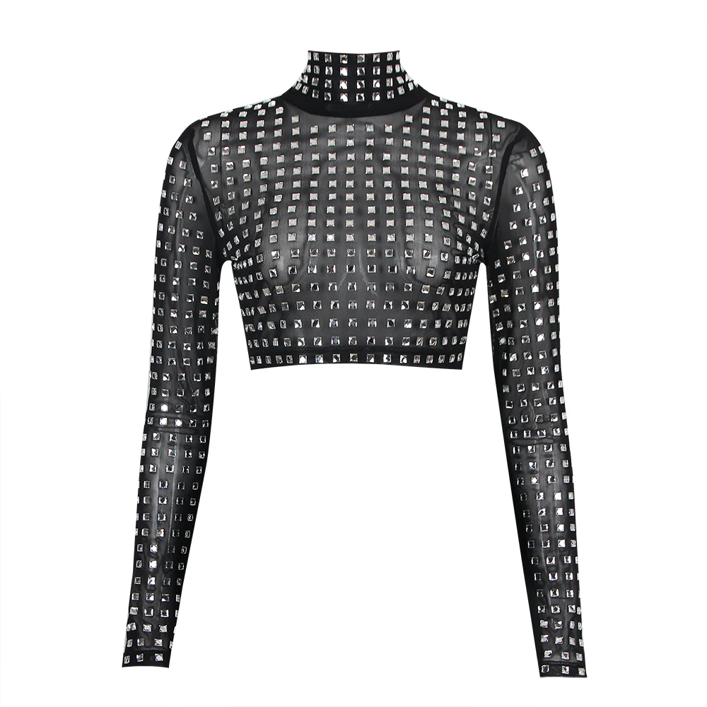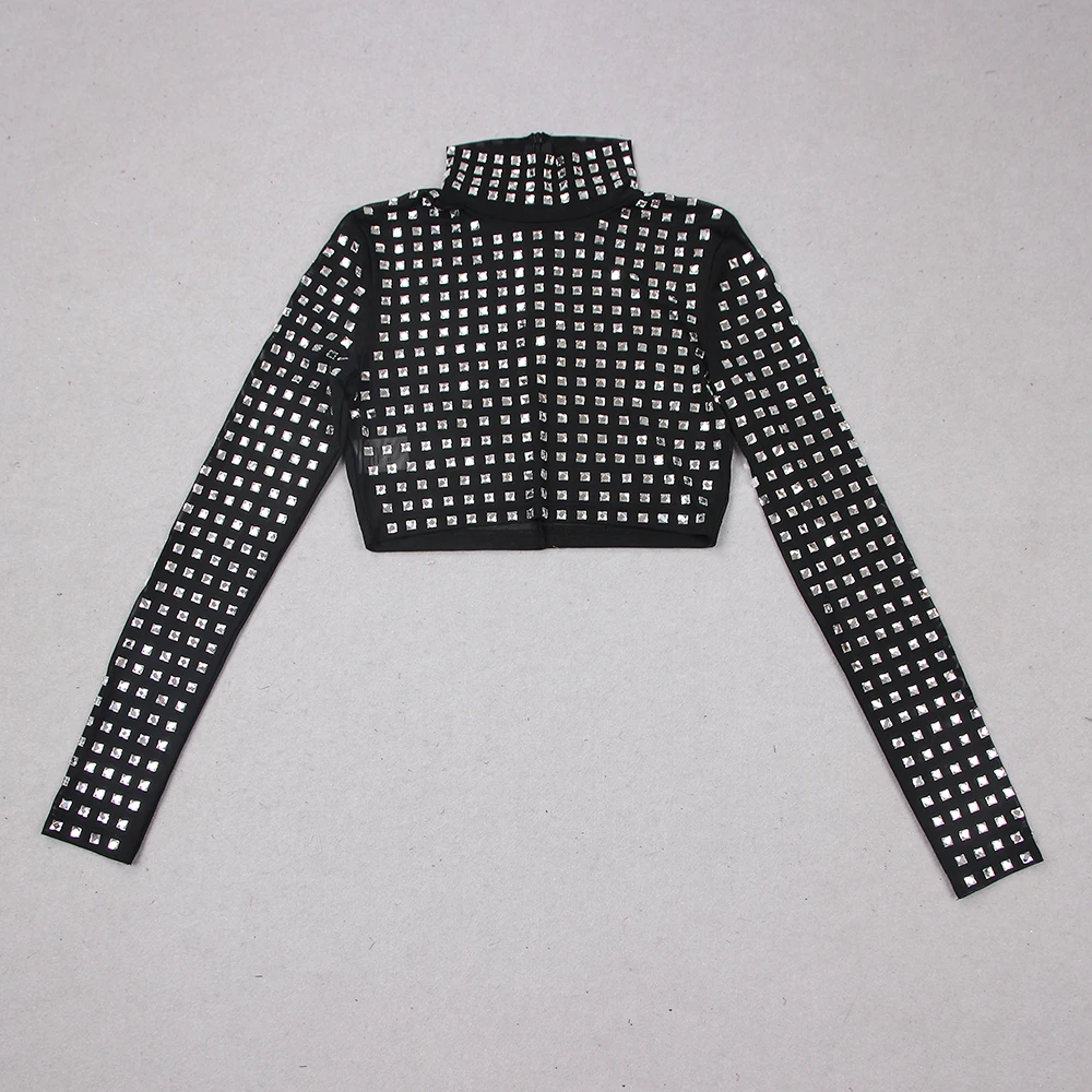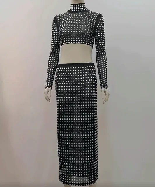 TS2212 New Arrival Women Wholesale Long Sleeve Slim Sexy Crystal Diamonds Beaded Woman Top Skirt Two-piece Set