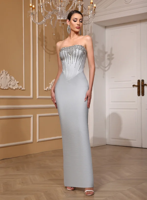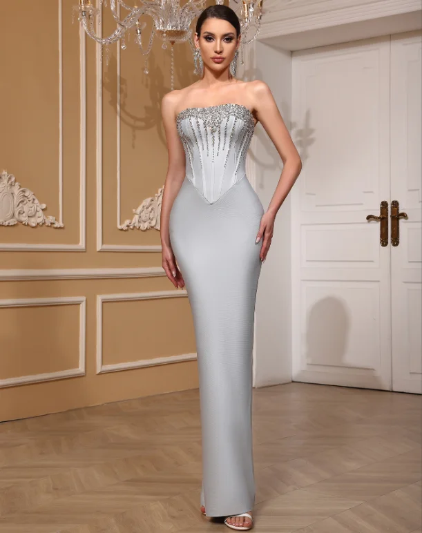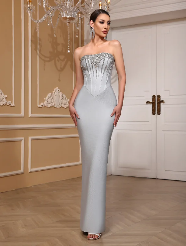 SB3497 New Fashion Sexy Party Cocktail Dress Strapless Rhinestone Sleeveless Bodycon Long Bandage Dress