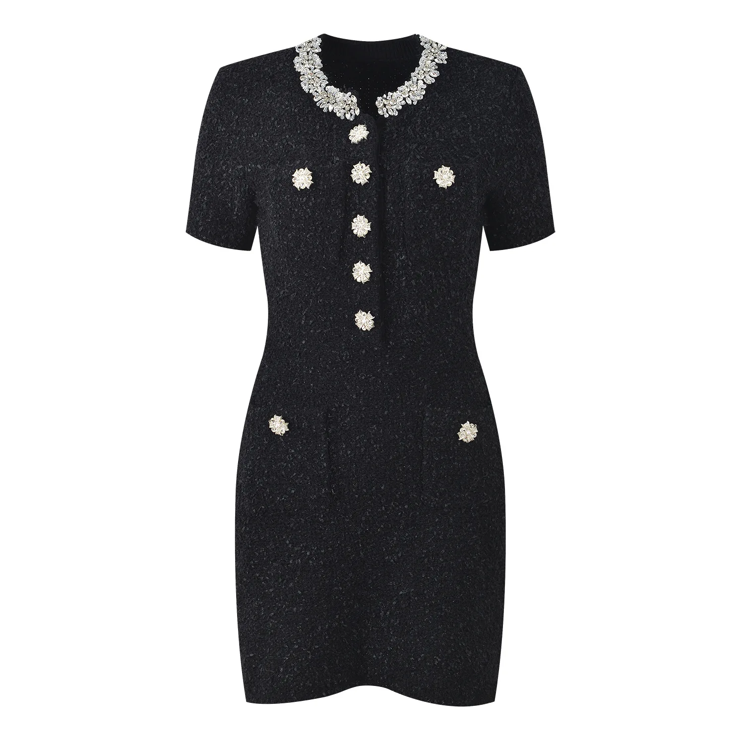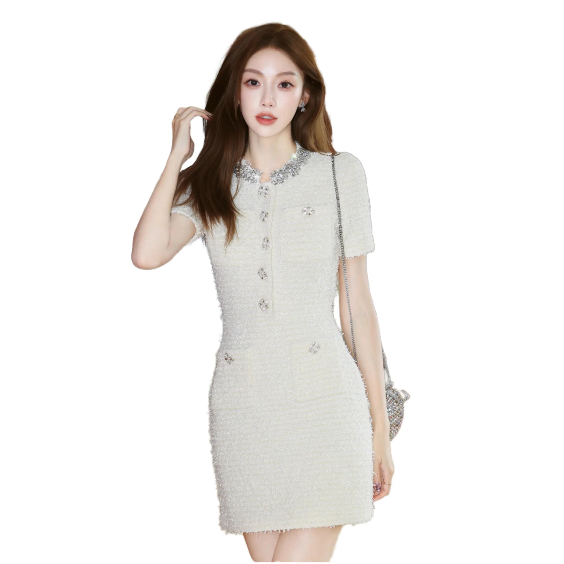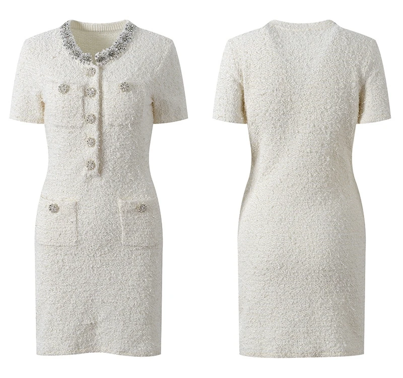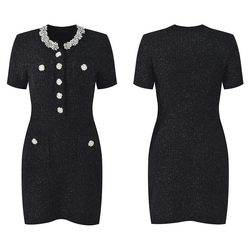 Winter Boutique Elegant Evening Dress French Diamond Embellishment High Quality Chiffon Slim Neck Short Sleeves Casual Style