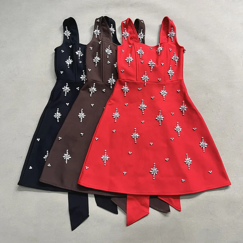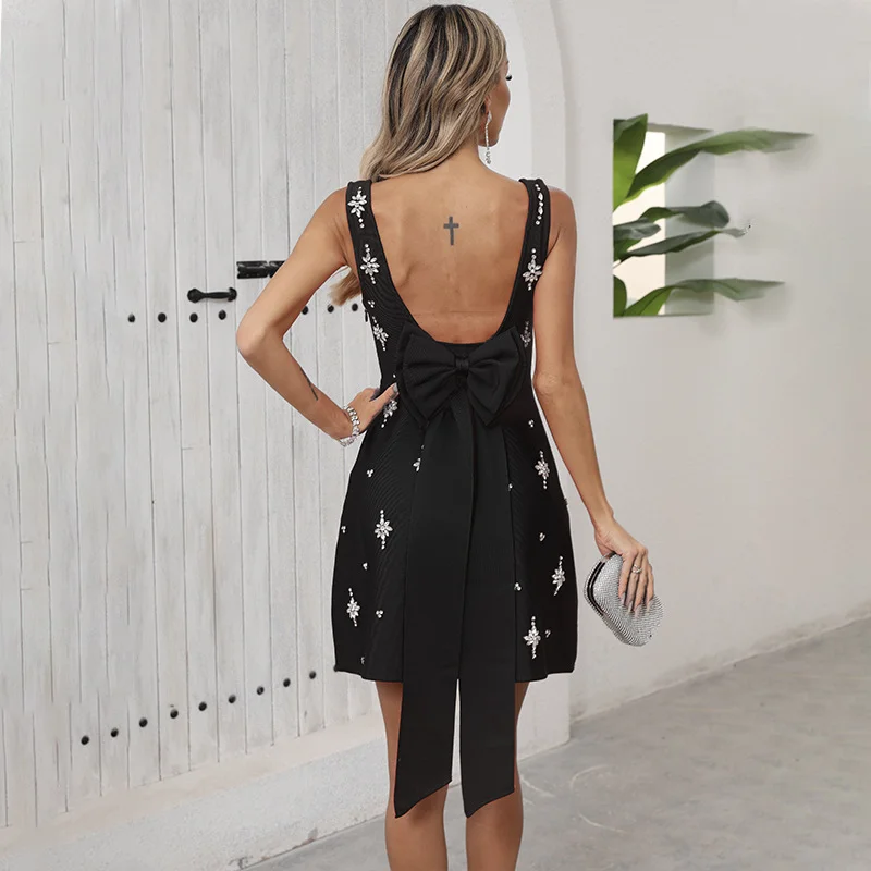 SB3683 Women Luxury Diamonds Bandage Dress Sleeveless Sexy Spaghetti Strap Women Fashion Bow Clothes Club Party Mini Dresses