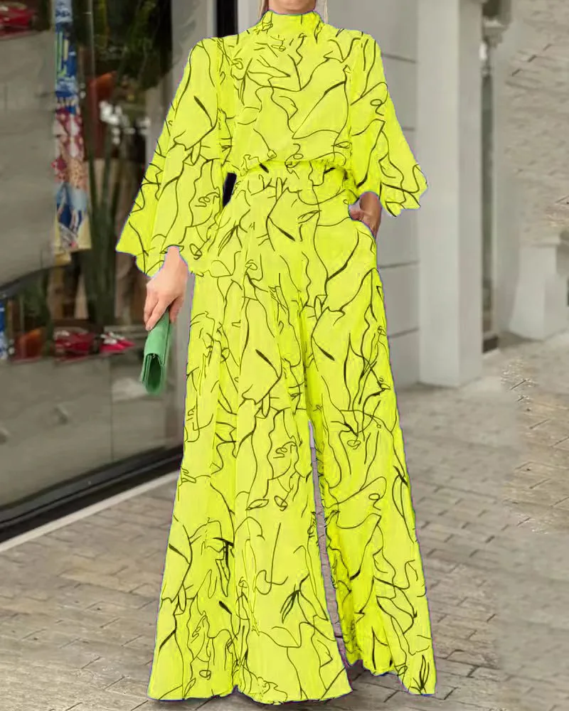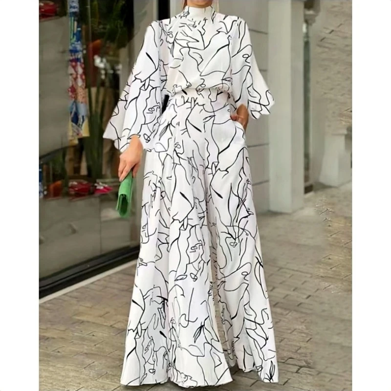 Long Sleeve Women Printed Jumpsuit High Neck Wide Leg New Lady Spring Autumn Jumpsuits