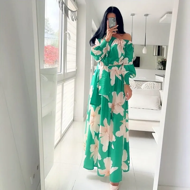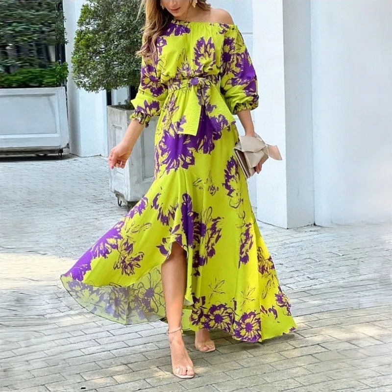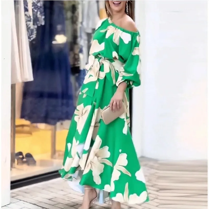High Street Women Irregular Dress Slanted Shoulder Floral Print Elegant Vestidos Lantern Sleeve Lace up Casual Dresses
