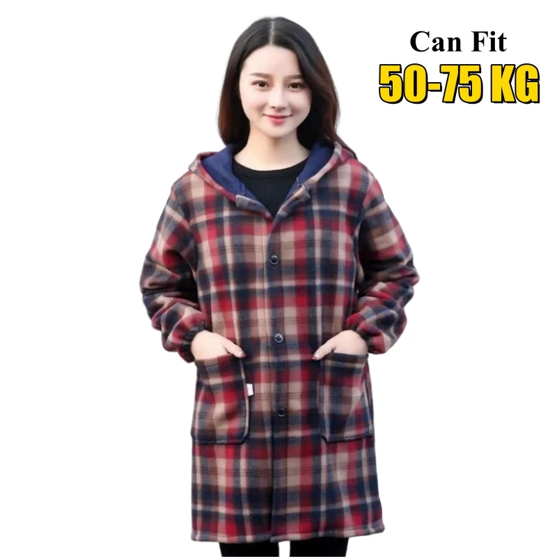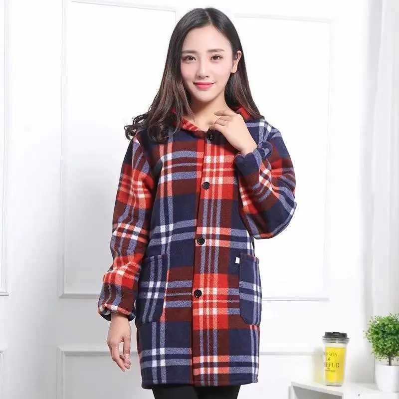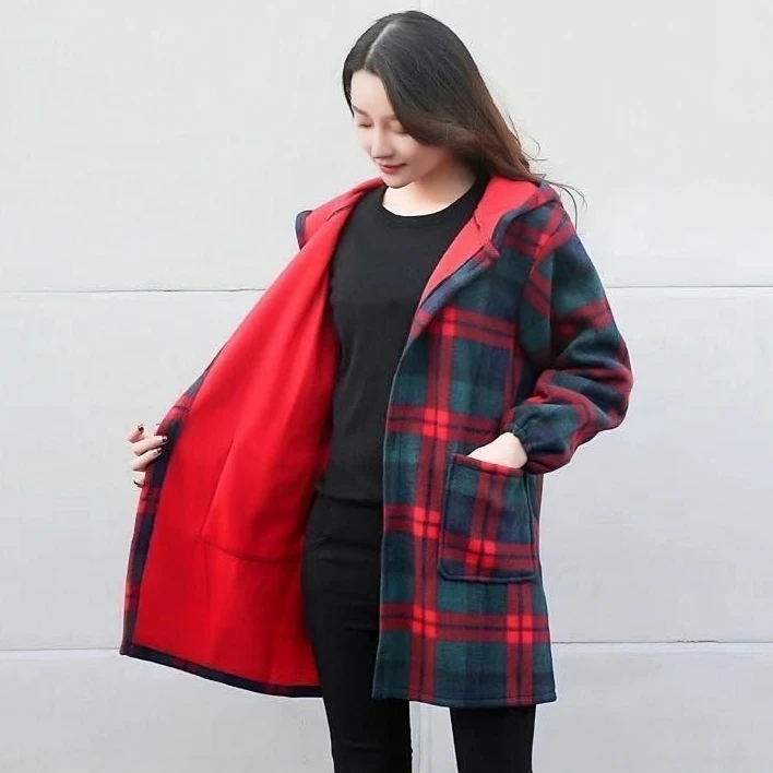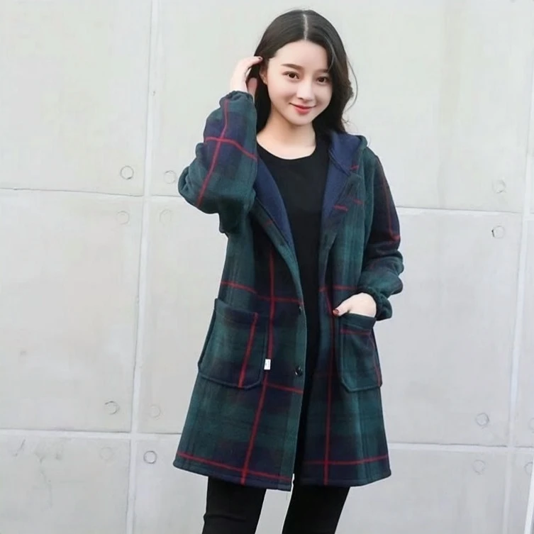 Women Thick Fleece Warm Coat Single Breasted Pocketed Hooded Overcoat Autumn Winter Female Loose Plaid Woolen Coat