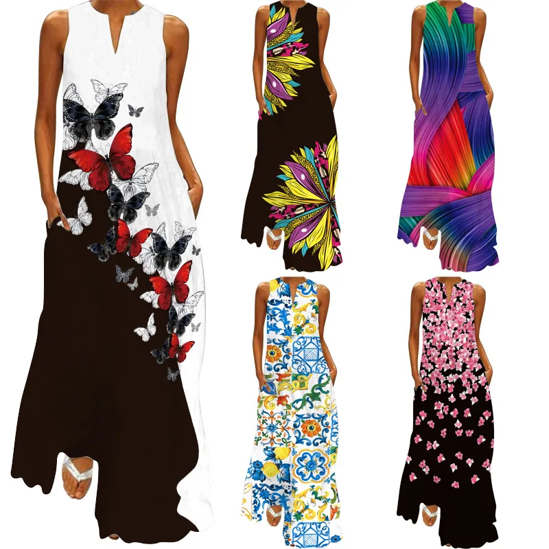 Fashion Print Women Long Dress Summer Sleeveless Pocketed African Lady Casual Loose Maxi Dress