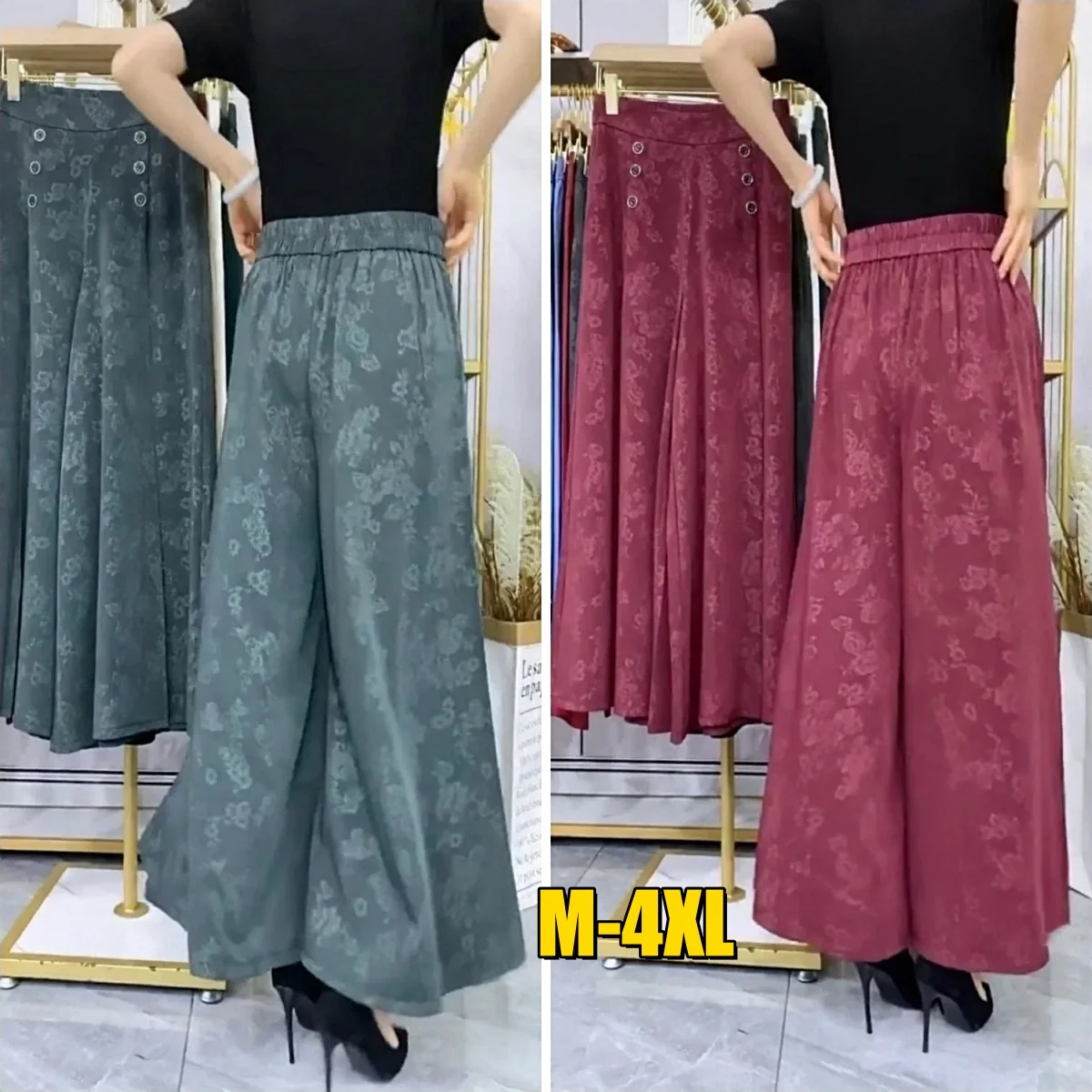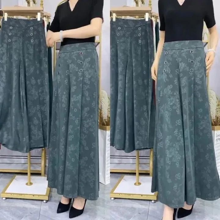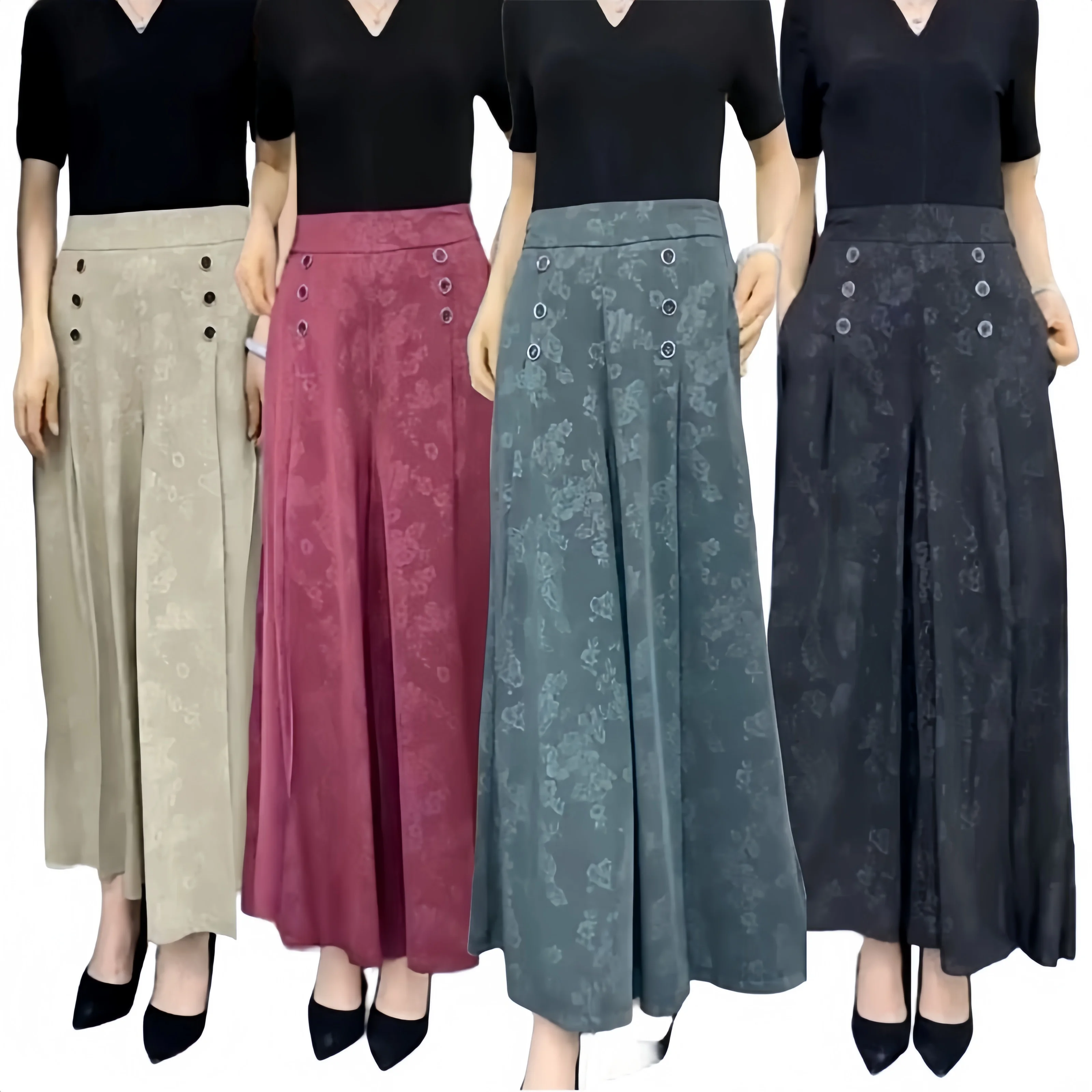 Female Fashion Floral Jacquard Trousers Vintage Buttons Folds Casual Wide Leg Pants Spring Summer High Waist Lady Cropped Pants