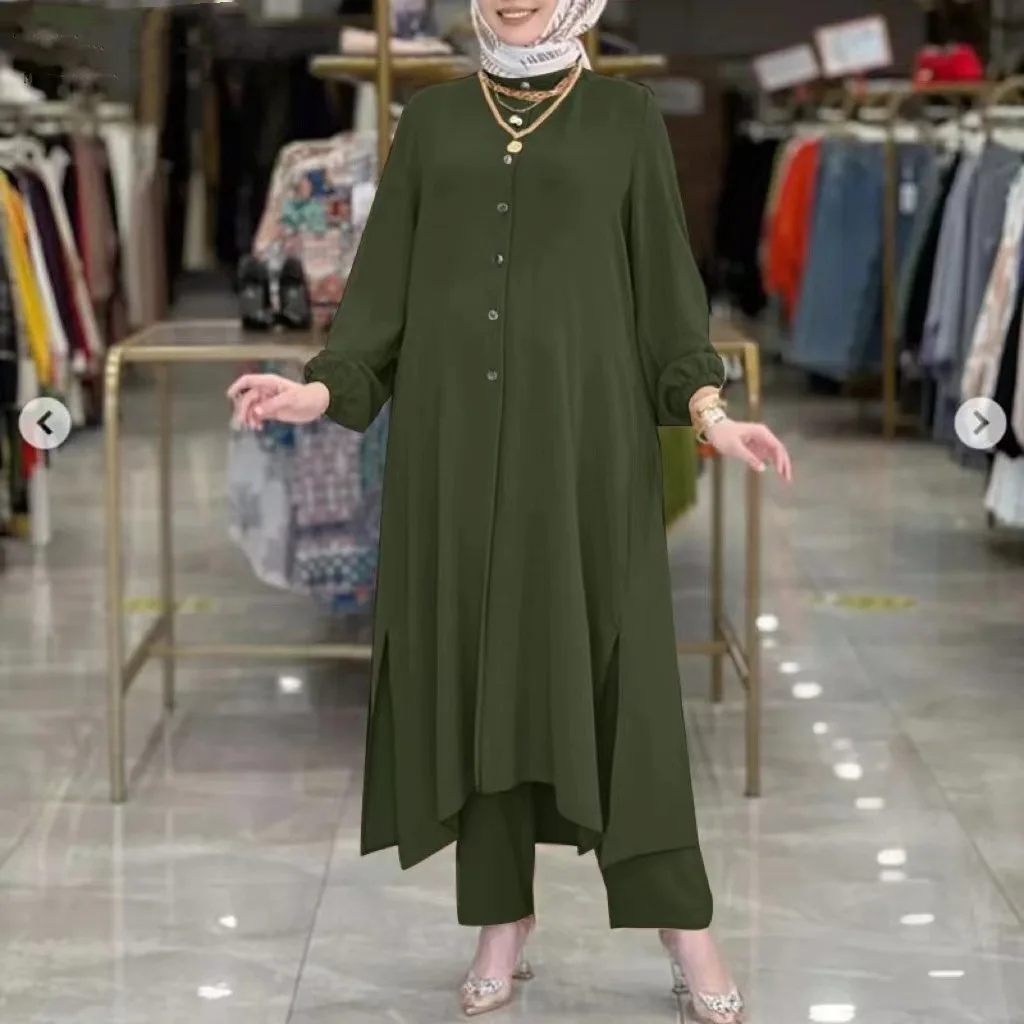 Vintage Women Solid Two Piece Set Long Sleeve Single Breasted Slit Long Shirt Muslim Lady Casual Loose Suit