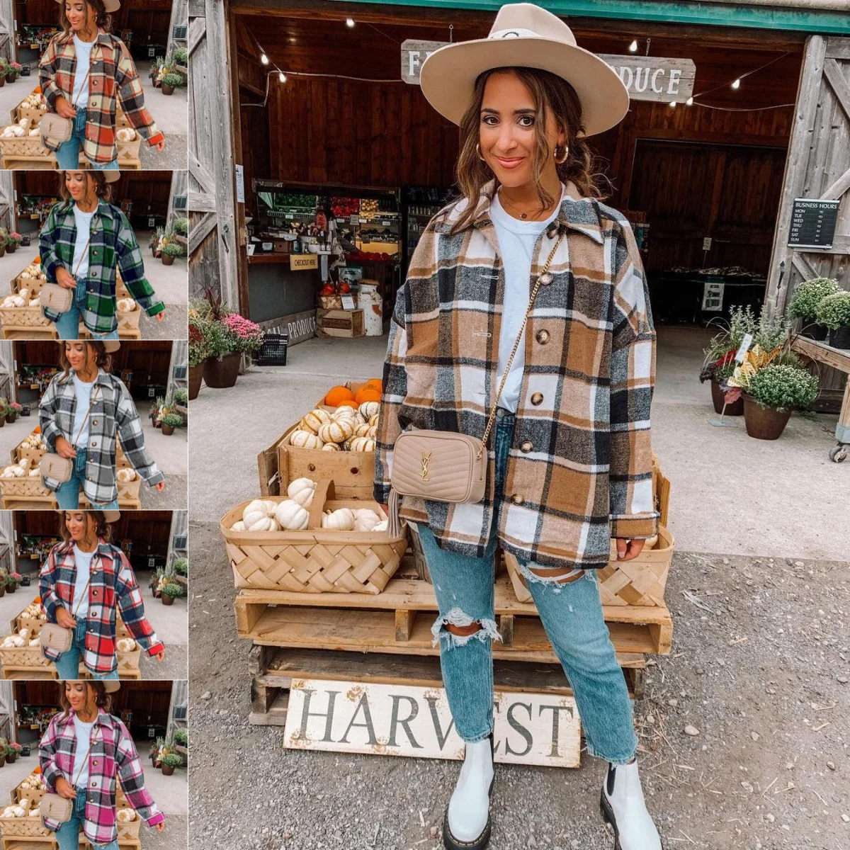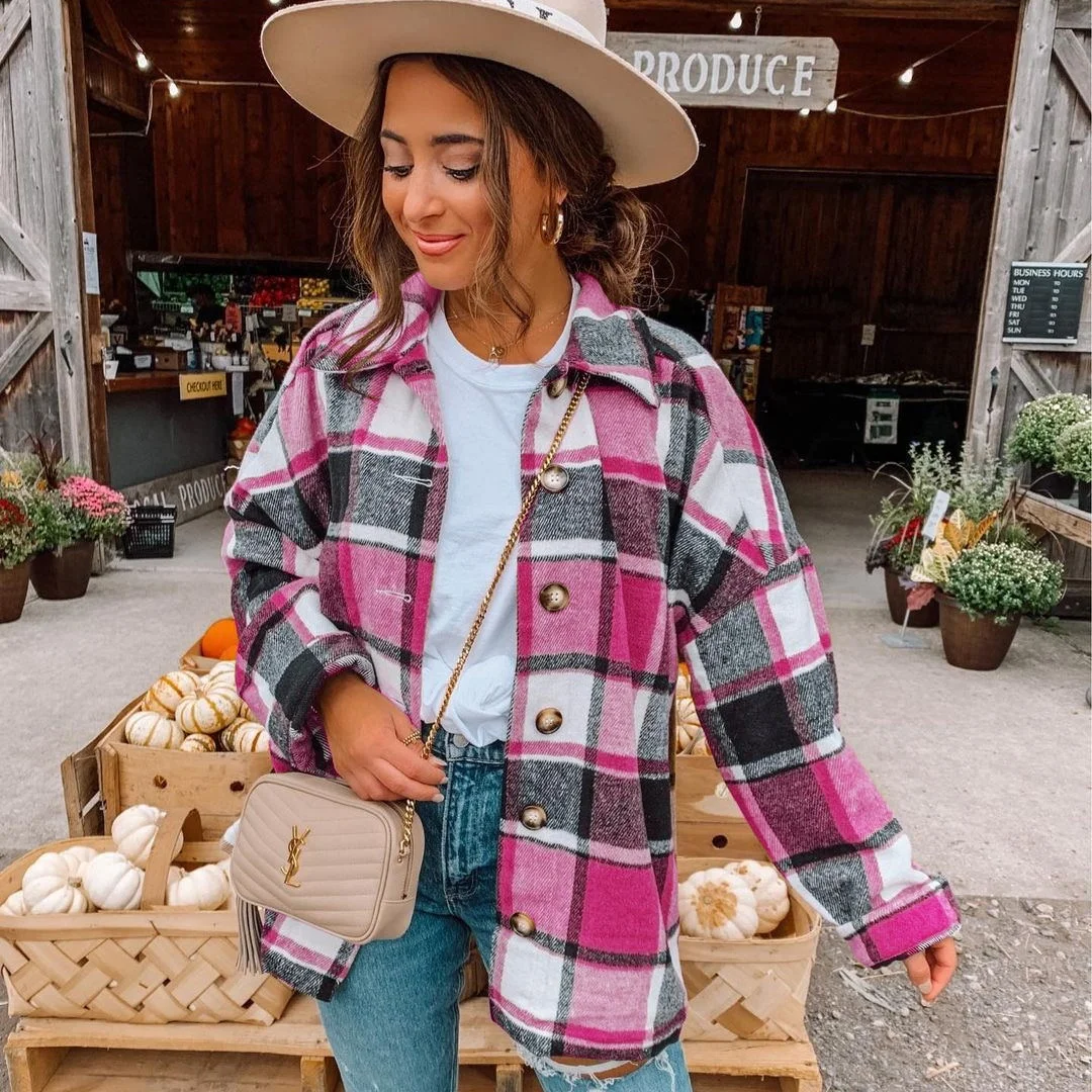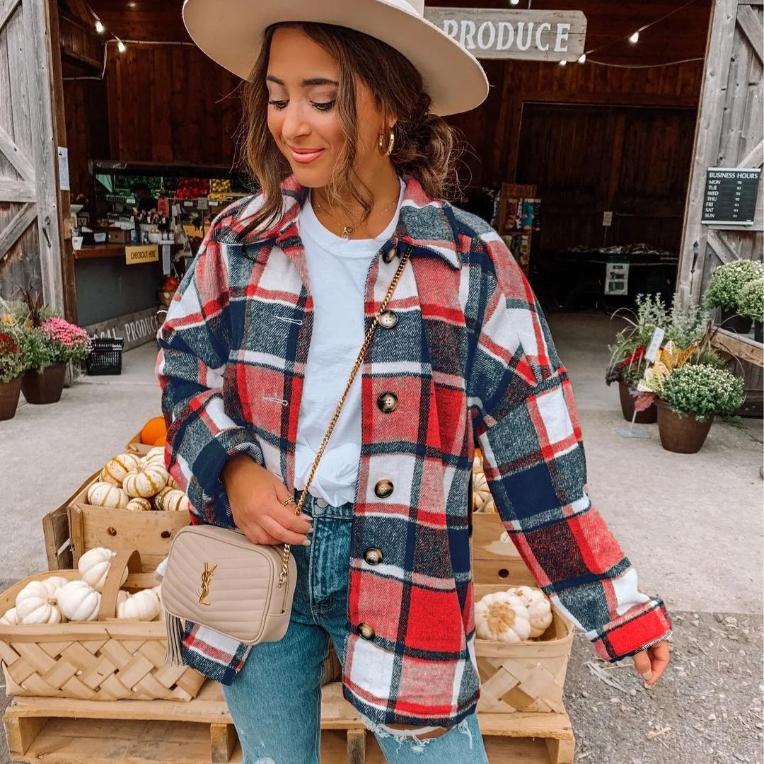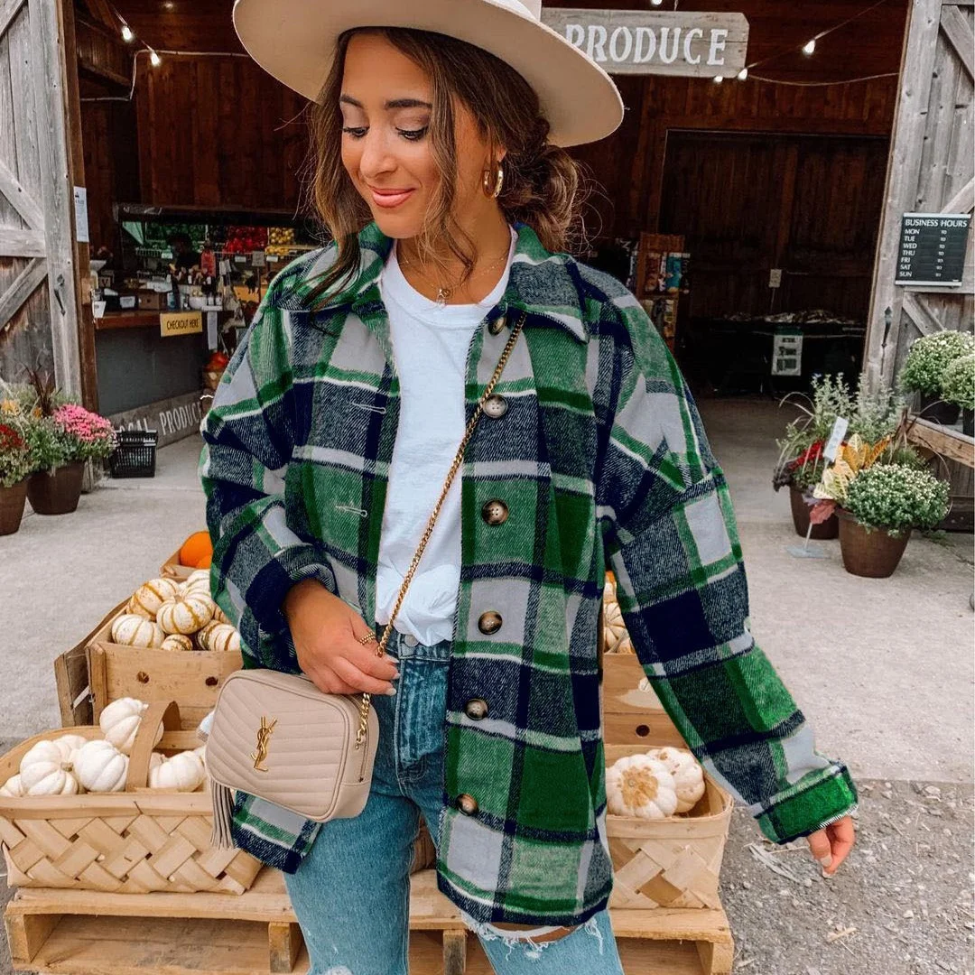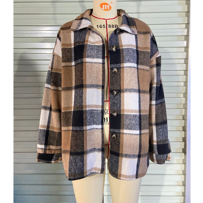 Female Loose Plaid Woolen Coat Long Sleeve Lapel Collar Shirt Jacket Single Breasted Lady Autumn Winter Casual Woolen Coats