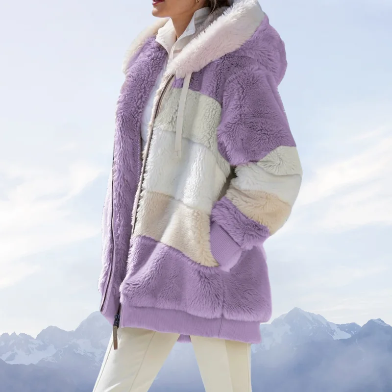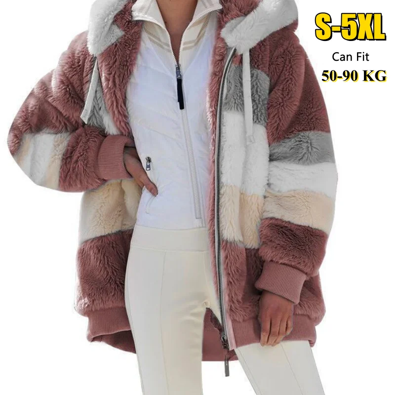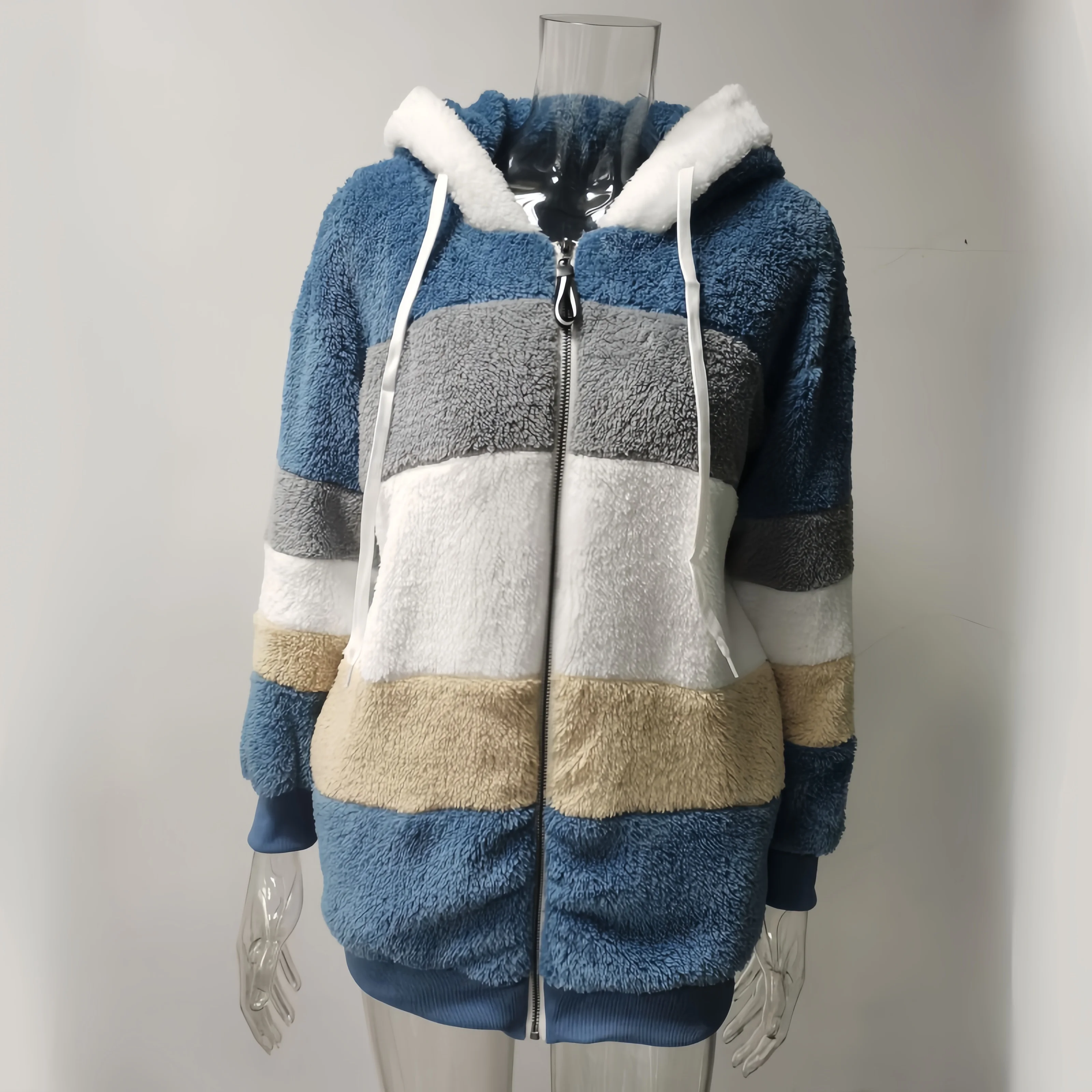 Women Casual Plush Hooded Coat Long Sleeve Pockets Zipper Jacket Color Blocking Lady Fashion Warm Coats