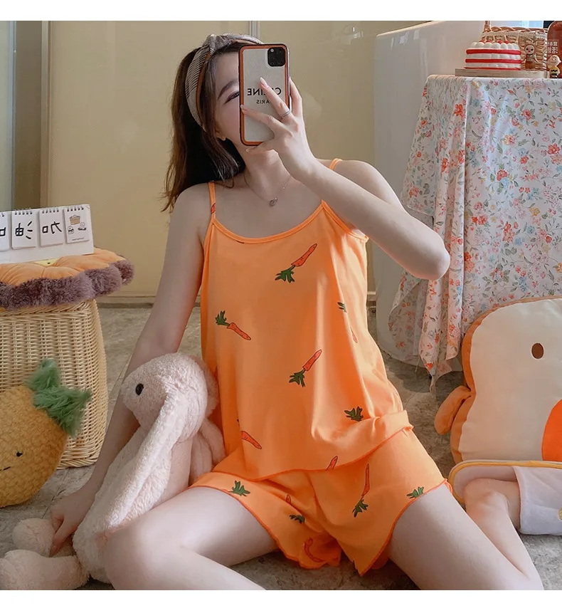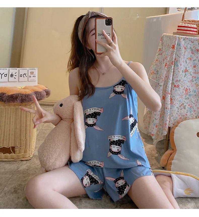 Lovely Girl Summer Pajamas Set Fashion Print Sleeveless Top Shorts Two Piece Set New Female Casual Sleepwear