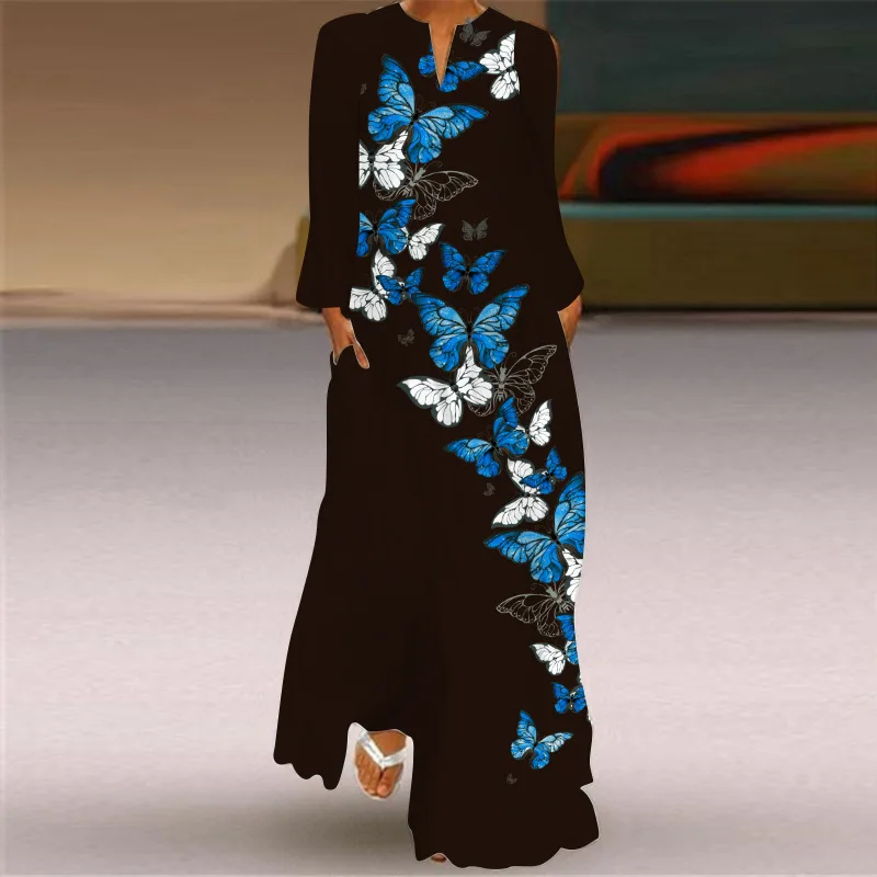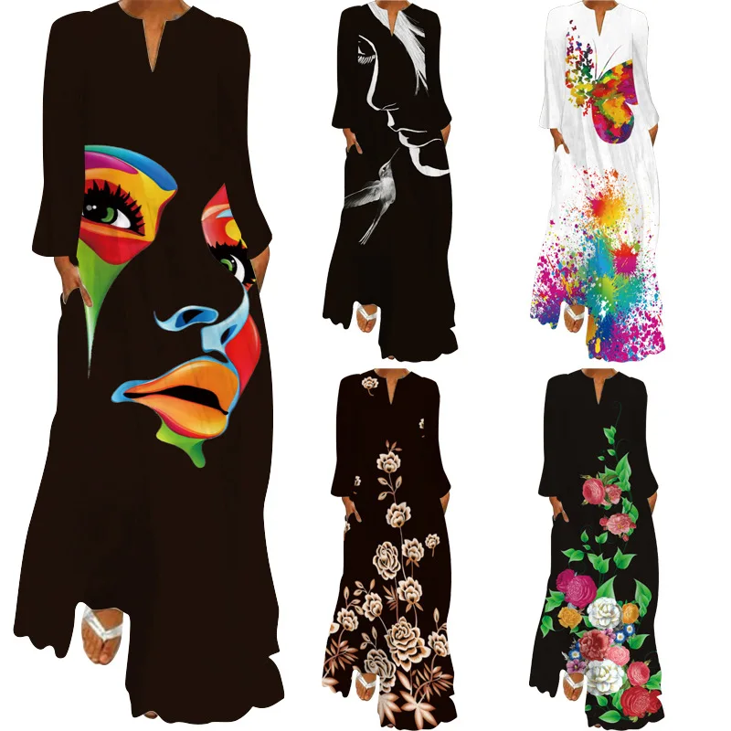 New Long Sleeve Dress African Women Casual Summer Print Dress Lady Pocketed Plus Size Maxi Dress
