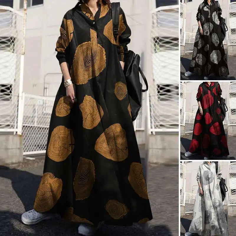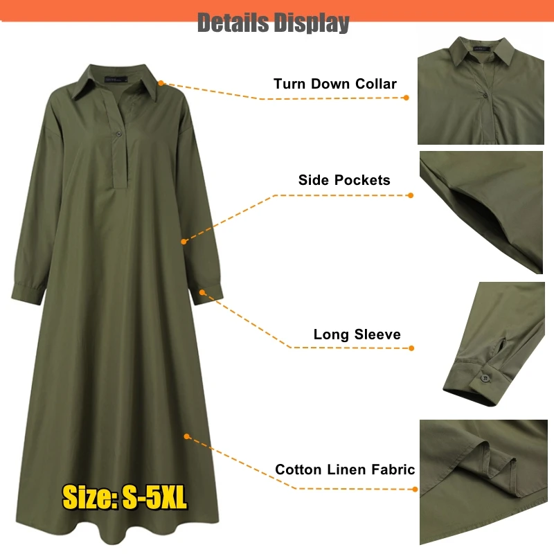 Women Vintage A-line Dress Mid East Muslim Lady Abaya Long Sleeve Pocketed Loose Maxi Dresses