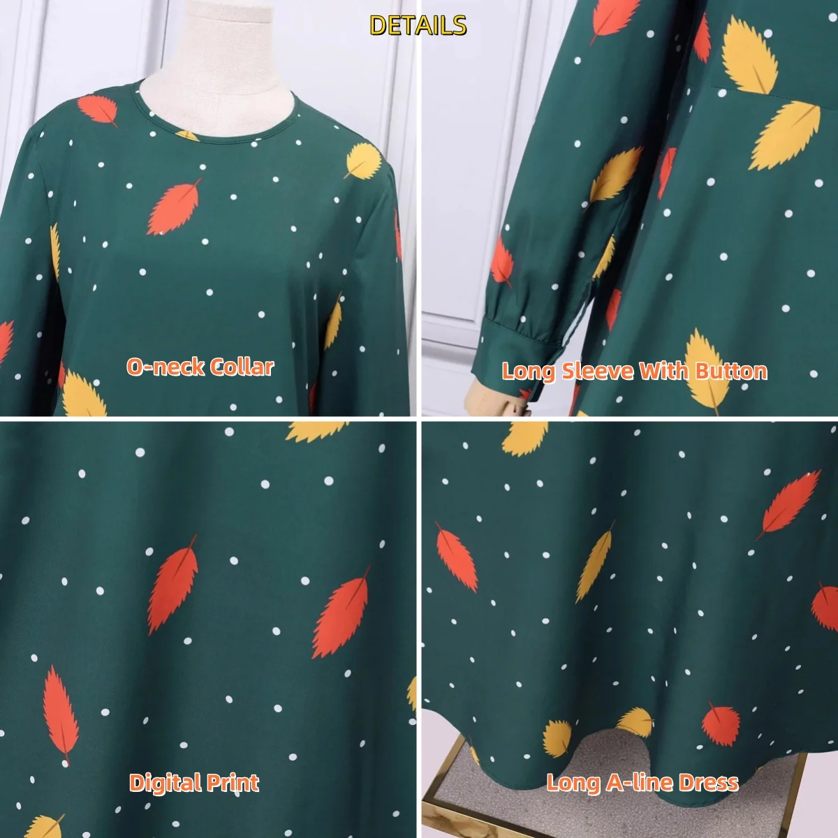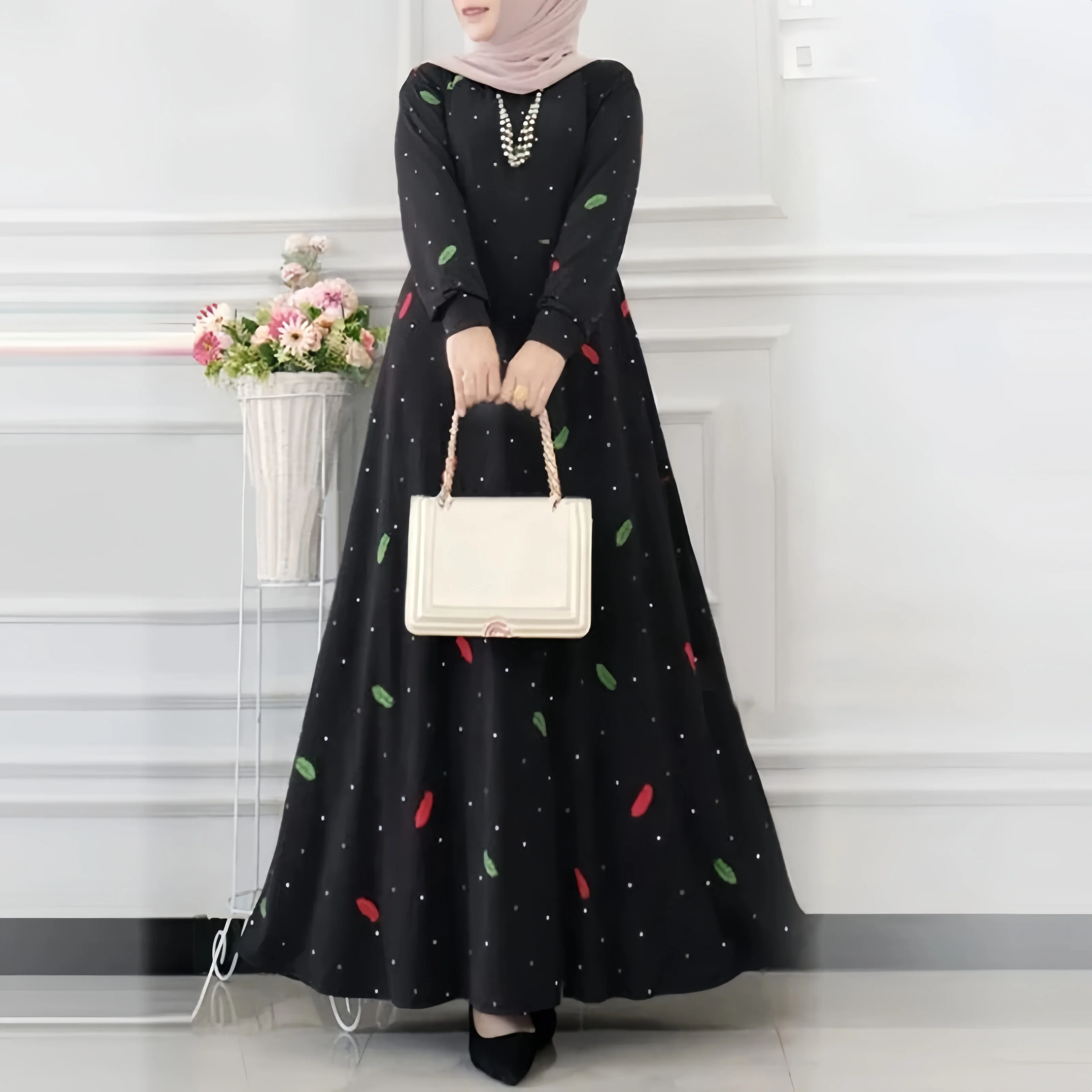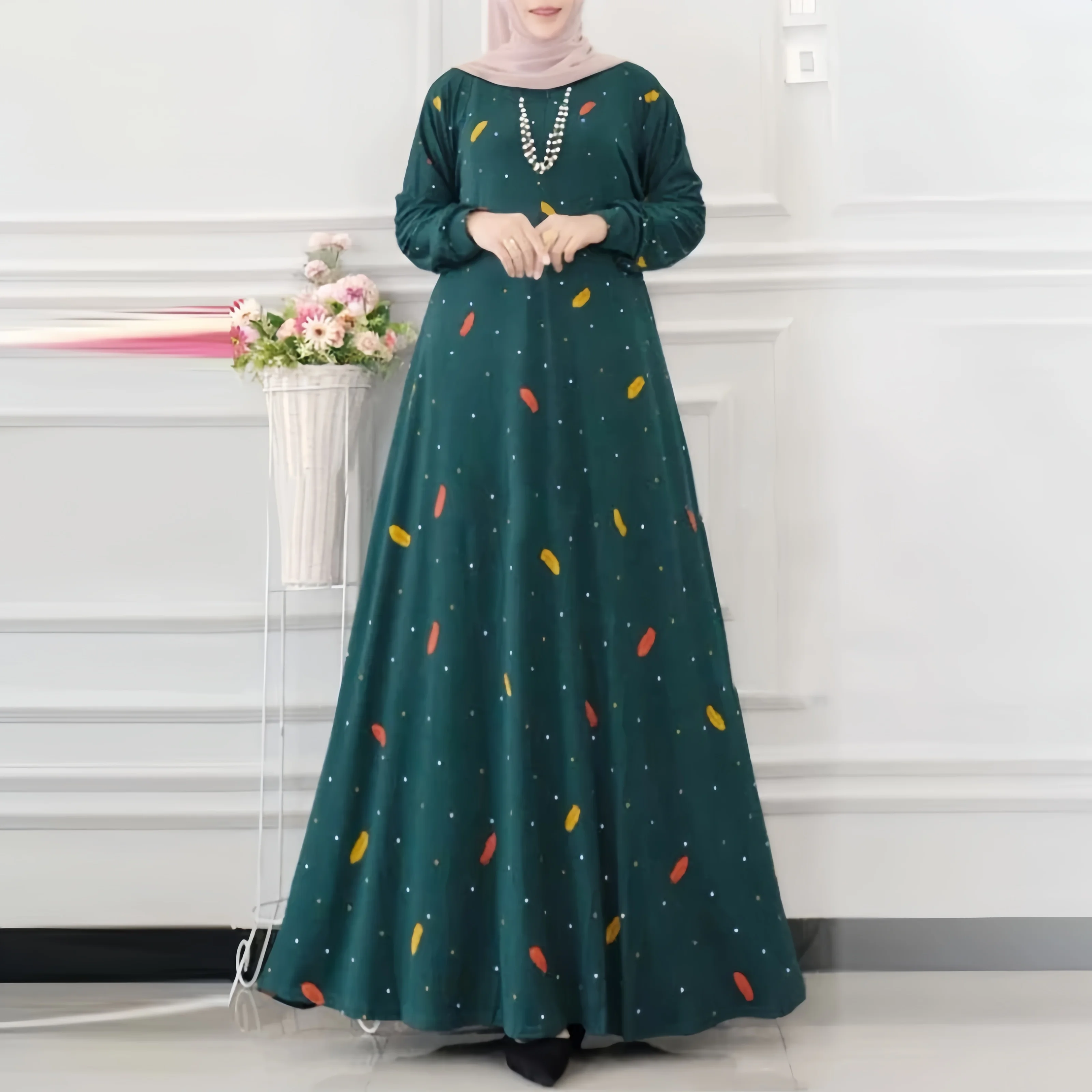 Women Long Casual Muslim Dress Long Sleeve O-neck Vintage Maxi Robe Spring Autumn Lady Floral A-line Dress