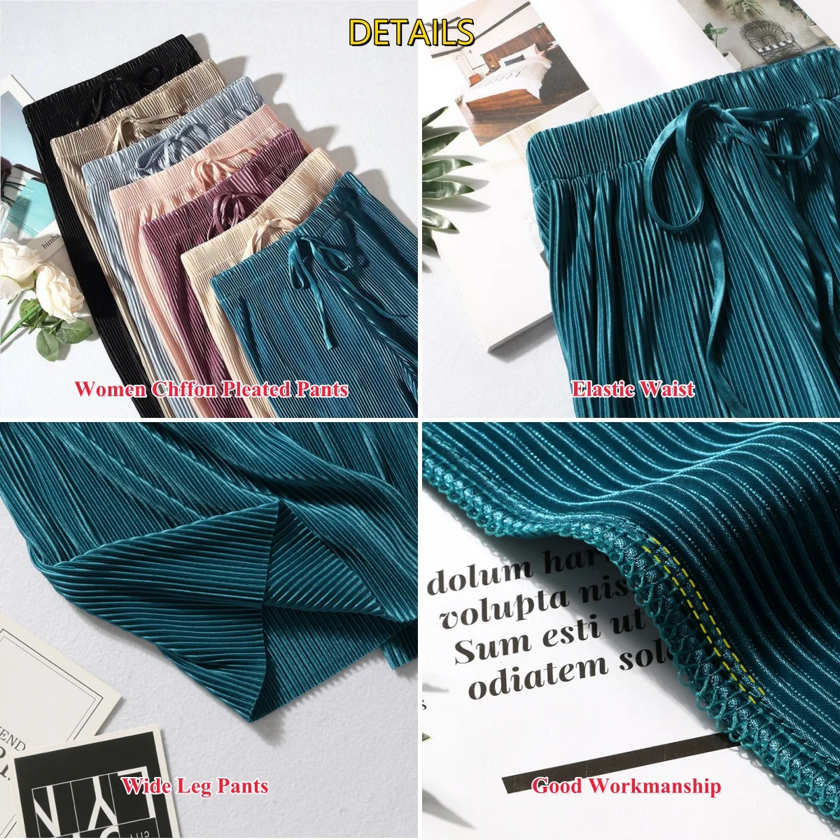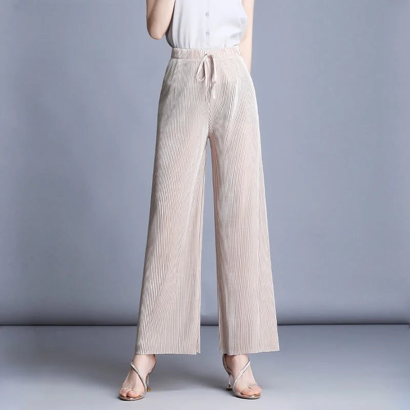 Women Summer Spring Pleated Pants Chiffon Ice Silk Casual Long Trousers Loose Lady Thin Casual Wide Leg Pants
