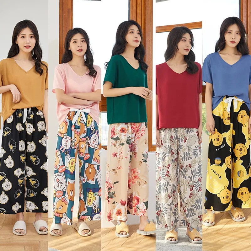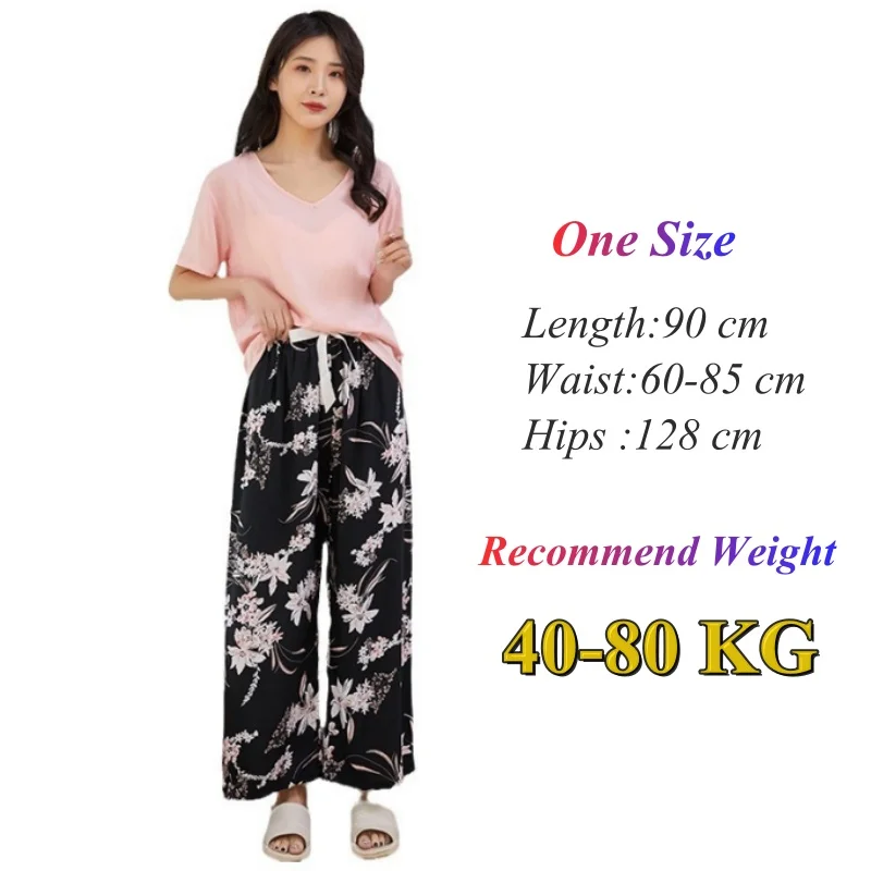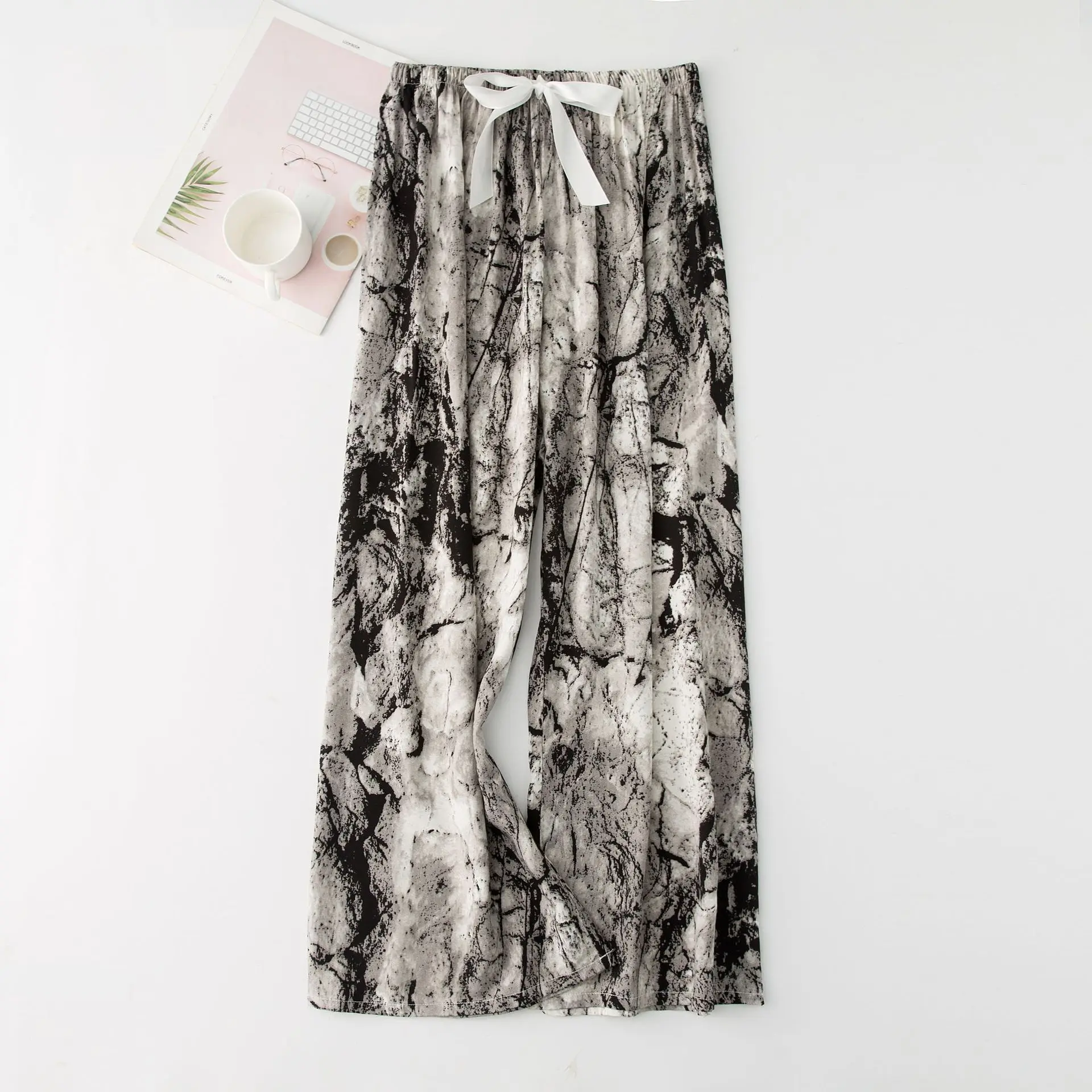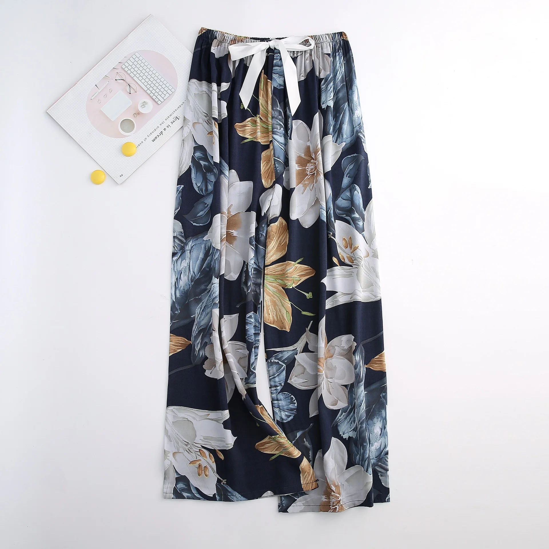Lady Fashion Summer Loose Pants Bow Elastic Waist Wide Leg Trousers Casual Home Sleepwear Women Floral Print Pajamas Pants