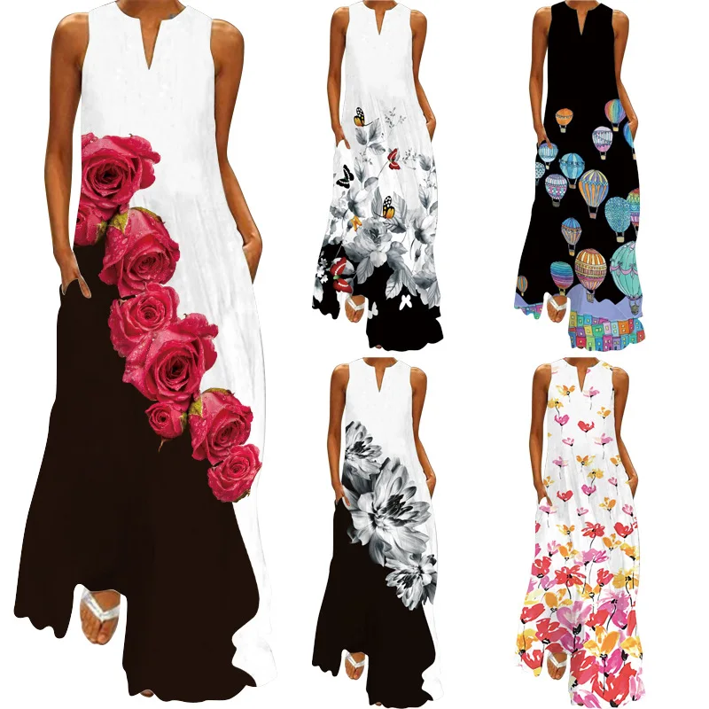 Summer Sleeveless Women Casual Dress Floral Print V-neck Pocketed Lady Plus Size Maxi Dresses