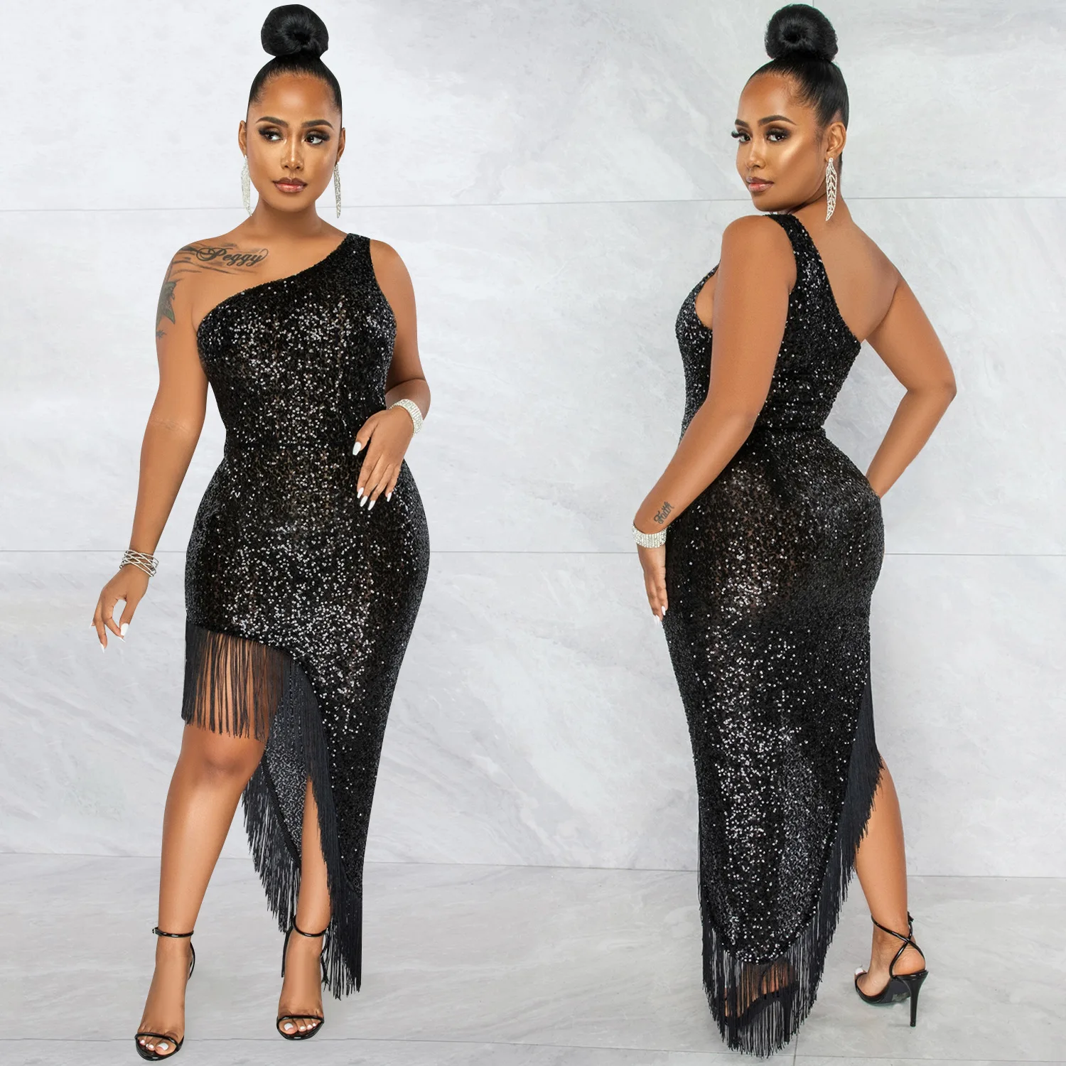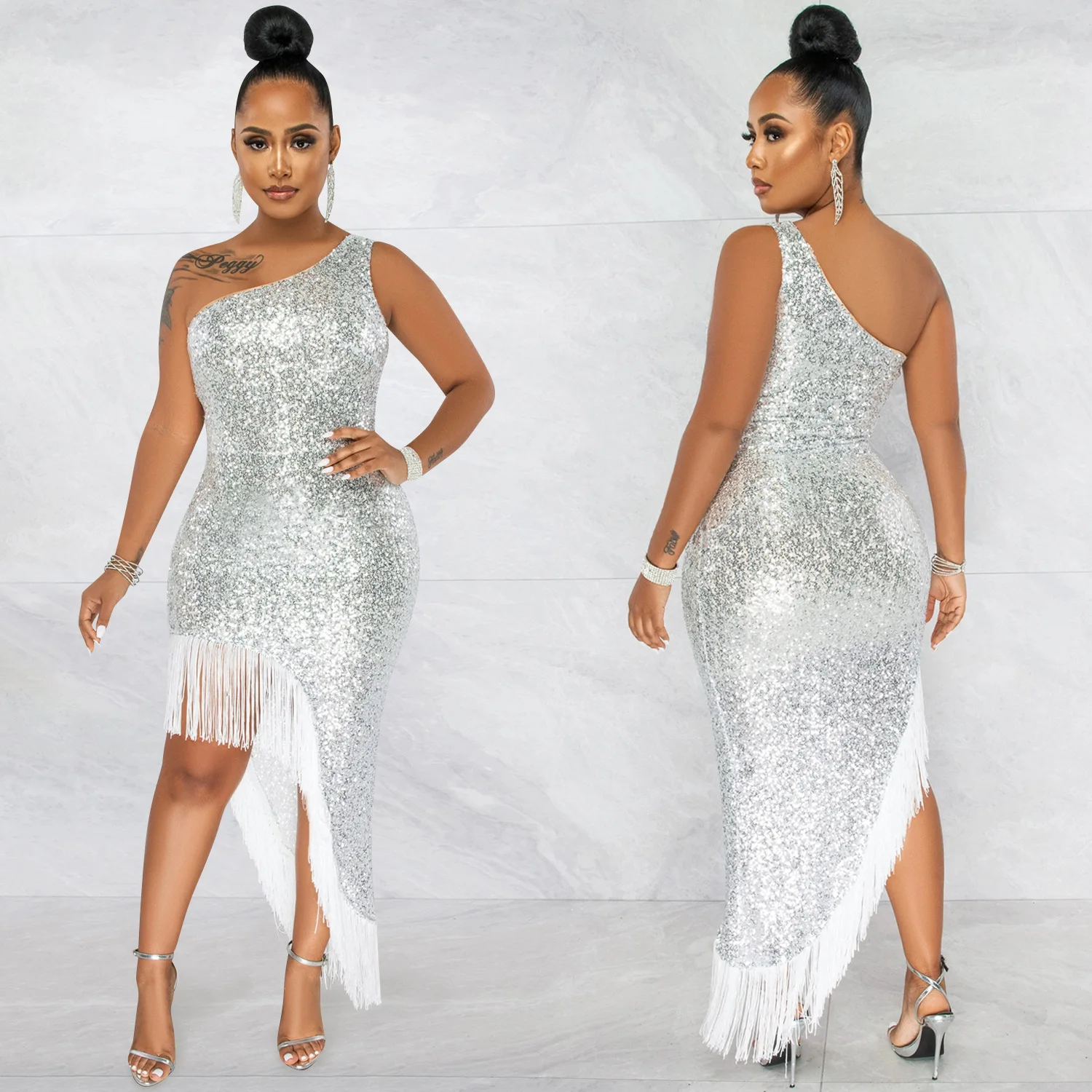 Women One Shoulder Party Dress Irregular Slit Tassel Elegant Sequined Dress Sexy Backless Female Maxi Long Dress