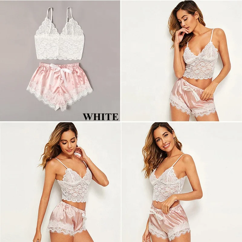 Lady Summer Lace Sleepwear Set Slim Fit Crop Top + Bow Silk Satin Shorts Two Piece Lady Plus Size Sexy Lingerie Nightwear