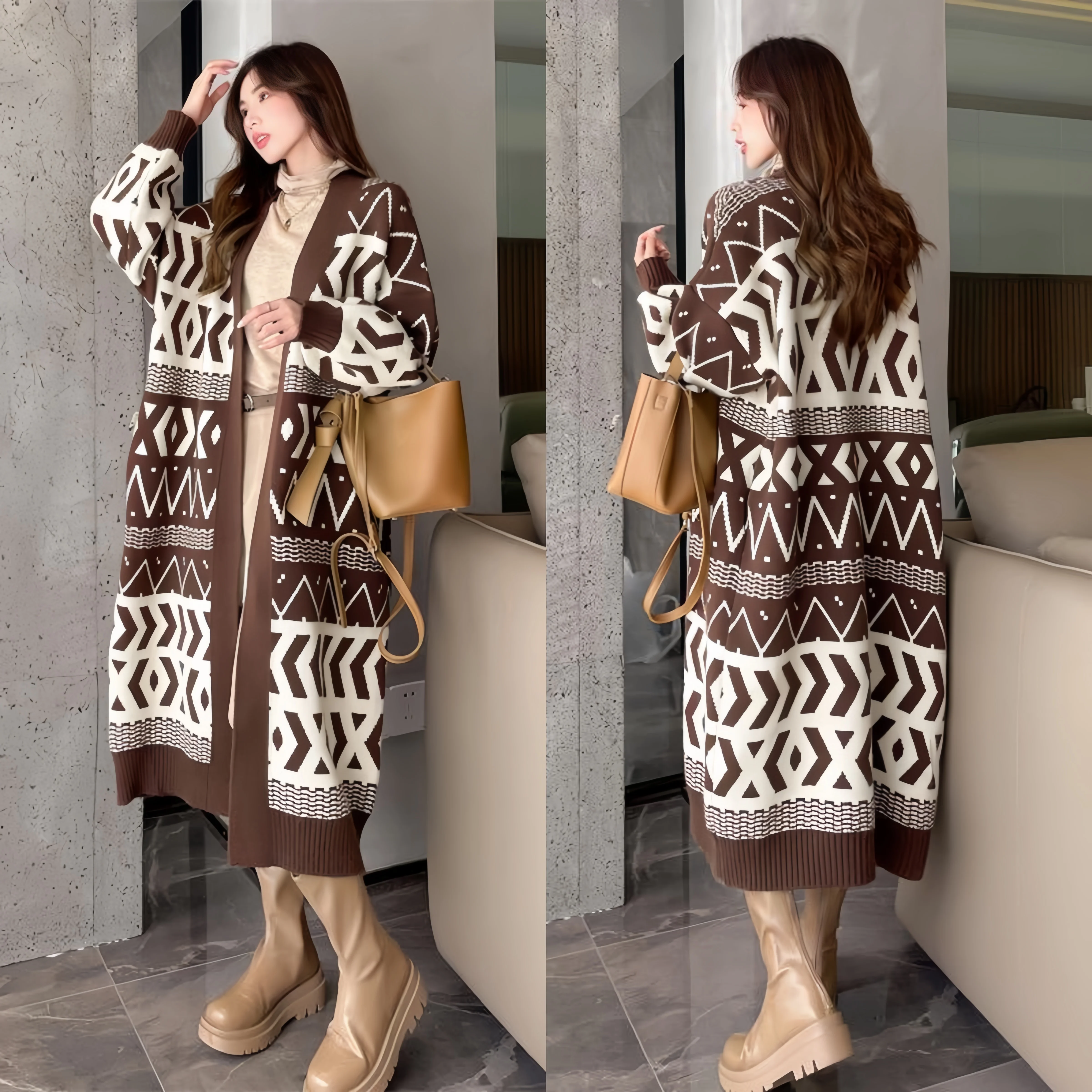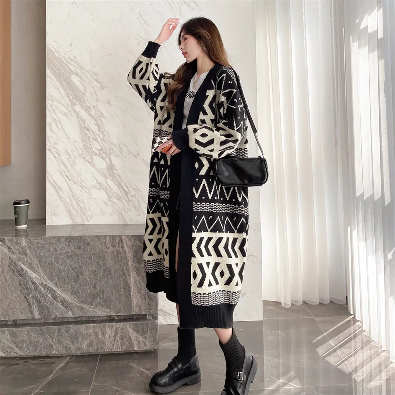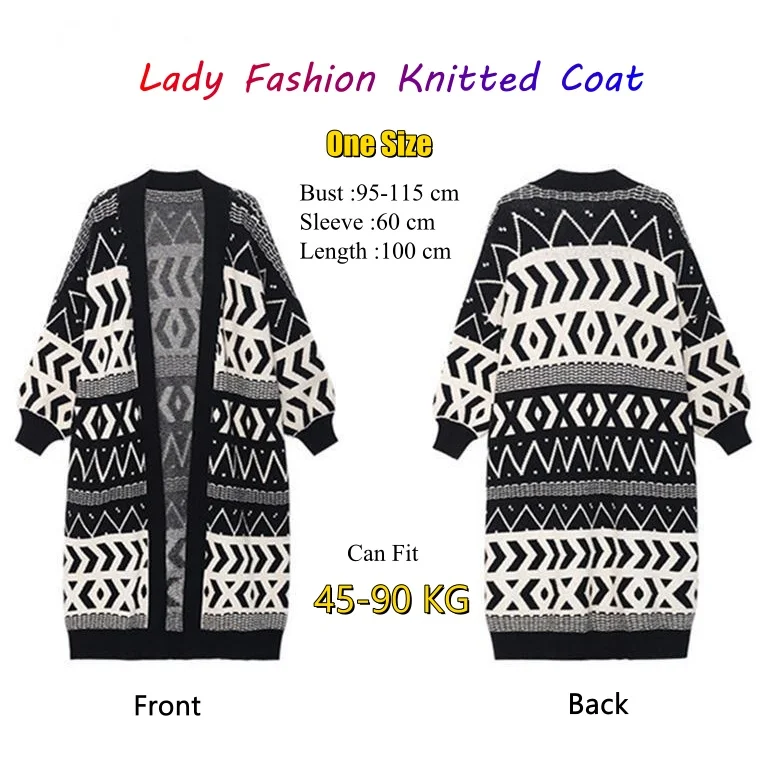 Autumn Winter Lady Knitted Coats Contrast Color Long Sleeve Windproof Top Loose Women Elegant Long Cardigan Coat