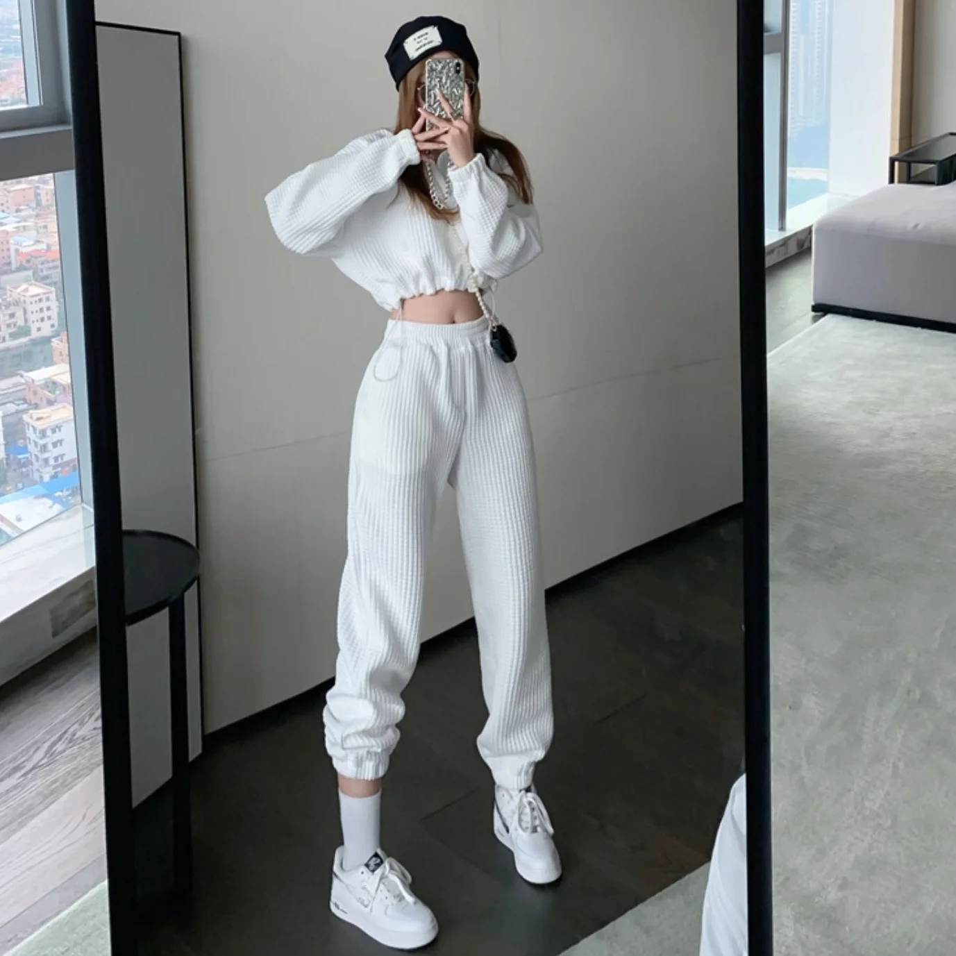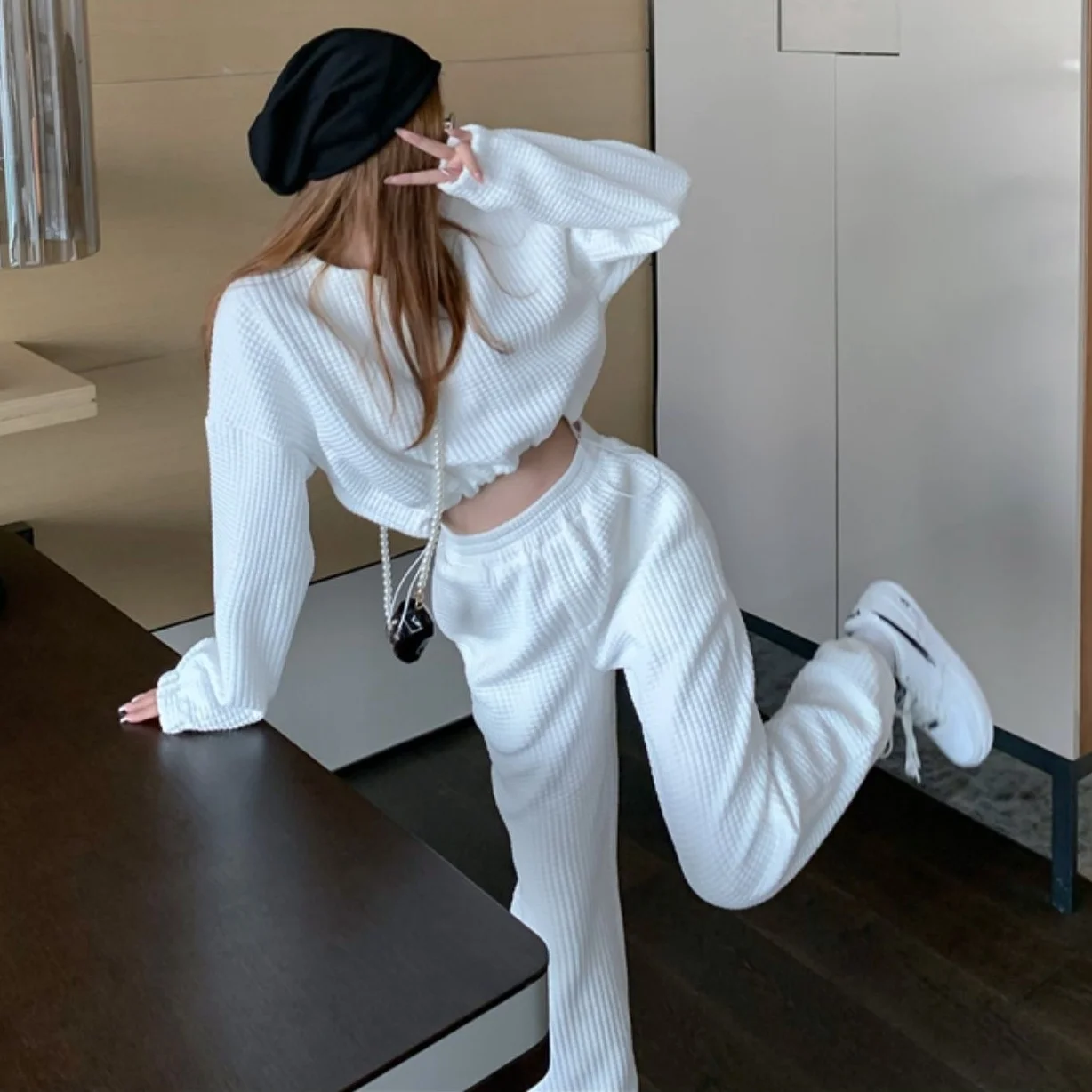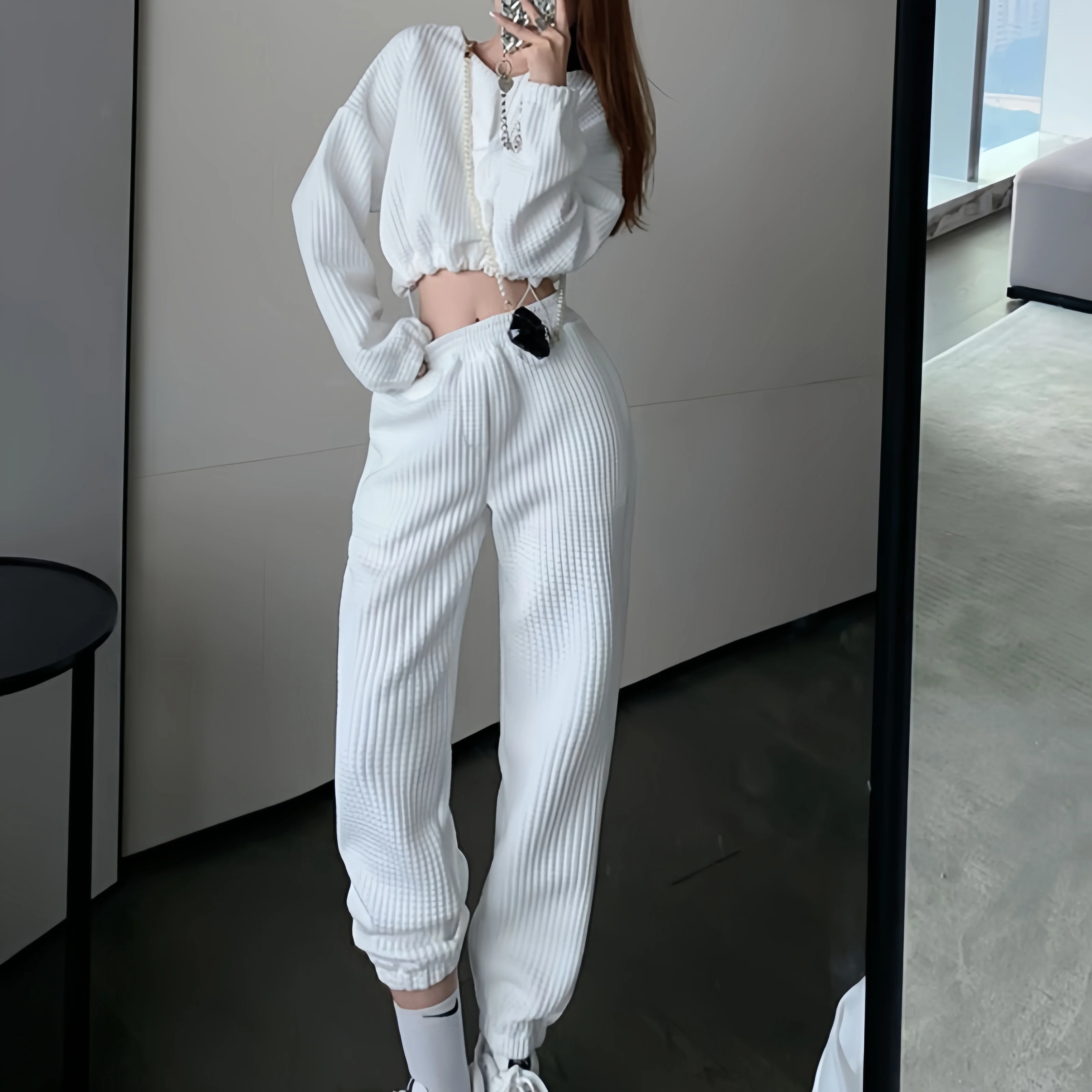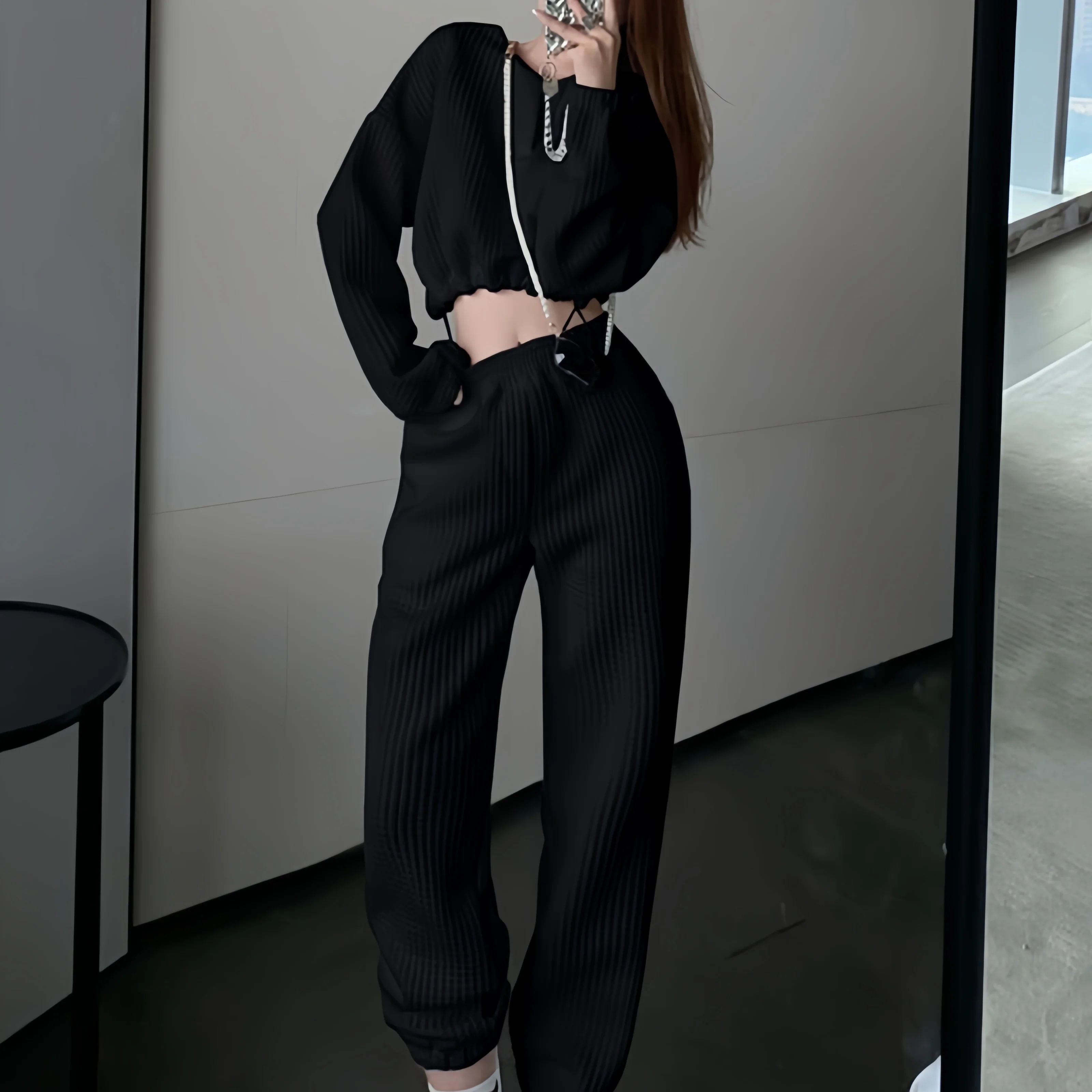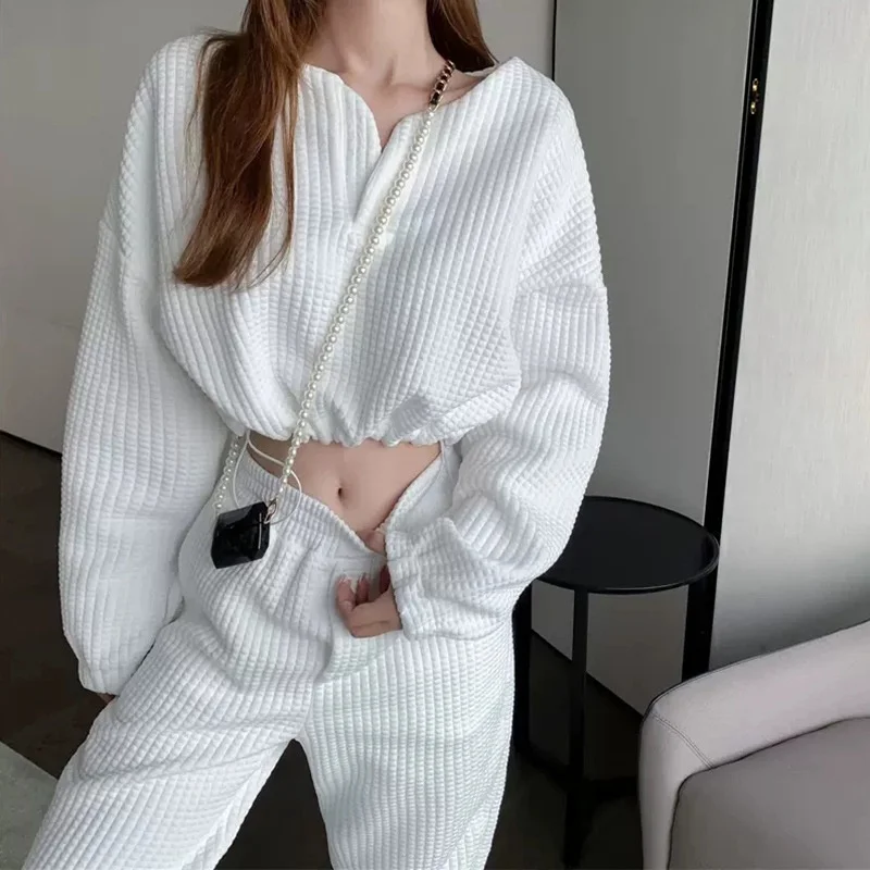 Women Autumn Winter Solid Casual Set Long Sleeve O-neck Crop Top + High Waist Long Pencil Pants Suit