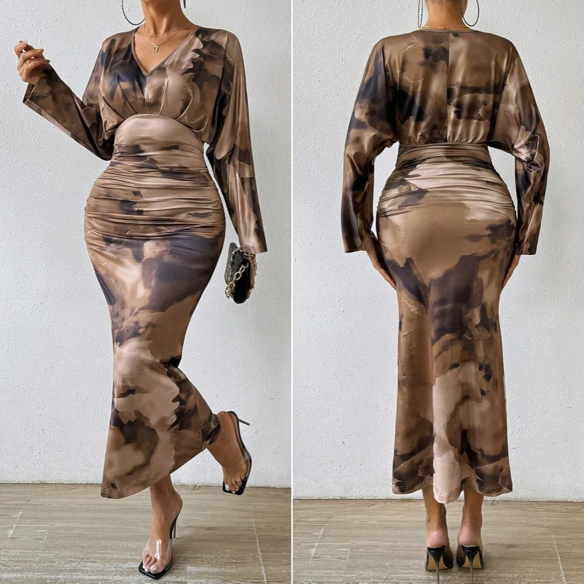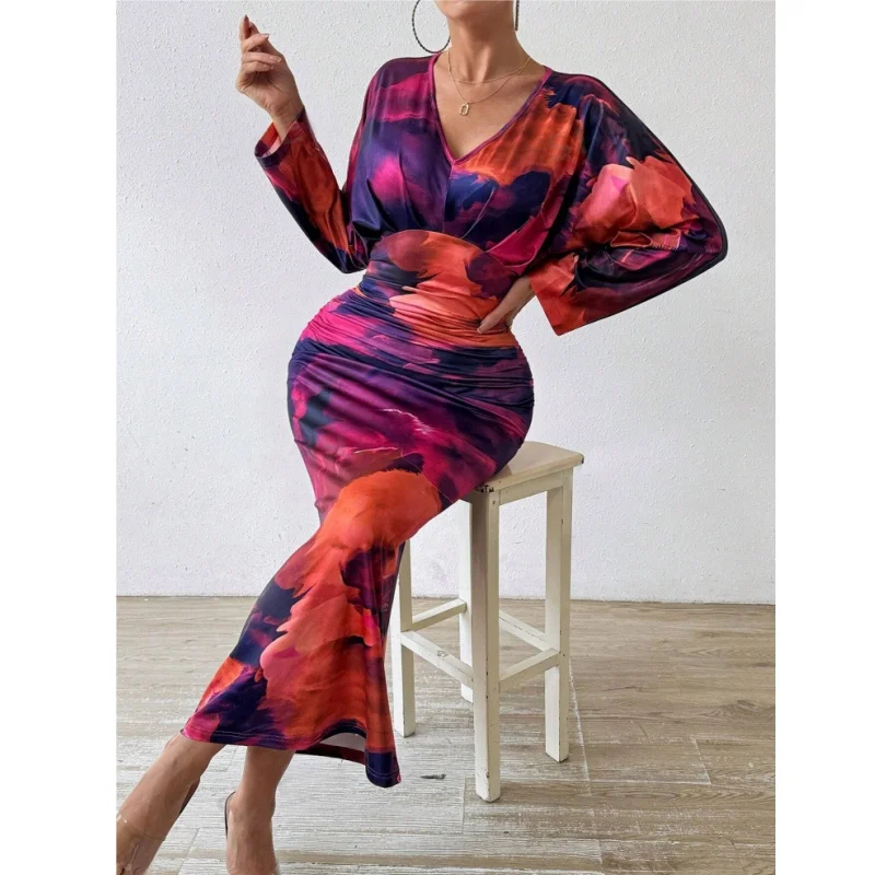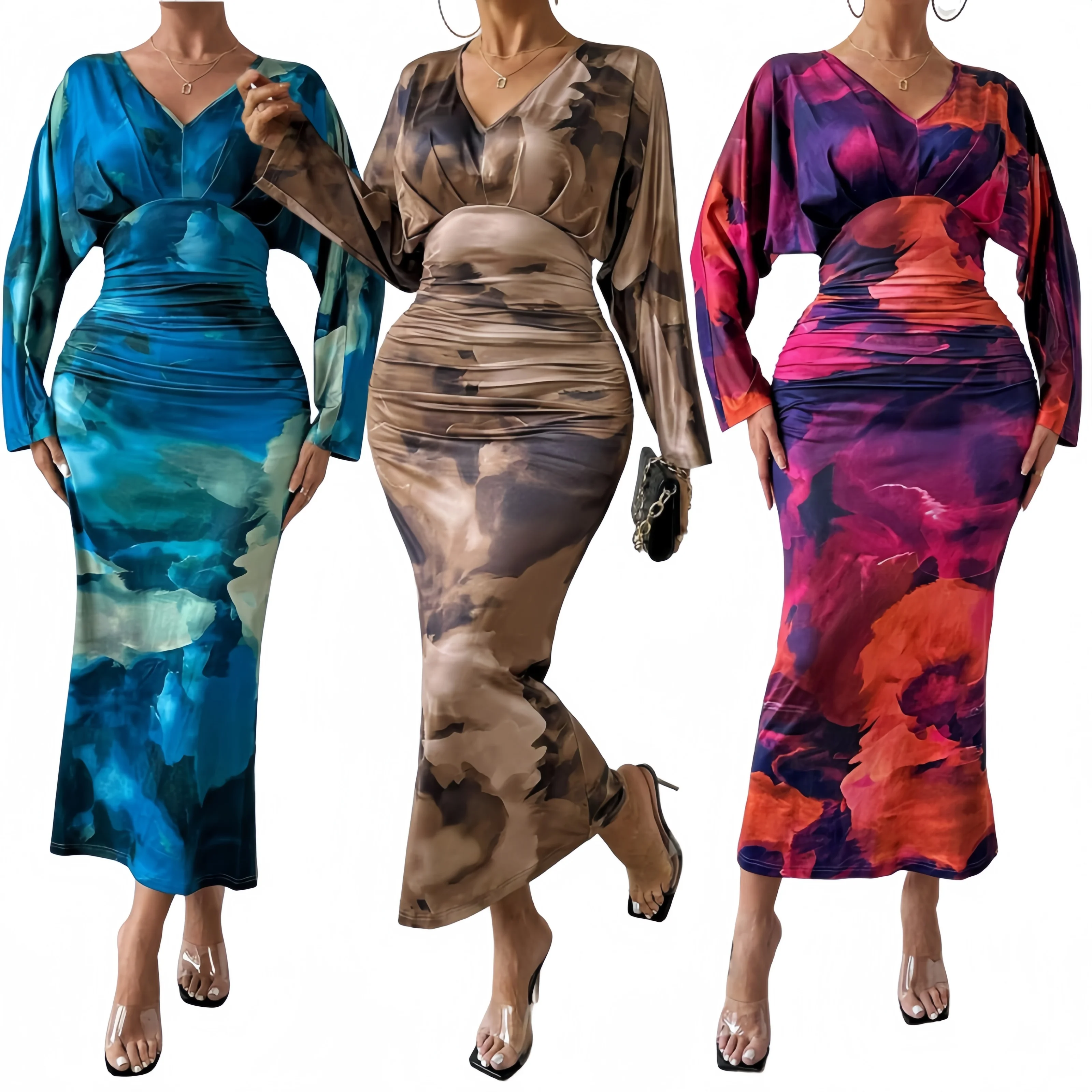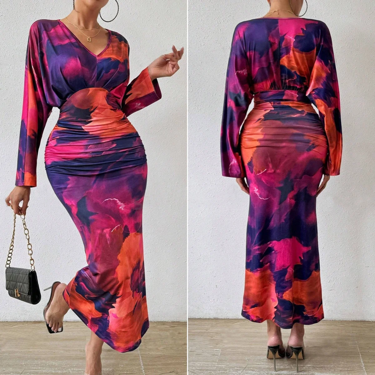 Spring Autumn Women Print Maxi Dress Long Sleeve V-neck High Waist Lady Elegant Ruched Party Dress