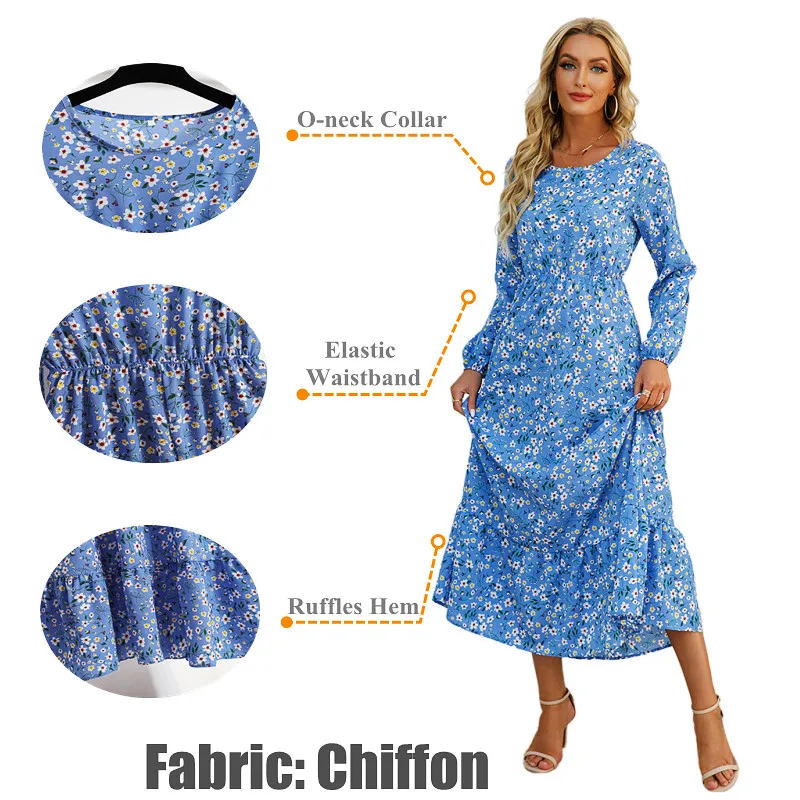 Elegant Floral Print Women Dress Spring Summer Casual O Neck Long Sleeve Chiffon a Line Long Maxi Dress Party Vestidos