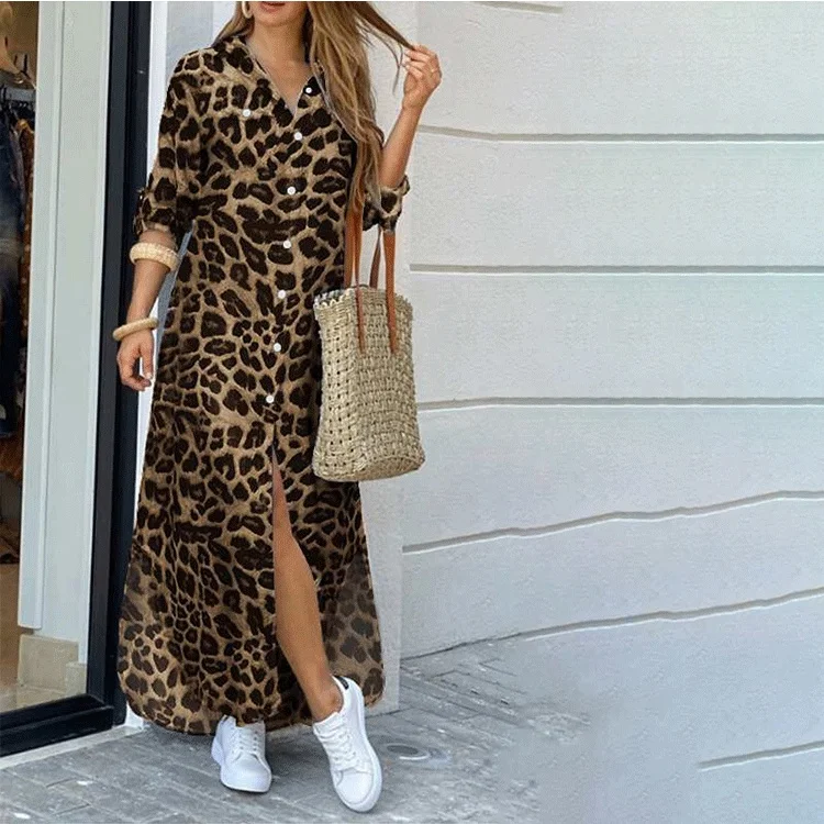 New Women Autumn Spring Shirt Dress Long Sleeve Single Breasted Long Dress Fashion Print Lady Casual Plus Size Dress