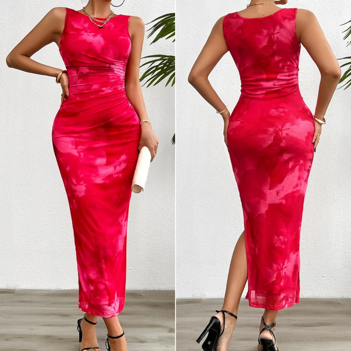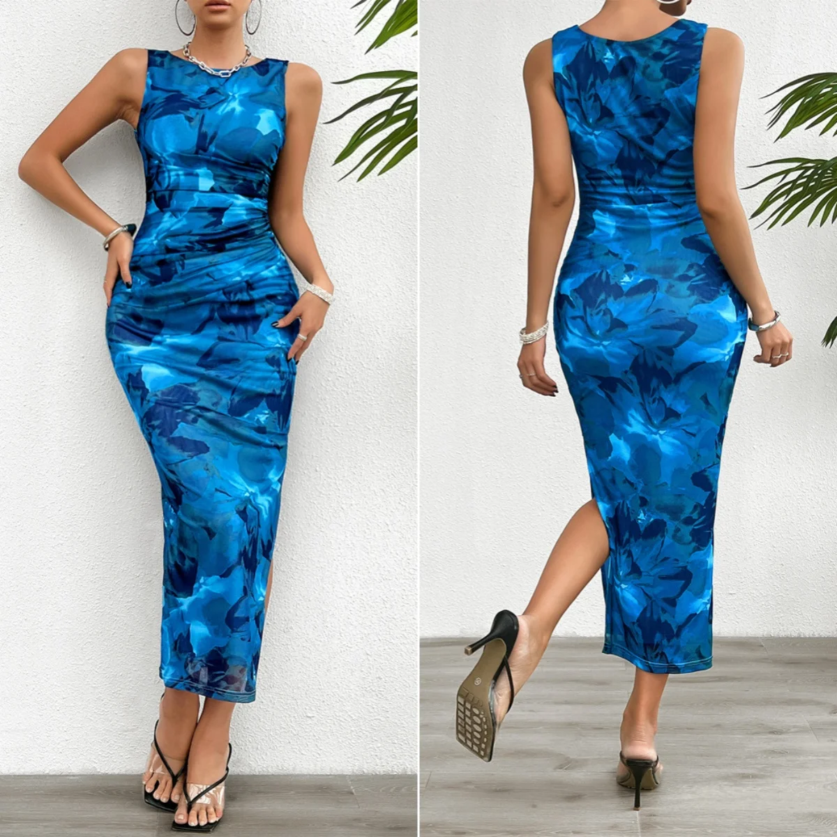 Women Summer Elegant Pencil Dress Sleeveless O-neck Slit Club Party Wear Lady Slim Print Maxi Dresses