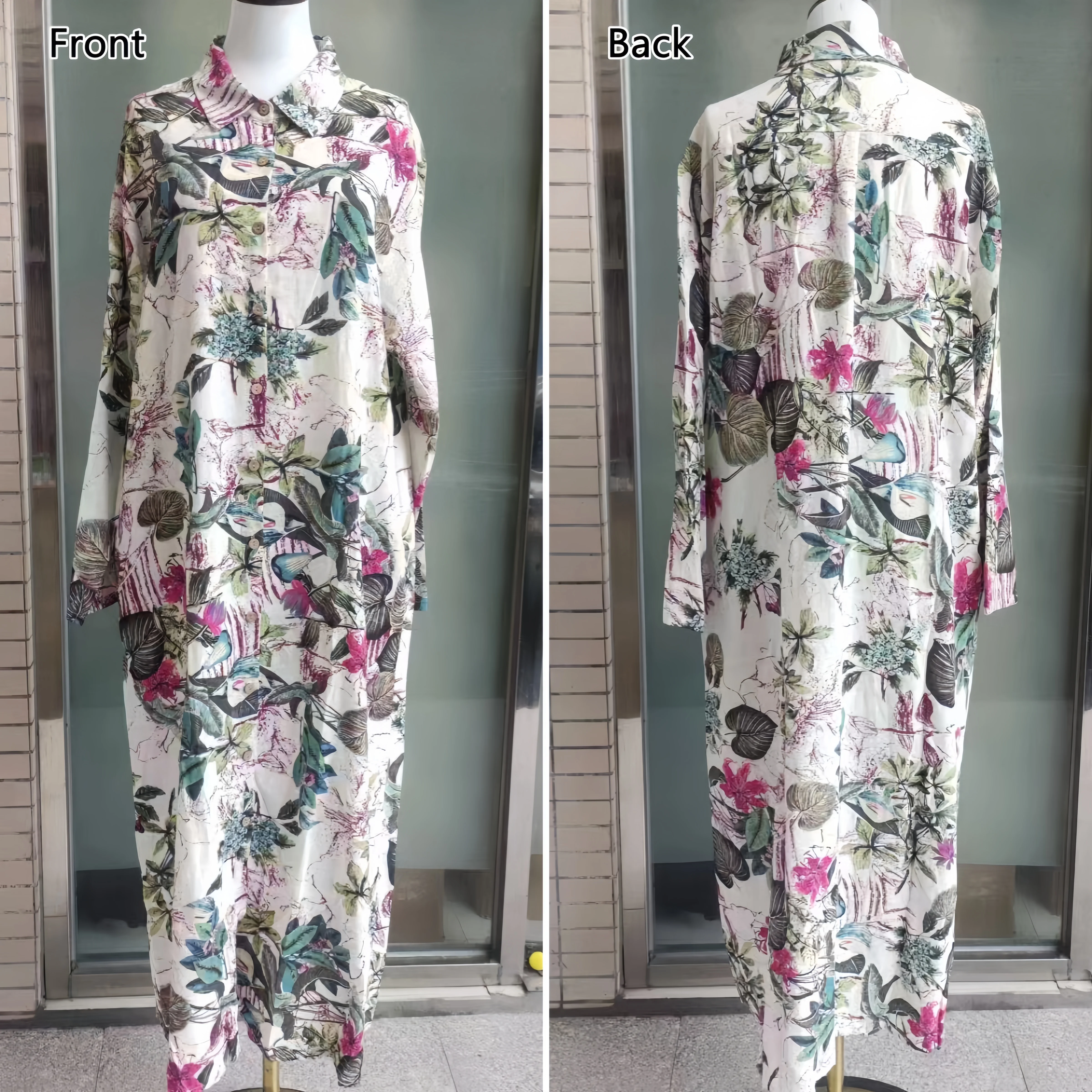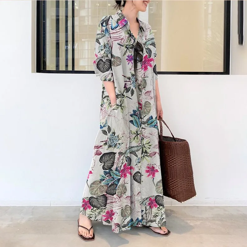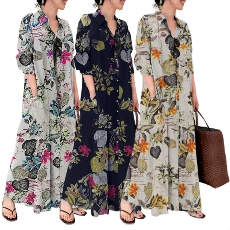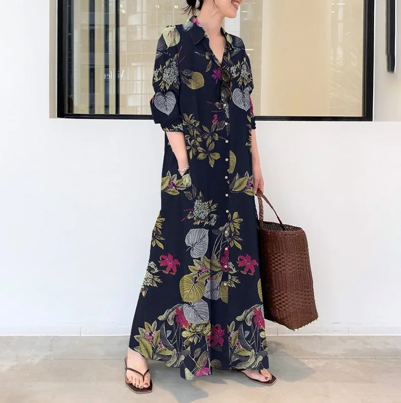 Fashion Women Dress Turn-down Collar Print Pocketed Muslim Dress Loose Long Sleeves Mid East Lady Casual Dresses