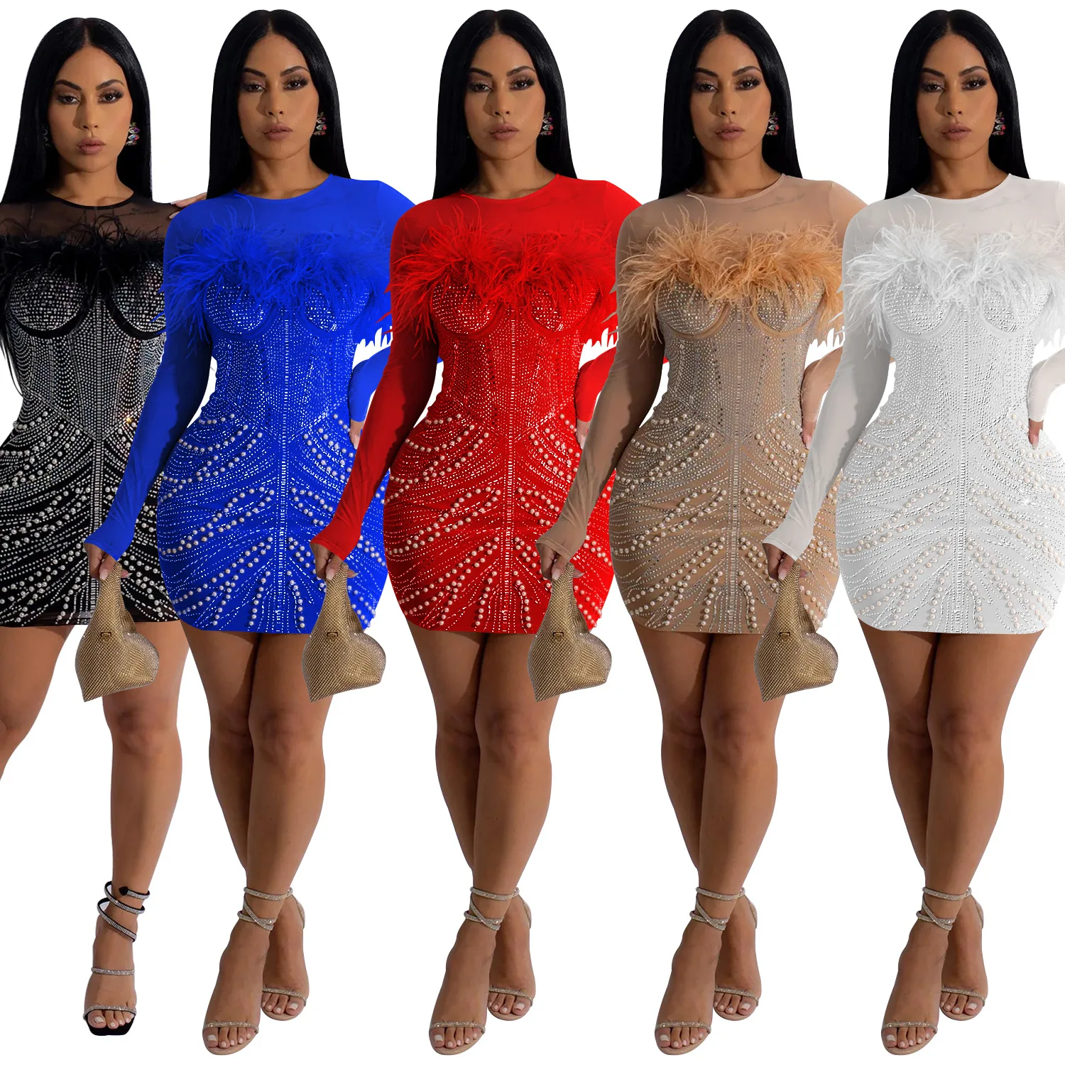 Luxury Rhinestone Pearl Women Dress Long Sleeve O-neck Elegant Prom Dress Lady Night Club Mini Pencil Dresses