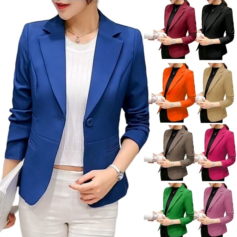 Women Solid Fashion Blazer Coat Turn Down Collar Pocketed Jacket Long Sleeve Autumn Spring Lady Slim Casual Coat