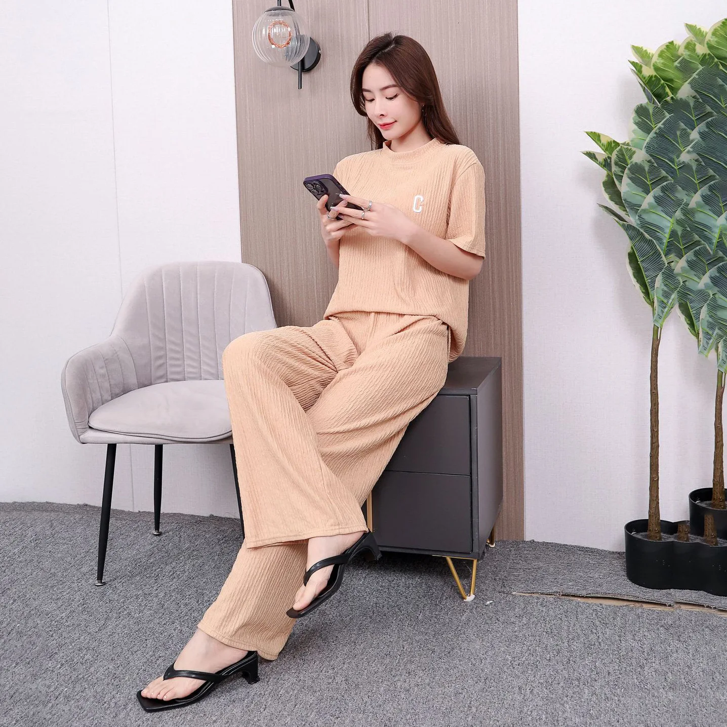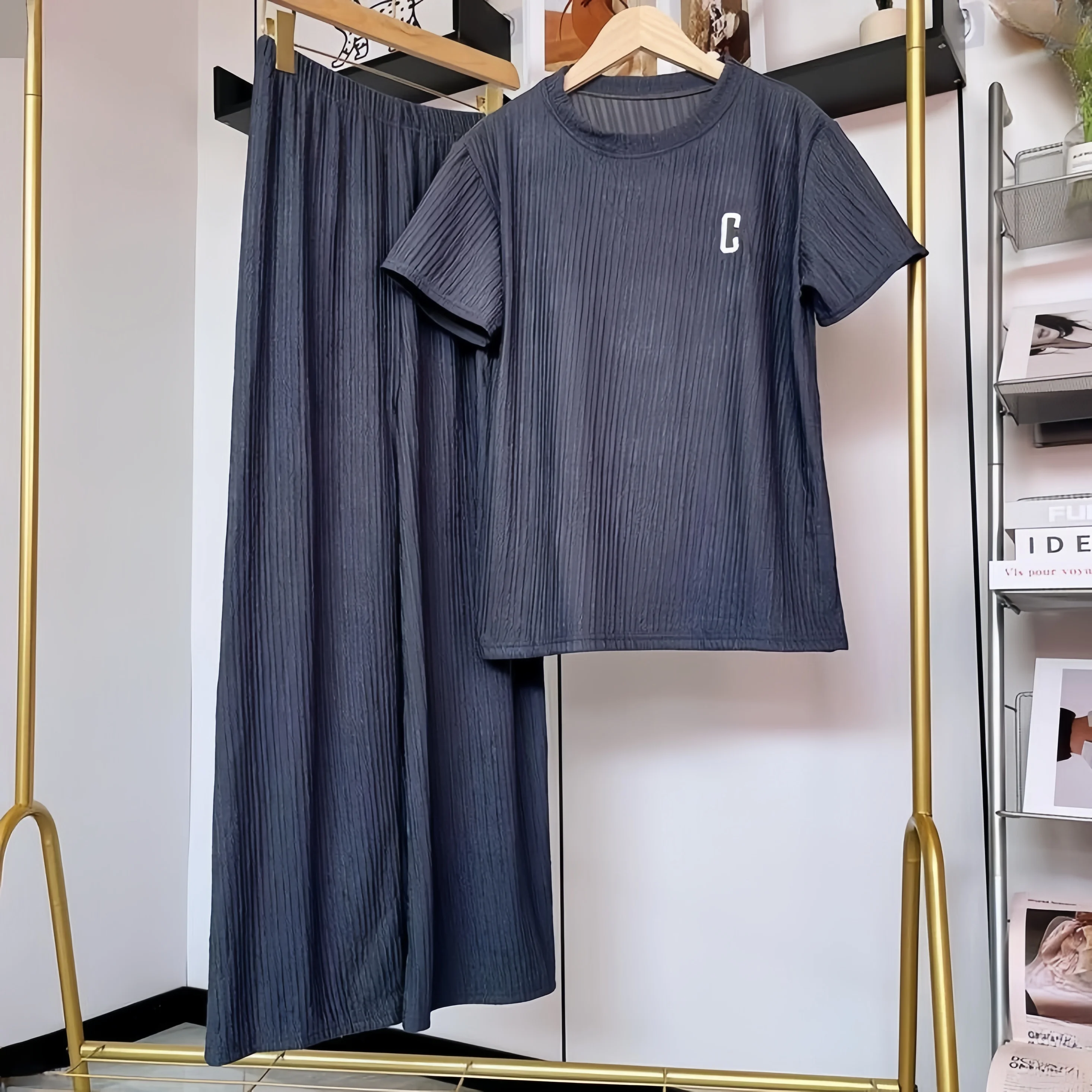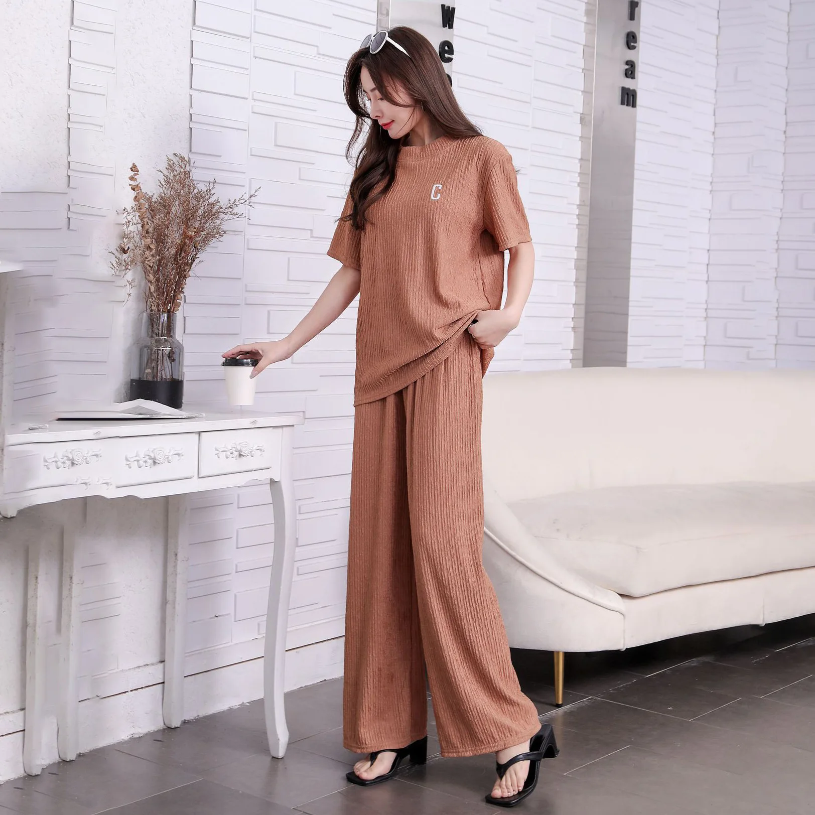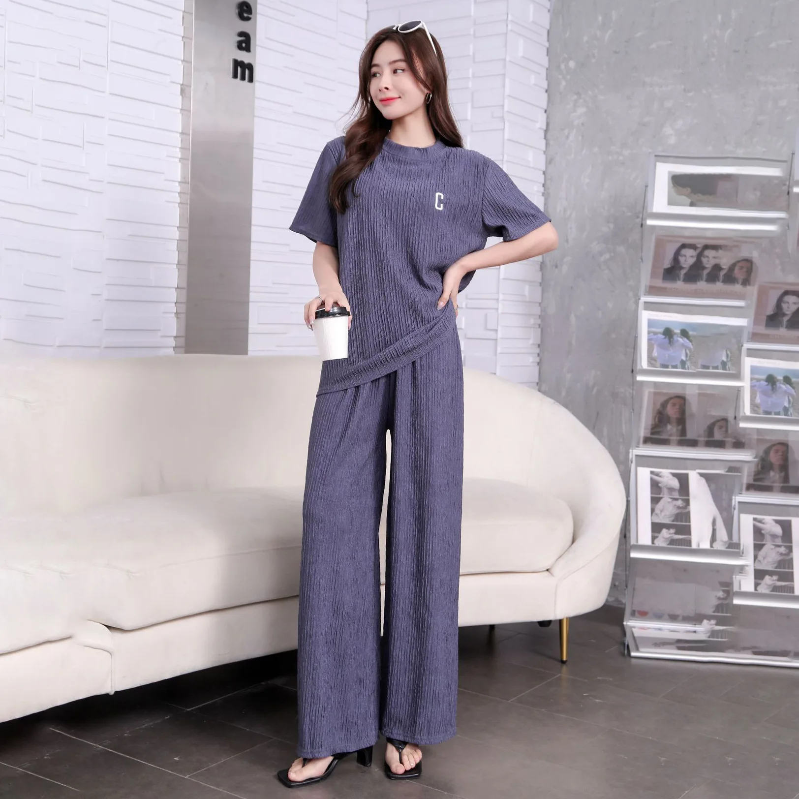 New Women Summer Loose Set Short Sleeve O-neck Top + Wide Leg Long Pants Suit New Lady Casual Two Piece Set
