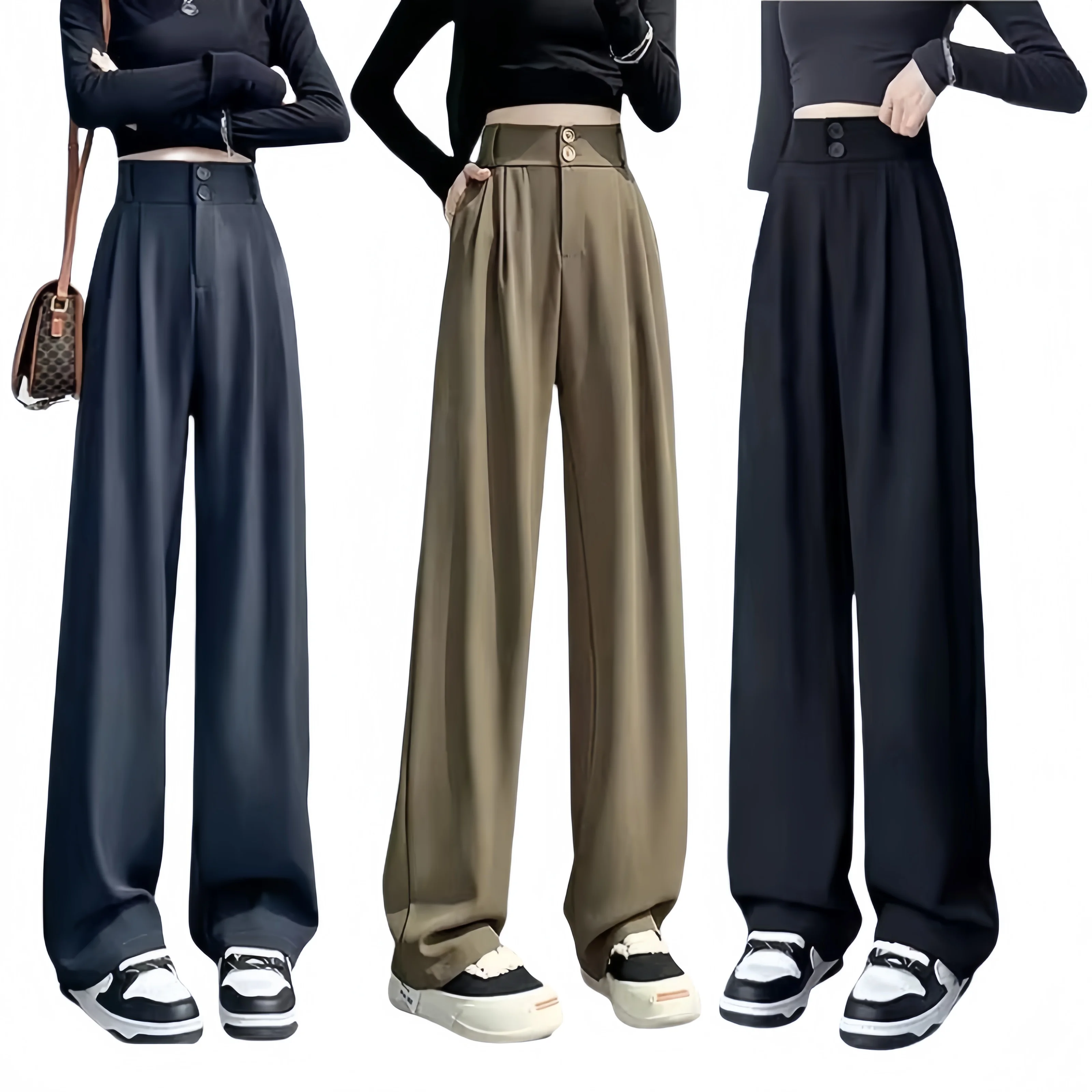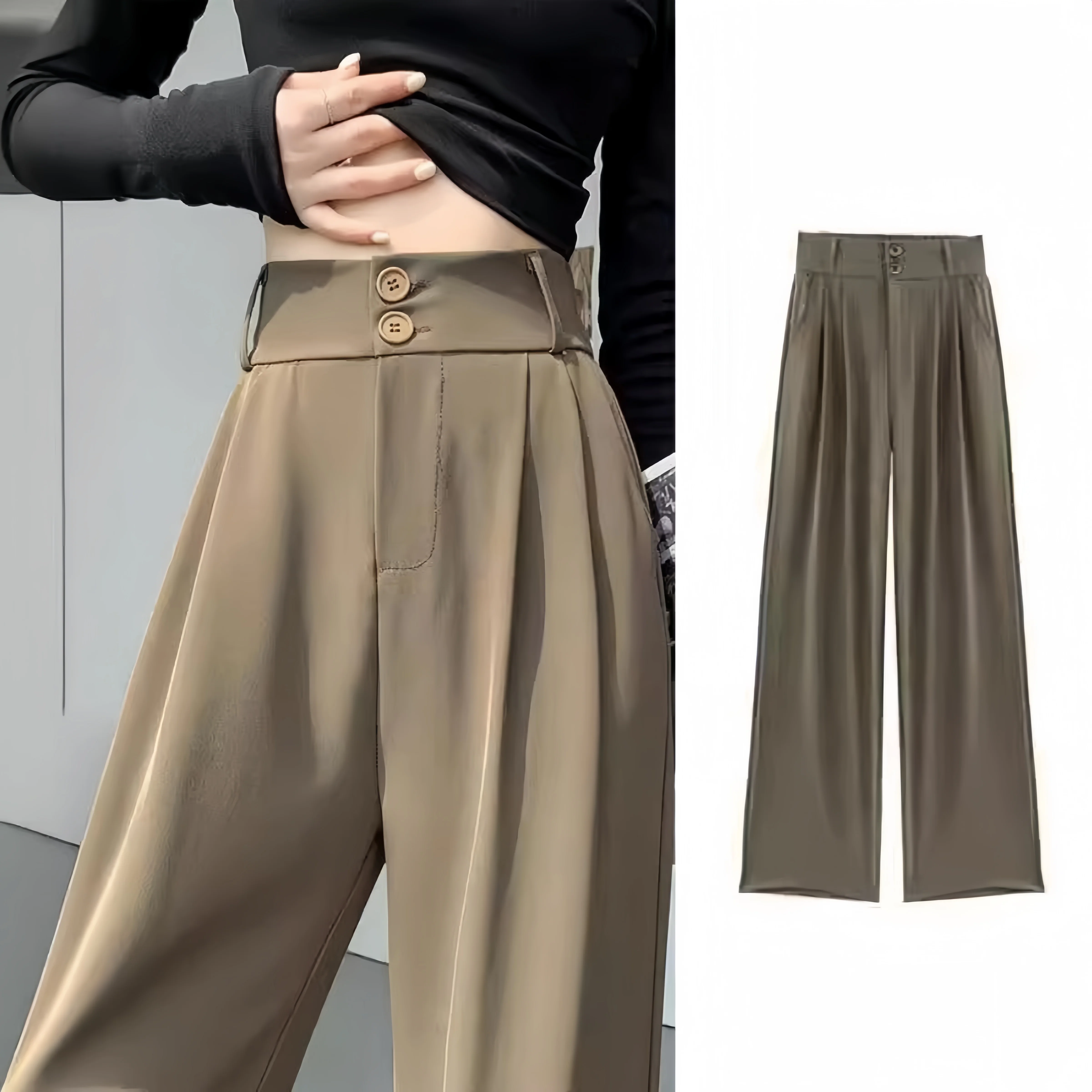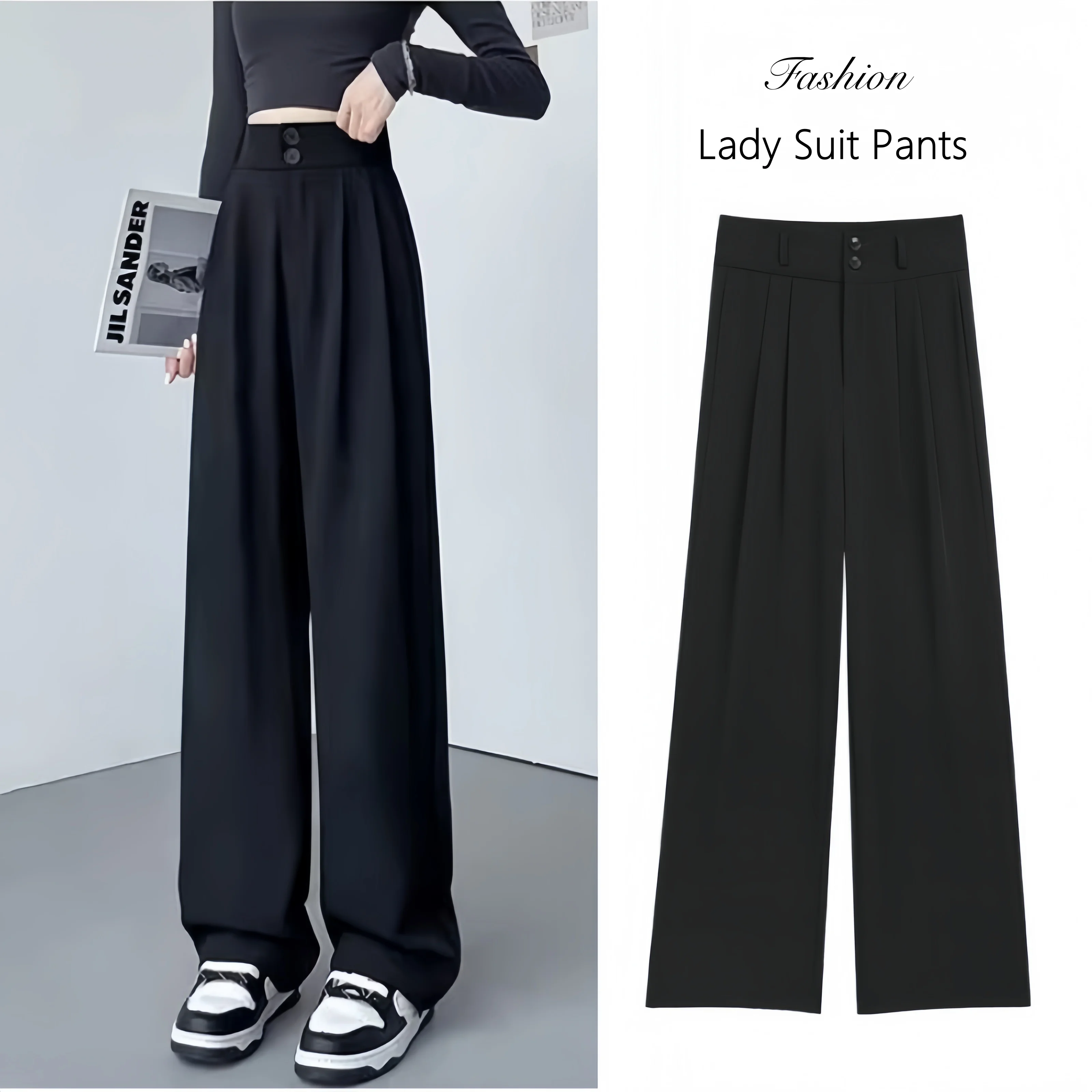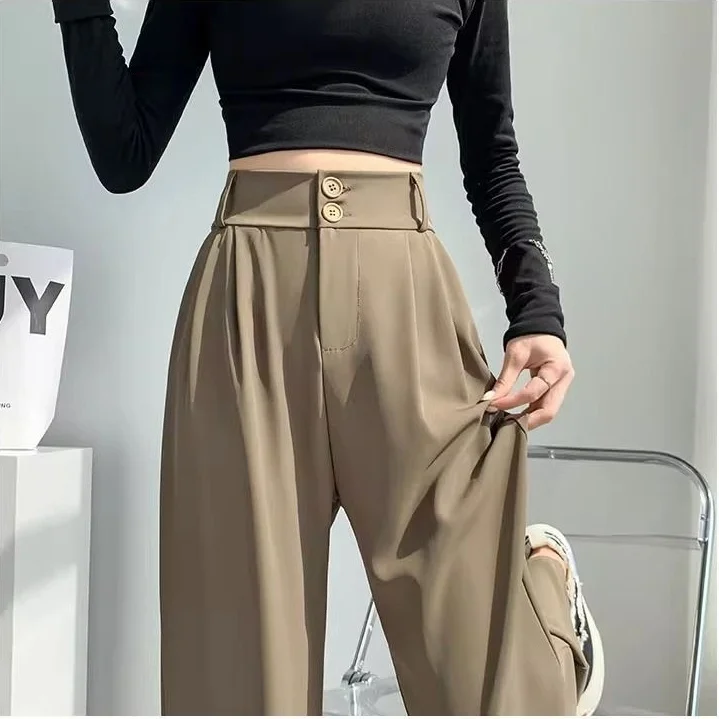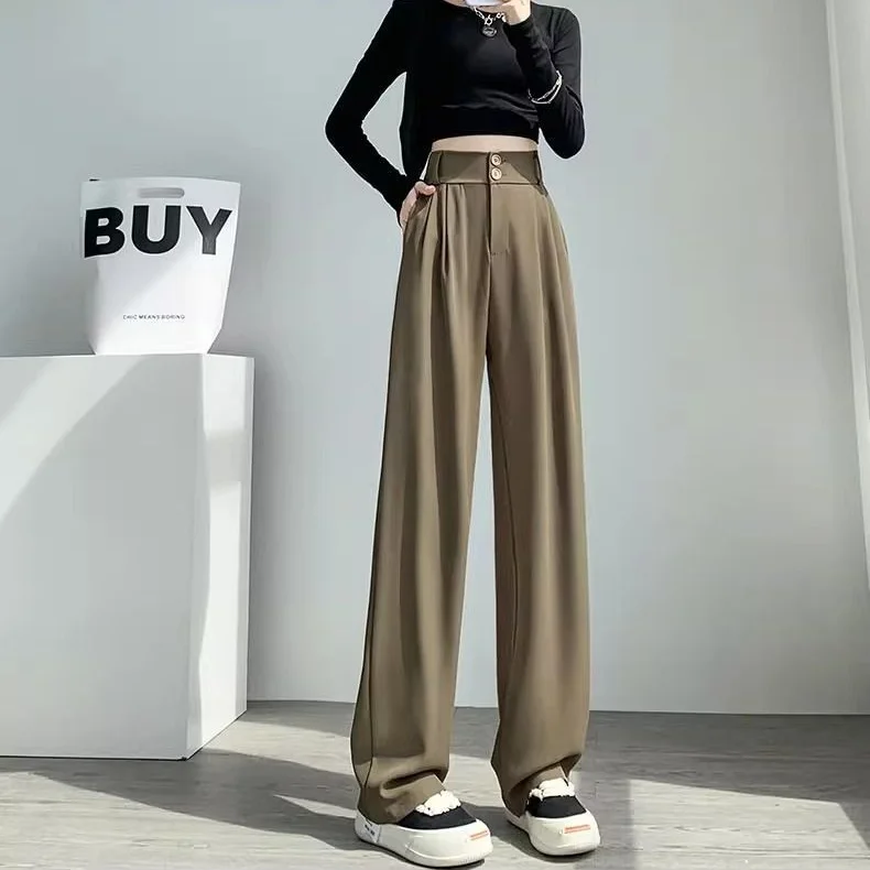 Double Button Women Long Formal Pants High Waist Pockets Pleated Trousers Summer Autumn Lady Fashion Loose Suit Pants
