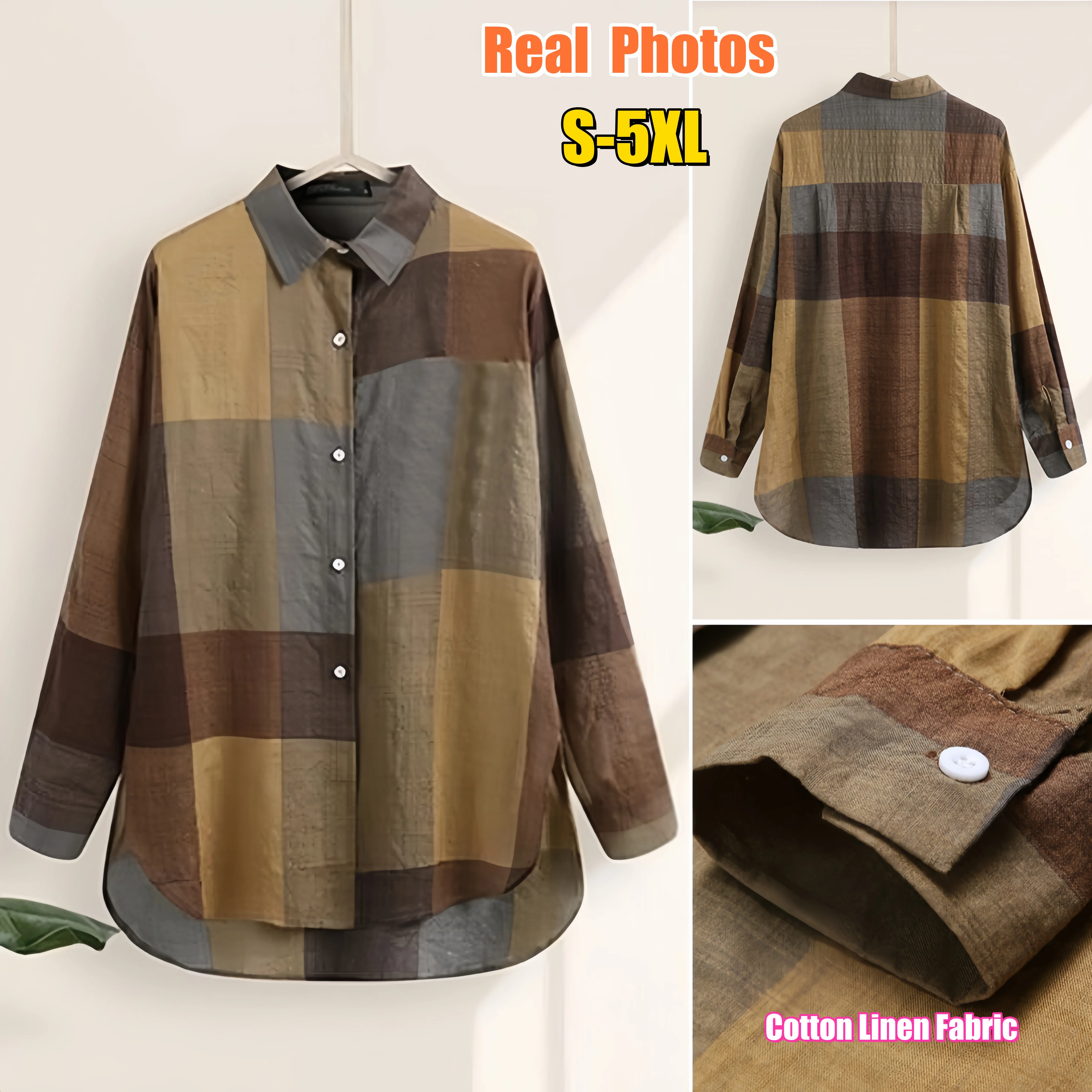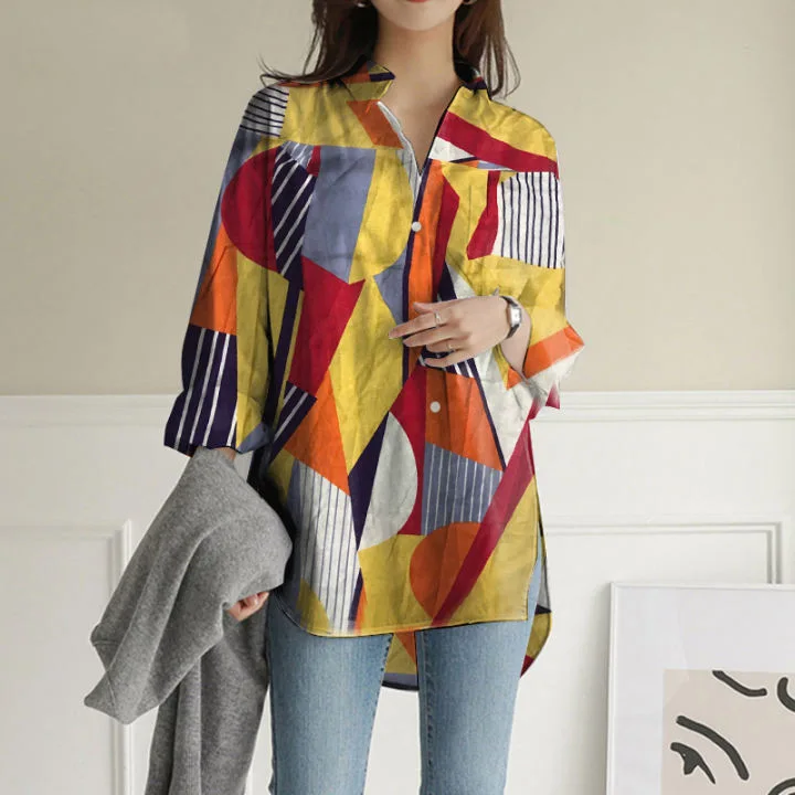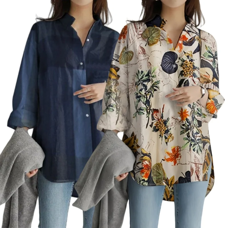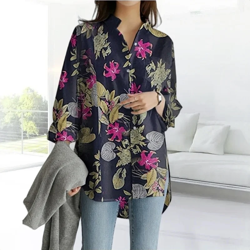 Women Fashion Print Cotton Linen Shirt Long Sleeve Lapel Collar Side Slit Blouse Spring Summer Lady Irregular Shirt Top