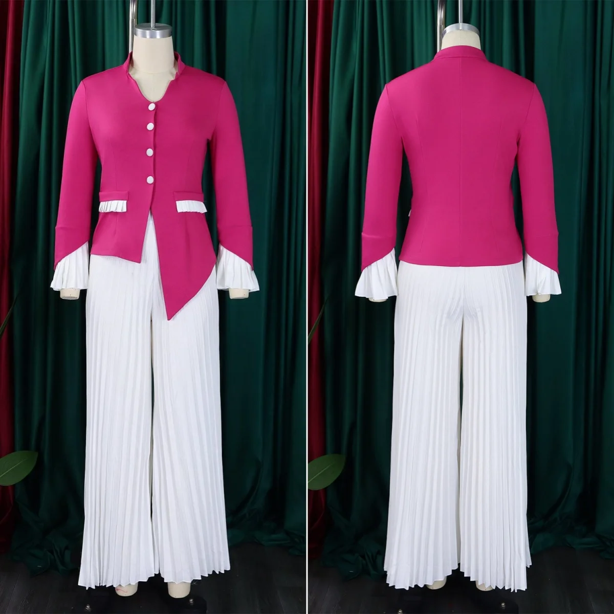 New Women Fashion Two Piece Set Stand Neck Long Flare Sleeve Top + Long Loose Pleated Pants Lady Spring Summer Elegant Suit
