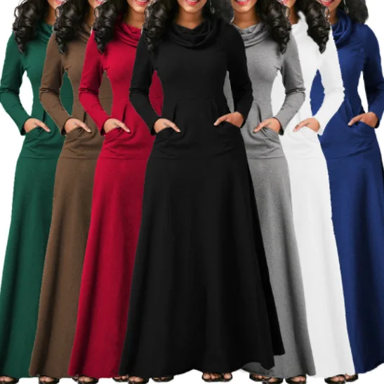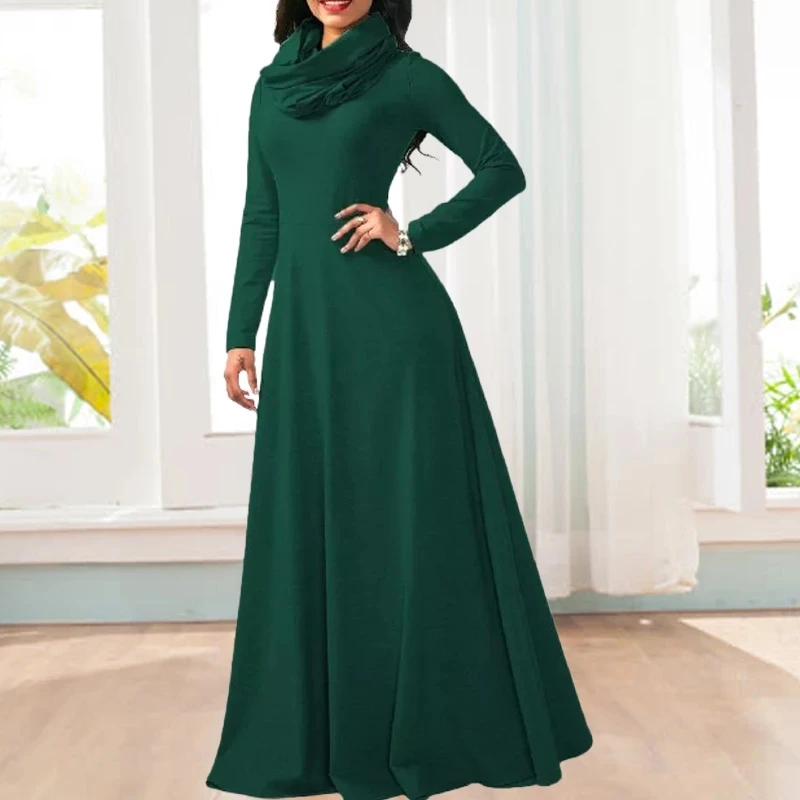 Scarf Collar Women Robe Dress A-line Front Pocket Casual Long Dress Vintage Muslim Female Plus Size Maxi Dress